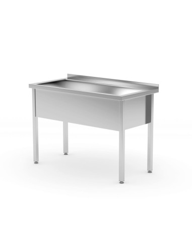 Tillverkad av rostfritt stål. Svetsad konstruktion som säkerställer hållbarhet och stabilitet. Prägling i botten av rännan - det så kallade "höljet" för att tömma vattnet helt. Standardprägling i botten för sifonen: Ø50 mm. Hål för kran: Ø30 mm. Med frontkåpa. Ben tillverkade av 40x40 mm profiler. Ungefärlig tillåten belastning på bänkskivan: 70 kg/m². Stänkskydd 40 mm högt för att skydda väggen mot fläckar. Bakre ben flyttade 100 mm från väggen för att underlätta vägginstallation. Benhöjd: 160 mm. Justerbara fötter i intervallet: +25/-5 mm.