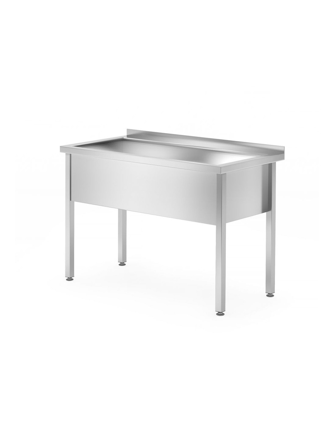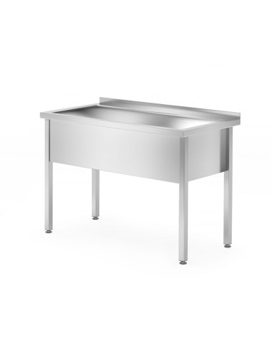 Tillverkad av rostfritt stål. Svetsad konstruktion som säkerställer hållbarhet och stabilitet. Prägling i botten av rännan - det så kallade "höljet" för att tömma vattnet helt. Standardprägling i botten för sifonen: Ø50 mm. Hål för kran: Ø30 mm. Med frontkåpa. Ben tillverkade av 40x40 mm profiler. Ungefärlig tillåten belastning på bänkskivan: 70 kg/m². Stänkskydd 40 mm högt för att skydda väggen mot fläckar. Bakre ben flyttade 100 mm från väggen för att underlätta vägginstallation. Benhöjd: 160 mm. Justerbara fötter i intervallet: +25/-5 mm.