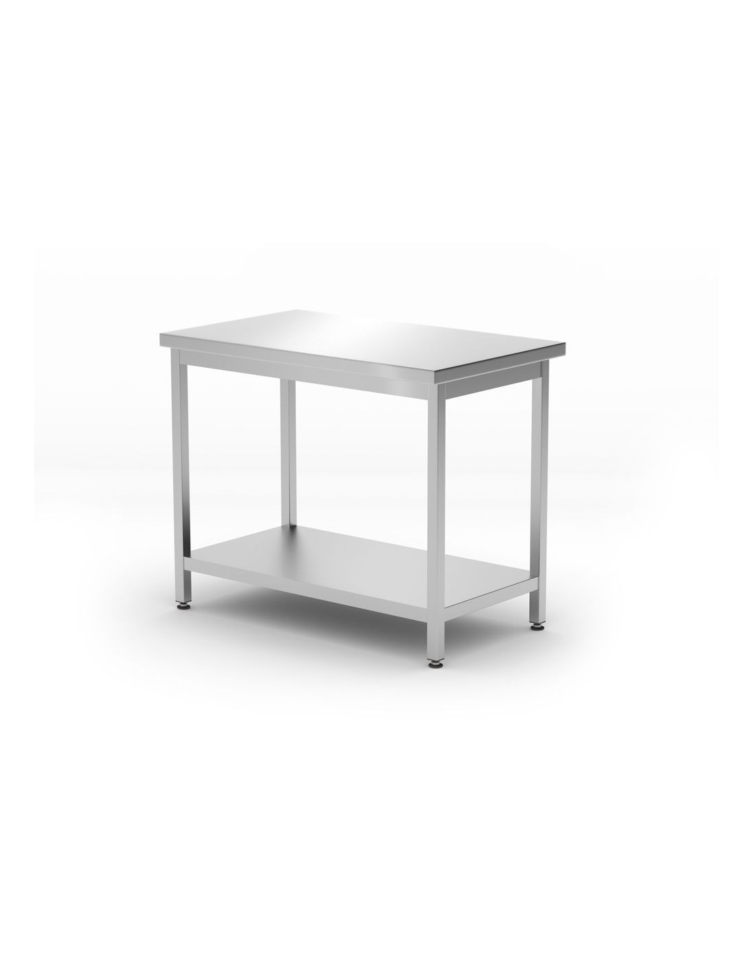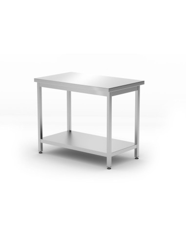 Bultad konstruktion för självmontering, vilket möjliggör enkel transport och förvaring. Tillverkad av rostfritt stål. Bänkskivan är förstärkt med en längsgående profil i botten. Maximal belastning på bänkskivan: ca 70 kg/m². Stänkskydd 40 mm högt för att skydda väggen mot fläckar. Ben tillverkade av 40x40 mm profiler. Justerbara fötter i intervallet: +25/-5 mm.