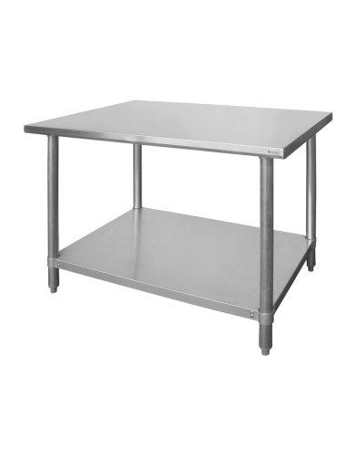 HENDI Central arbetsbord har en robust bänkskiva i rostfritt stål och hyllplan, förstärkt med en aluminiumkrage och starka ben, vilket garanterar stabilitet och långvarig prestanda. De höjdjusterbara benen ger flexibilitet för att passa olika arbetsmiljöer, medan den 130 kg breda lastkapaciteten för både bordsskivan och hyllplanet ger pålitligt stöd för tunga uppgifter.