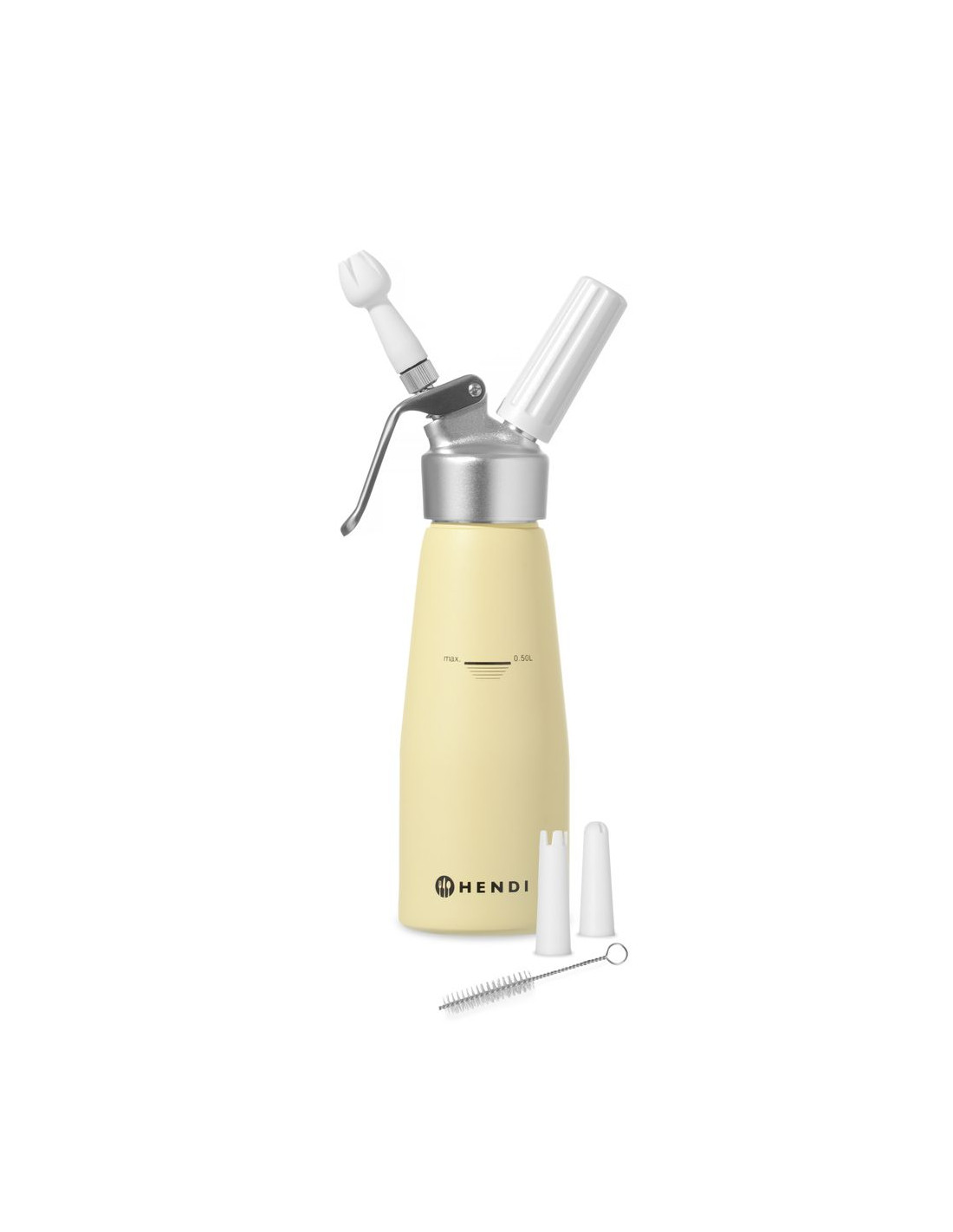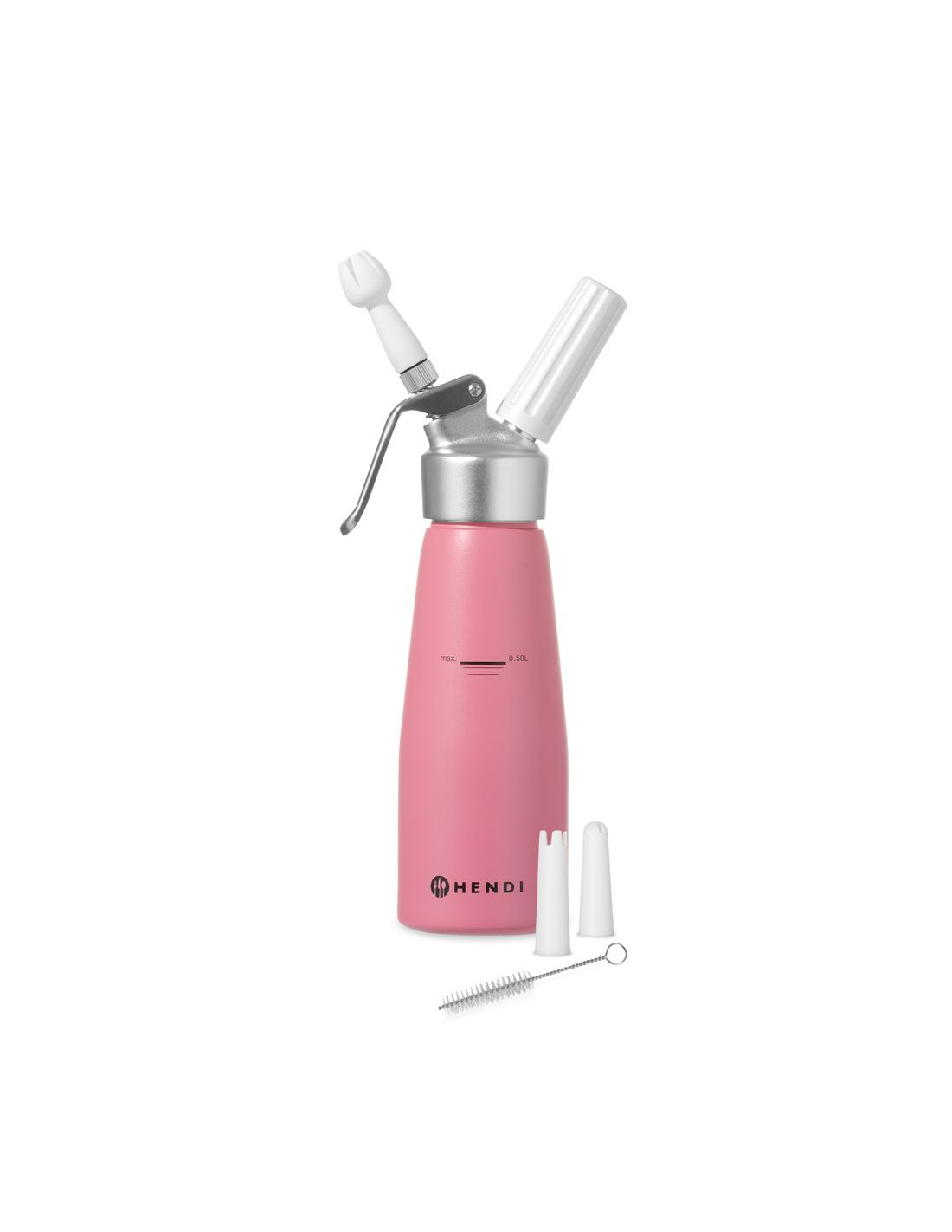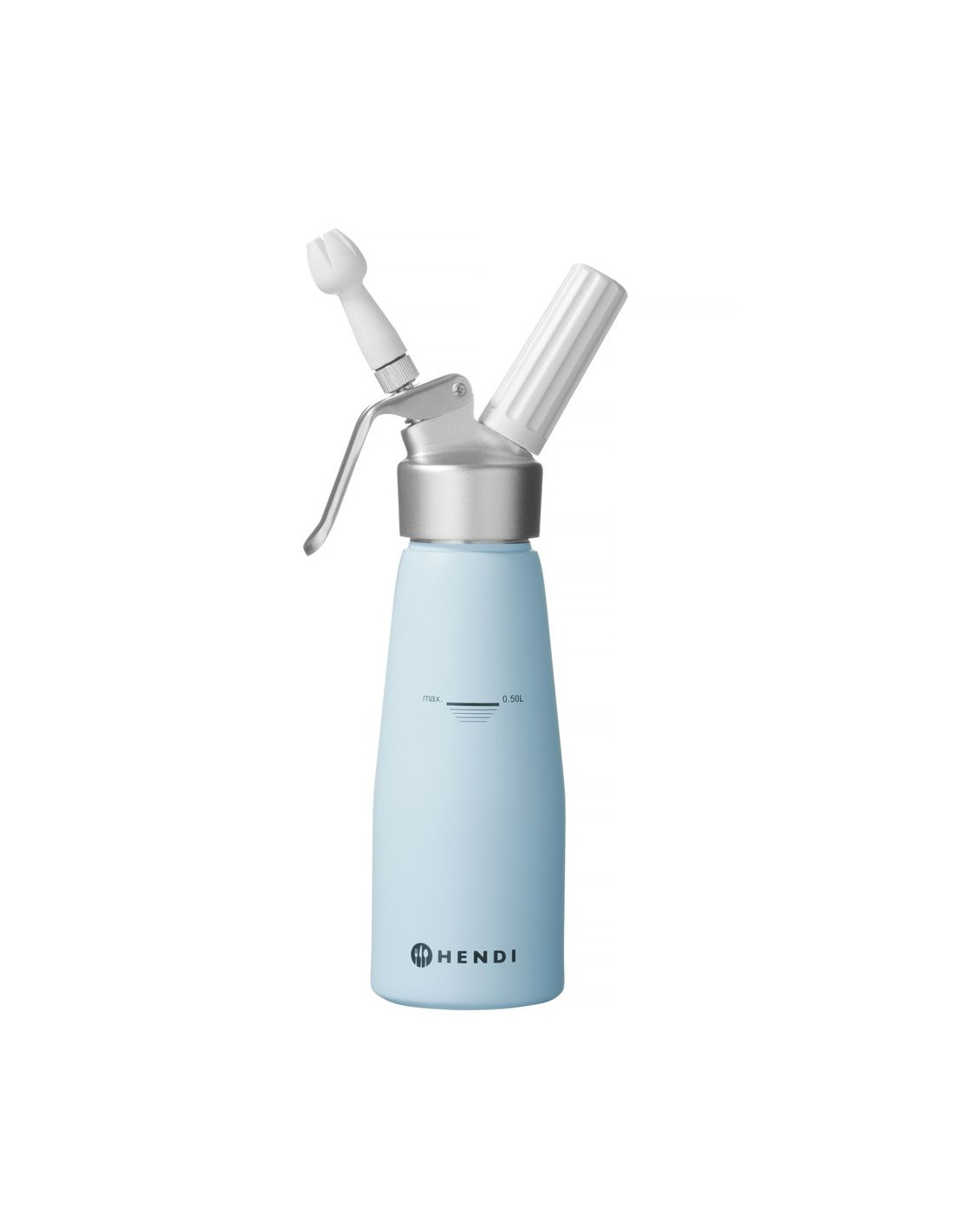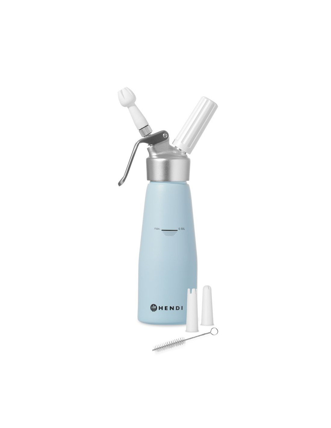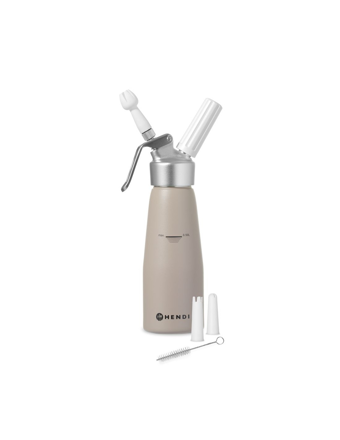 Helt tillverkad av aluminium. Set med 3 munstycken av polypropen samt rengöringsborste. Ej lämplig för starka såser. Kräver gräddeladdare (N₂O) för att fungera, ingår ej.