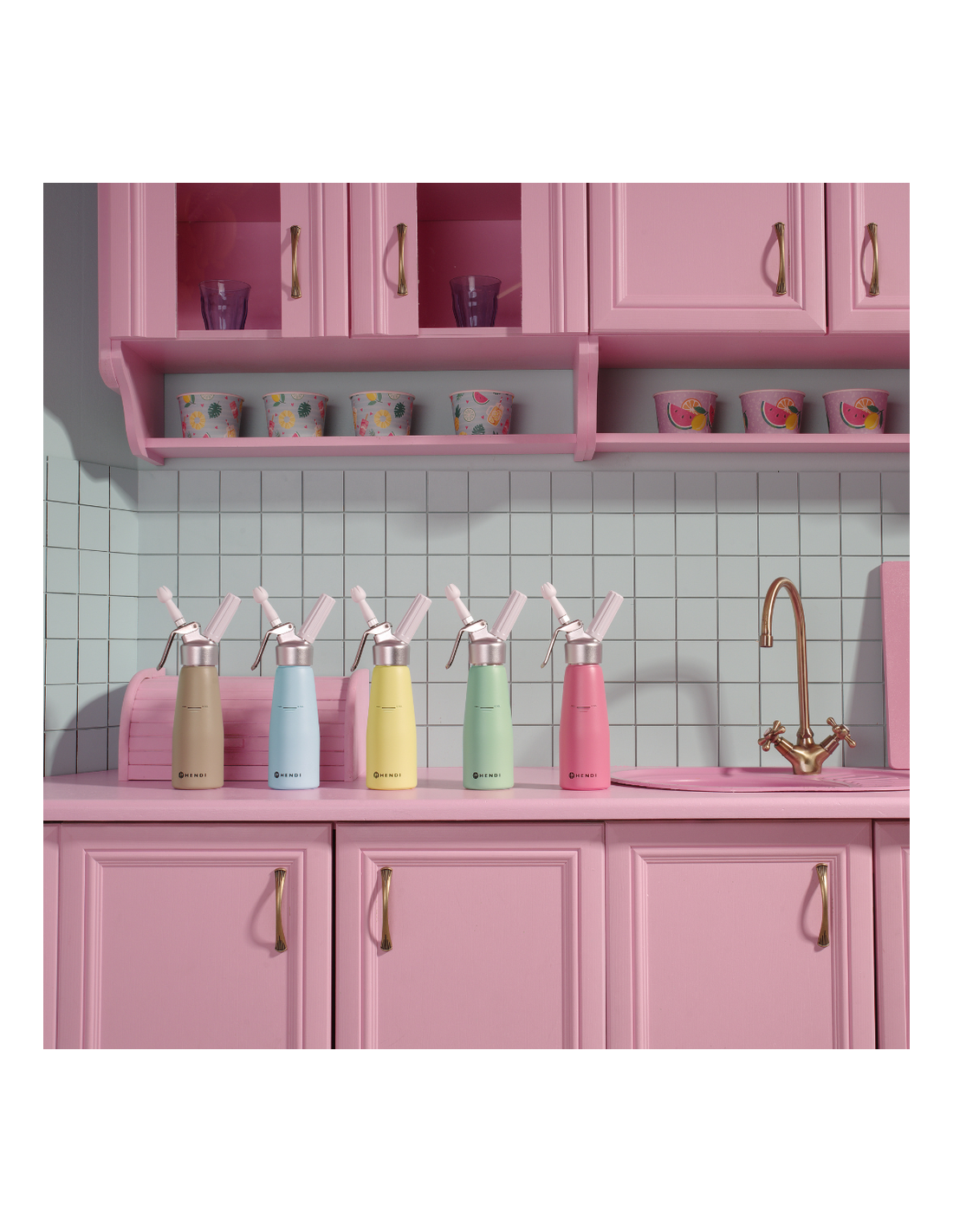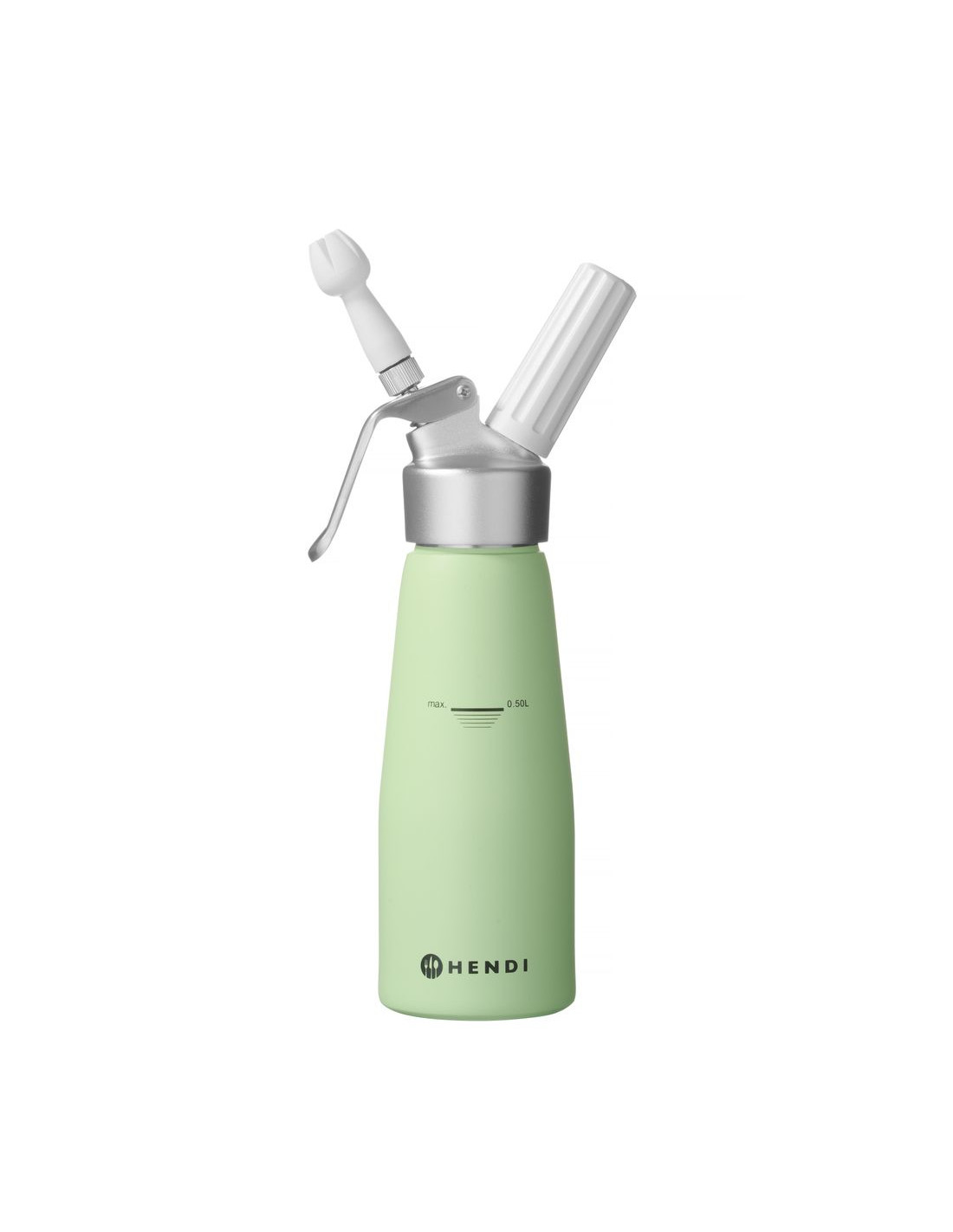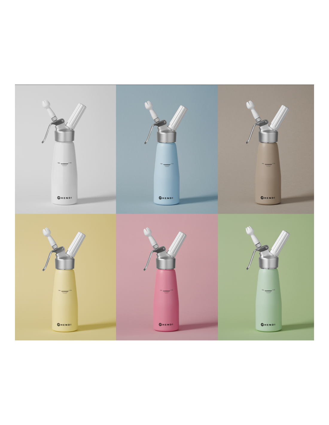 Helt tillverkad av aluminium. Set med 3 munstycken av polypropen samt rengöringsborste. Ej lämplig för starka såser. Kräver gräddeladdare (N₂O) för att fungera, ingår ej.