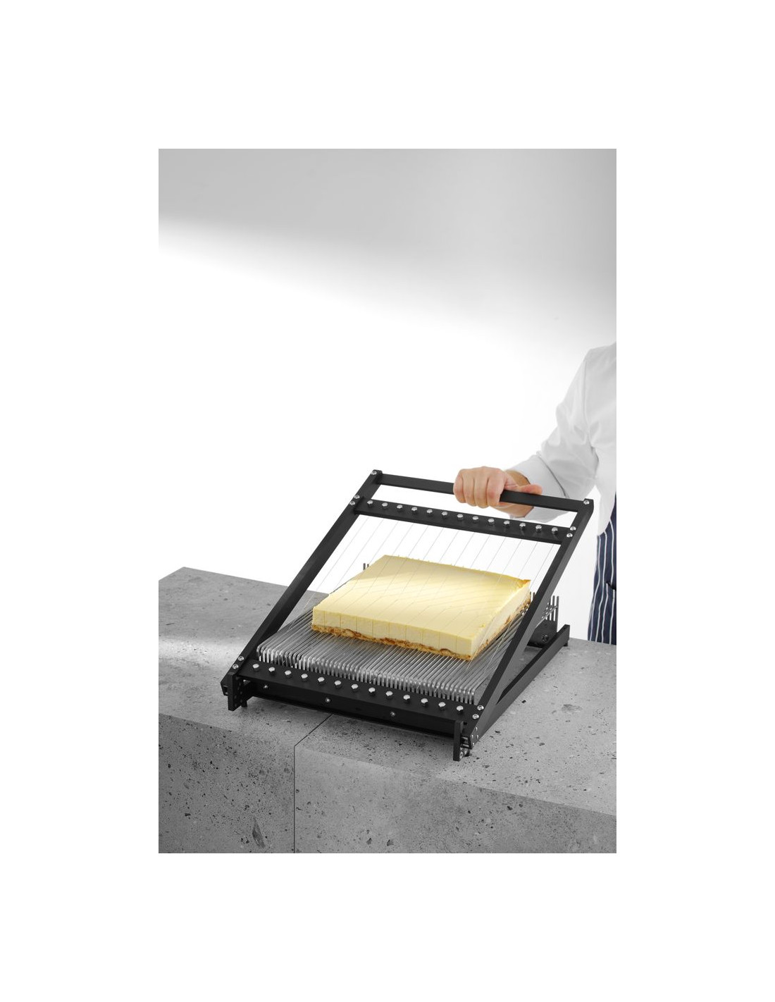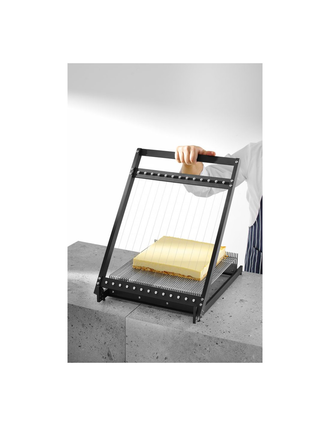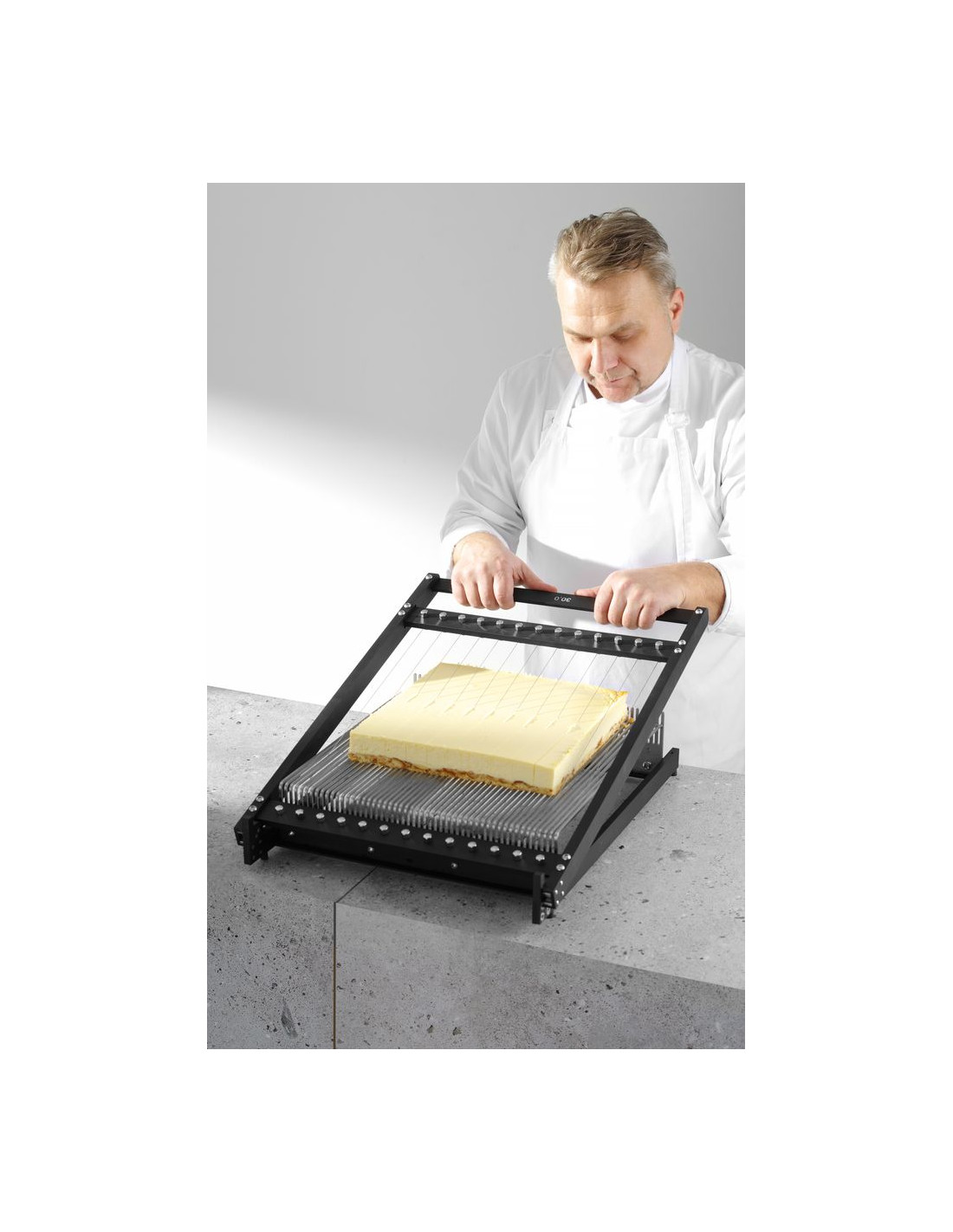 Verktyget för exakt längsgående och tvärgående skärning och snabb portionering av mjuka konfektyrvaror, såsom ganache, vaniljsås, marshmallows, praliner och konfekt till festtårtor. Iögonfallande svart design: bottenram och snörram av svart anodiserad aluminium. Arbetsyta och platta av rostfritt stål – hållbarhet och enkel rengöring garanteras. Snören av hygieniskt kirurgiskt stål. Profilerad arbetsyta och vassa snören garanterar extraordinärt exakt drift; skärning med kirurgisk precision. Specialdesignade gångjärn av mässing – lång produktlivslängd till skillnad från andra produkter på marknaden som har gångjärn av plast. Halkfria fötter som säkerställer stabilitet under drift. Ingår i setet: – 1 bottenplatta som mäter 600×400×(H)100 mm, – 3 skärramar: 9 snören med 45 mm avstånd 13 snören med 30 mm avstånd 17 snören med 22,5 mm avstånd – stålplatta, – skiftnyckel för snörbyte.