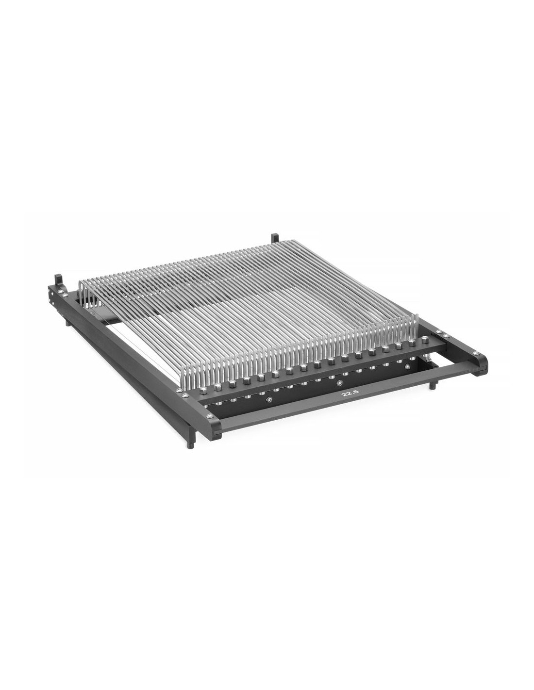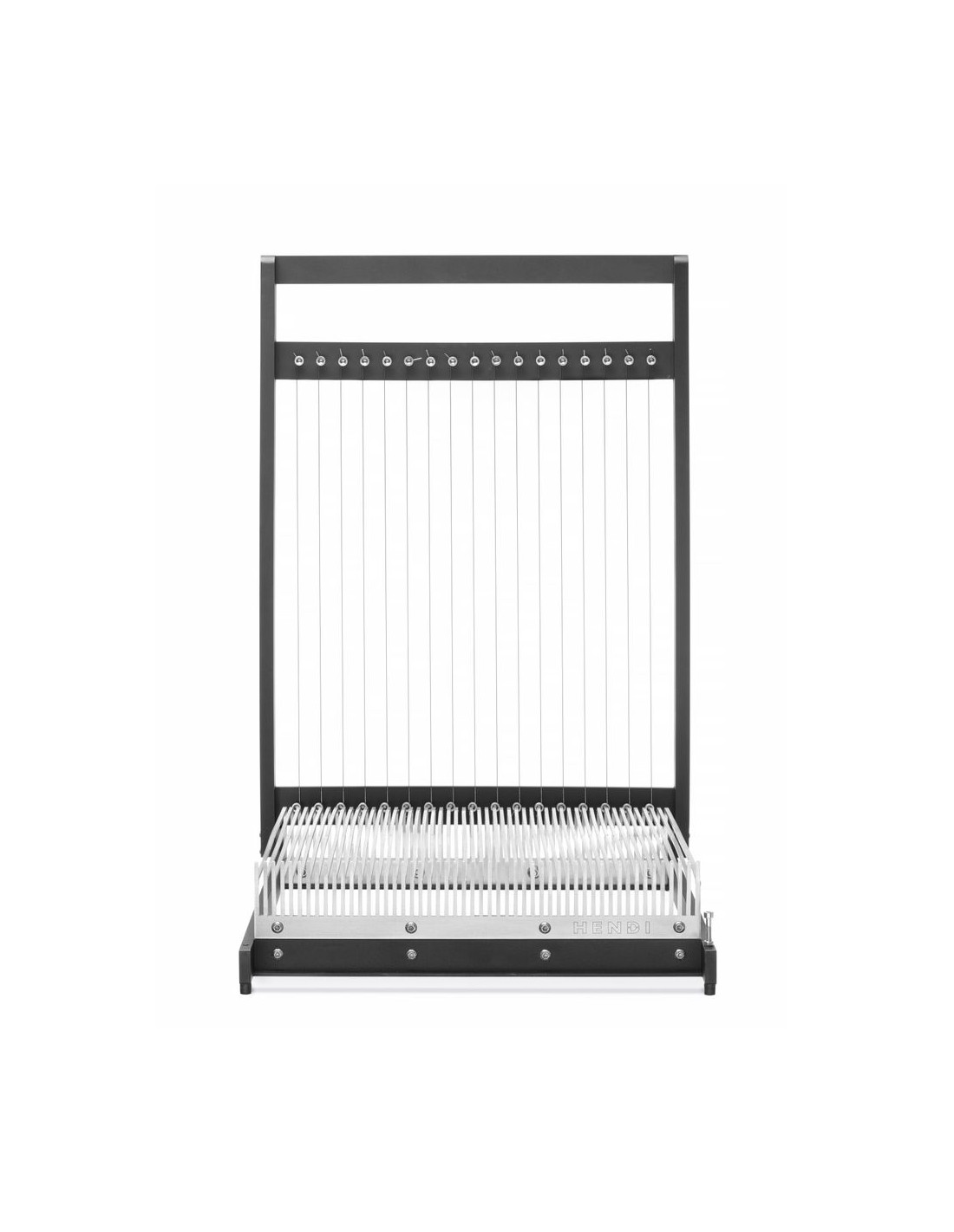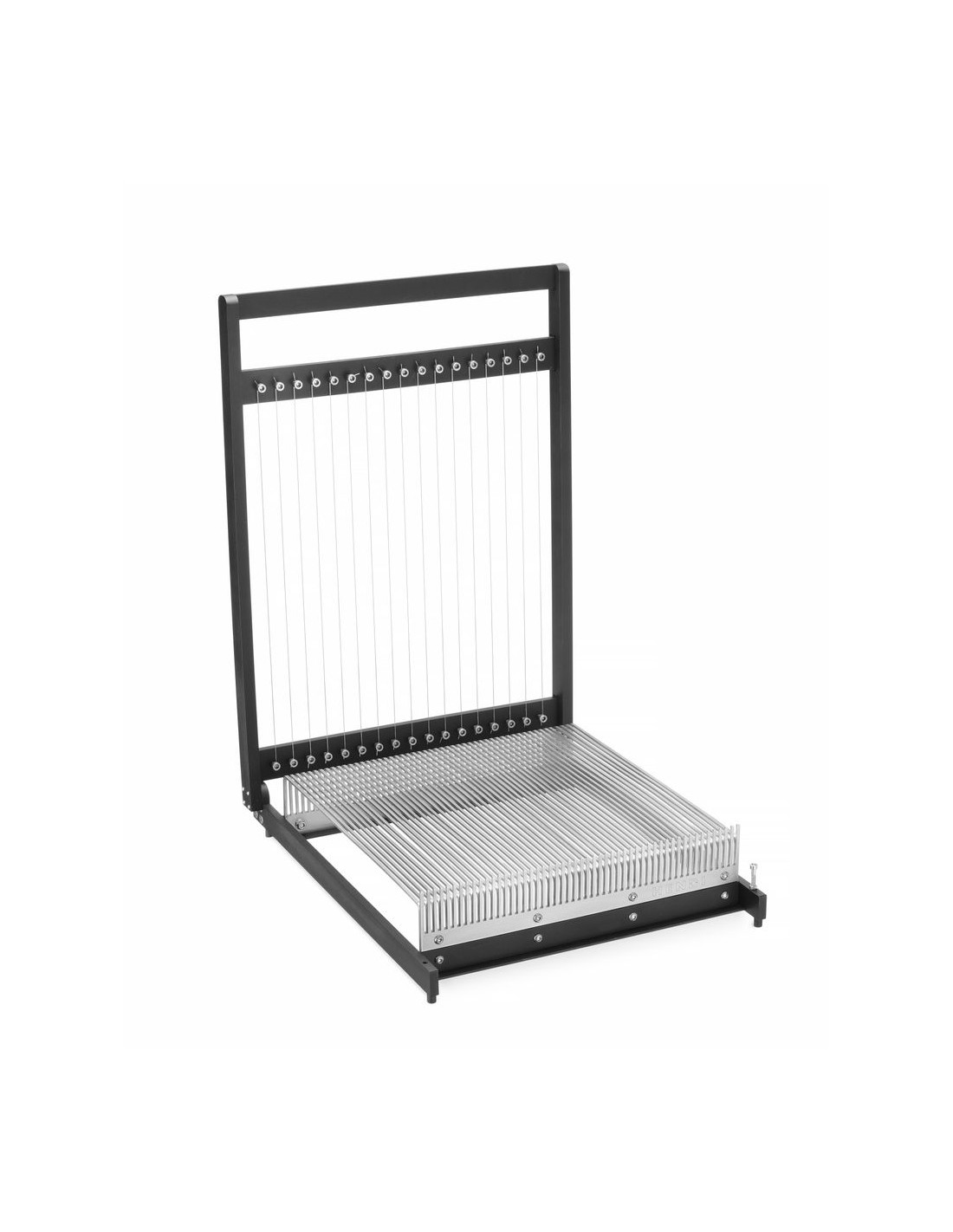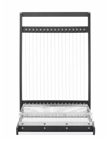 Verktyget för exakt längsgående och tvärgående skärning och snabb portionering av mjuka konfektyrvaror, såsom ganache, vaniljsås, marshmallows, praliner och konfekt till festtårtor. Iögonfallande svart design: bottenram och snörram av svart anodiserad aluminium. Arbetsyta och platta av rostfritt stål – hållbarhet och enkel rengöring garanteras. Snören av hygieniskt kirurgiskt stål. Profilerad arbetsyta och vassa snören garanterar extraordinärt exakt drift; skärning med kirurgisk precision. Specialdesignade gångjärn av mässing – lång produktlivslängd till skillnad från andra produkter på marknaden som har gångjärn av plast. Halkfria fötter som säkerställer stabilitet under drift. Ingår i setet: – 1 bottenplatta som mäter 600×400×(H)100 mm, – 3 skärramar: 9 snören med 45 mm avstånd 13 snören med 30 mm avstånd 17 snören med 22,5 mm avstånd – stålplatta, – skiftnyckel för snörbyte.