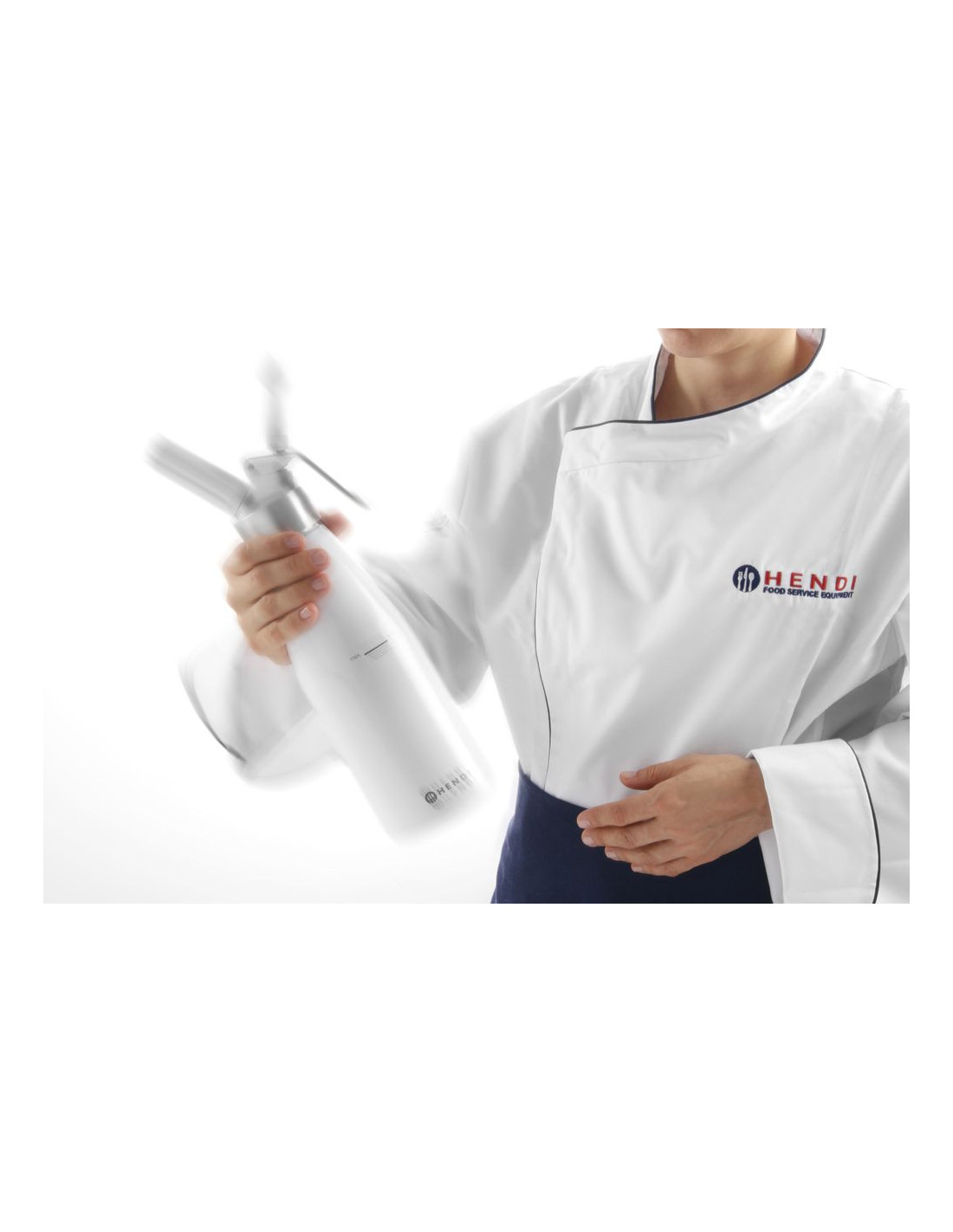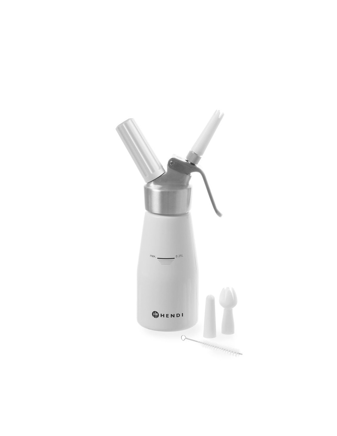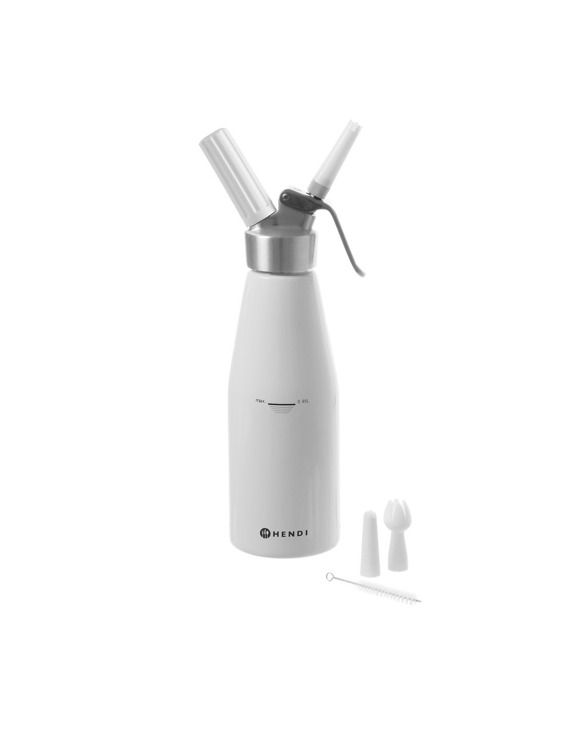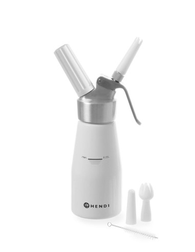 Aluminiumhuvud och vitlackerad aluminiumflaska. Med 3 olika munstycken, laddningshållare samt rengöringsborste. Ej lämplig för starka såser. Kräver gräddladdningsladdare (N₂O) för att fungera, ingår ej.