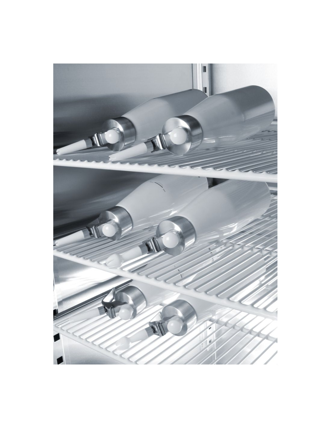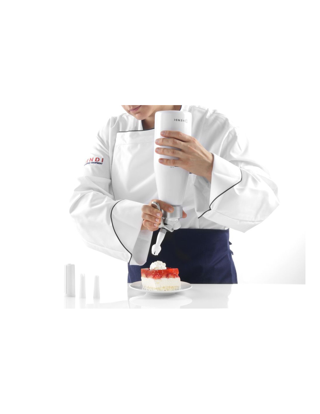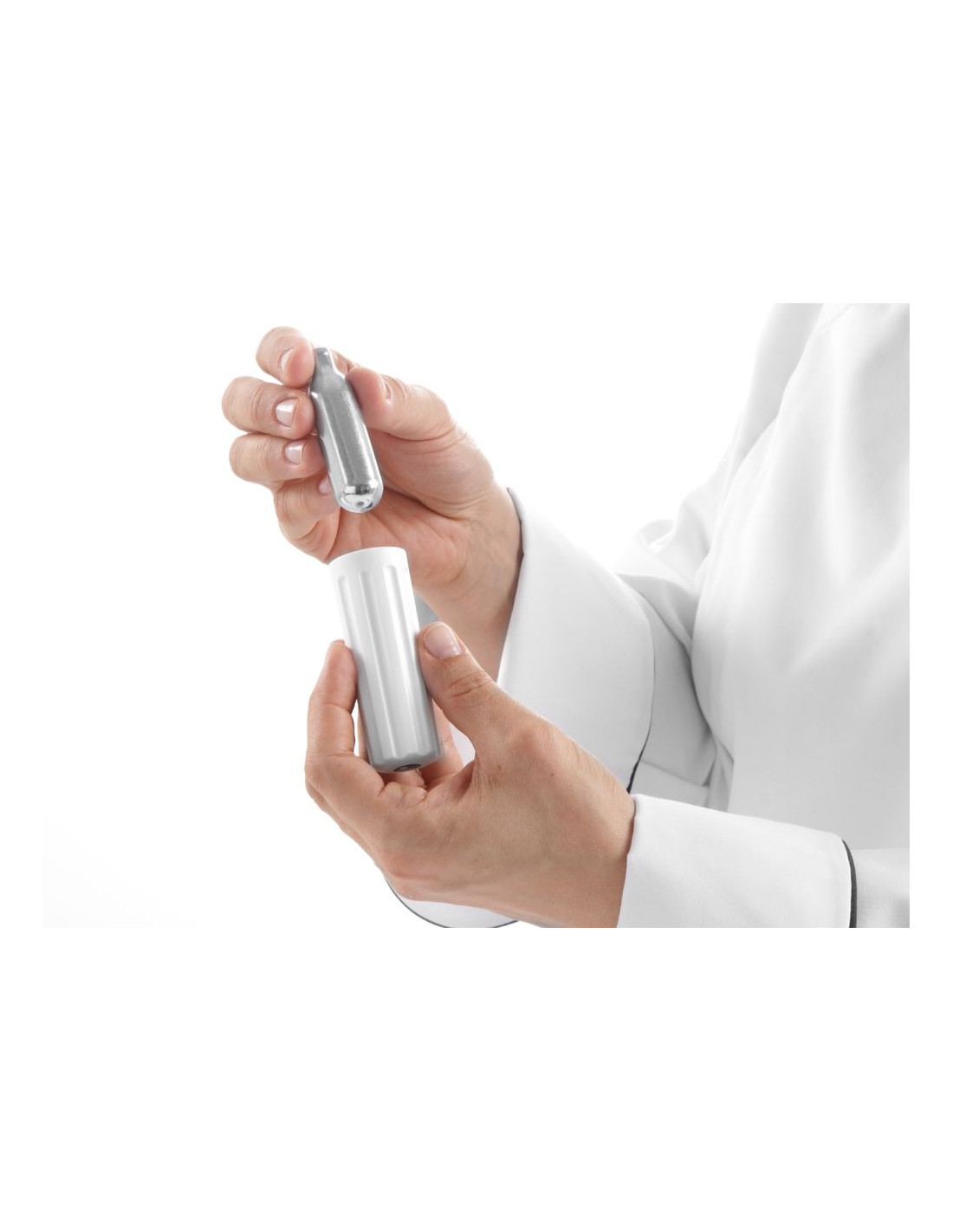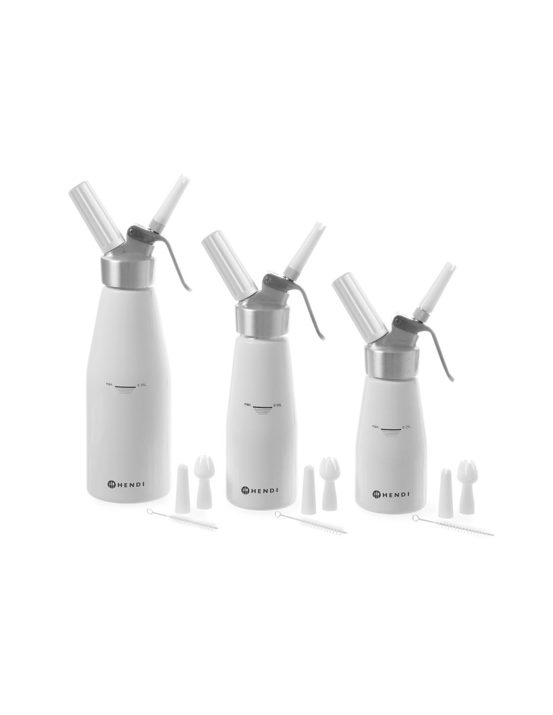 Aluminiumhuvud och vitlackerad aluminiumflaska. Med 3 olika munstycken, laddningshållare samt rengöringsborste. Ej lämplig för starka såser. Kräver gräddladdningsladdare (N₂O) för att fungera, ingår ej.