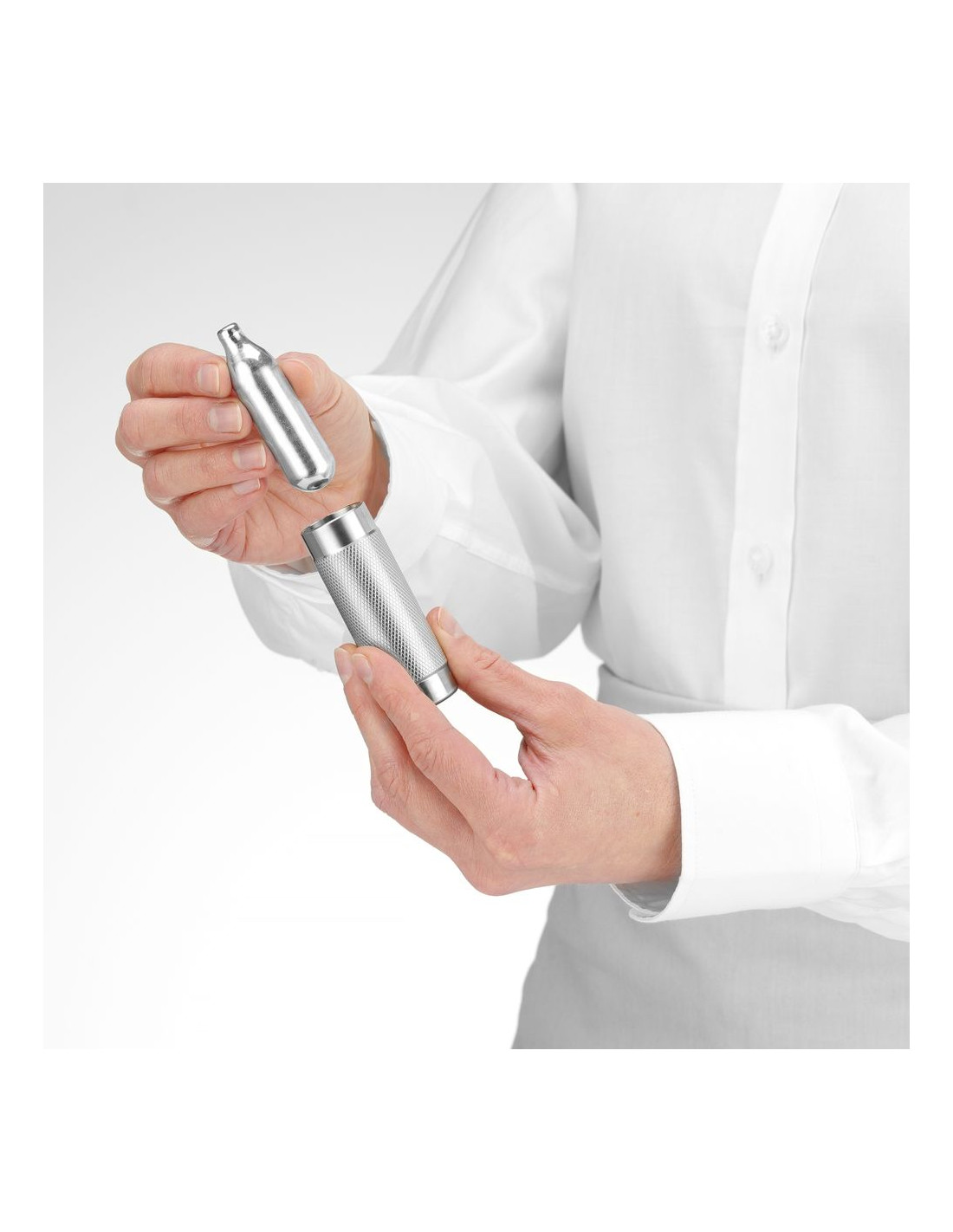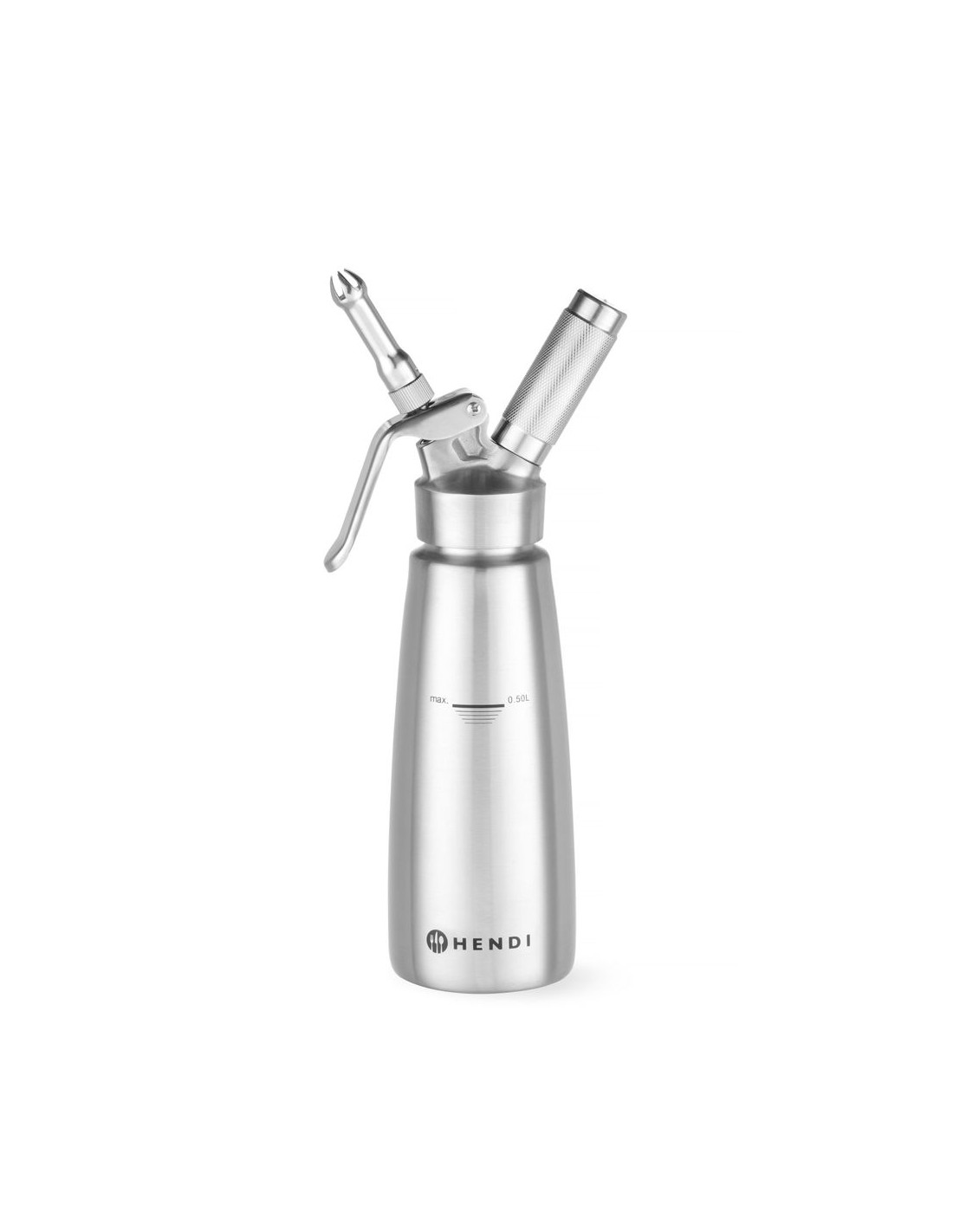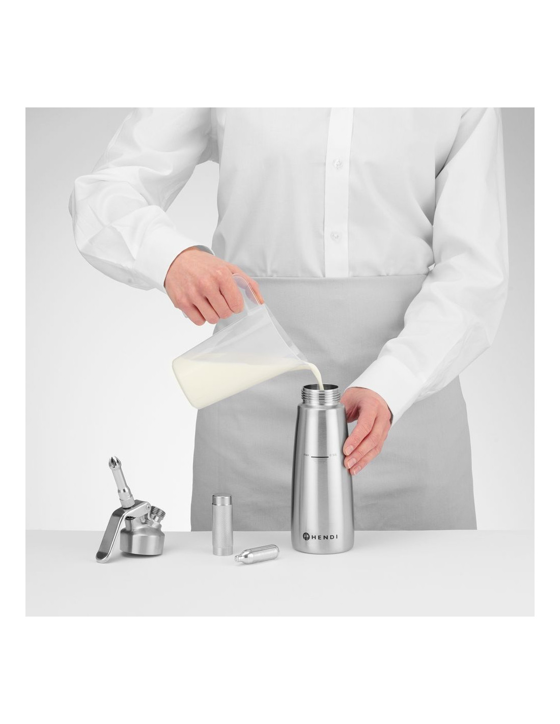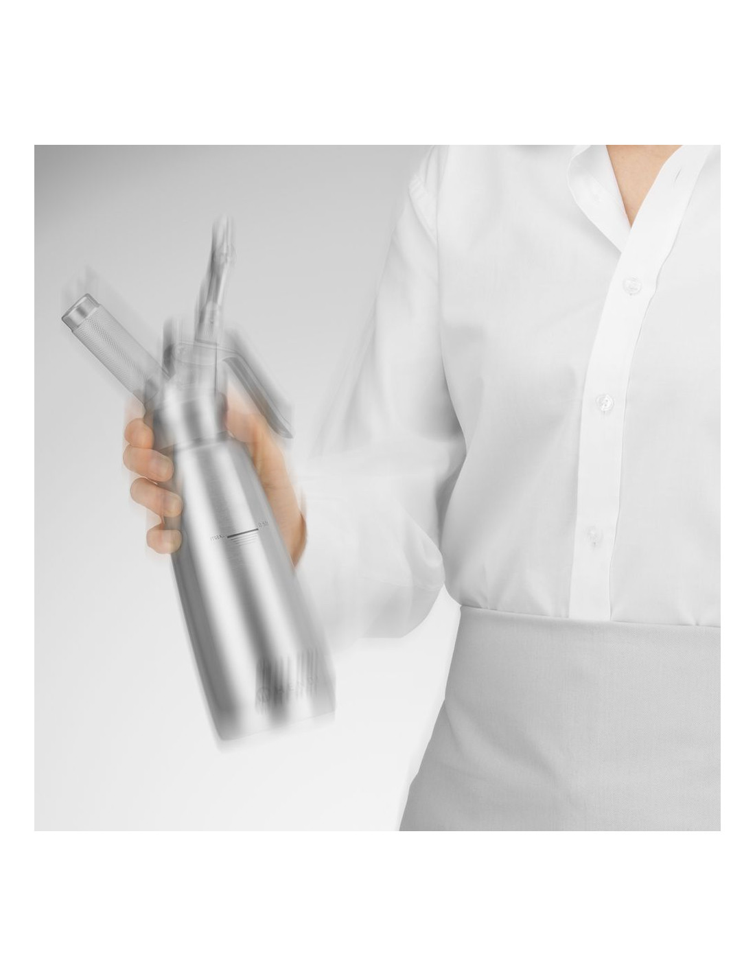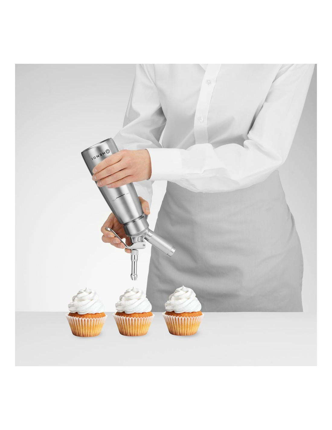 Gör enkelt utsökt vispgrädde, mousser, desserter, kallskum och såser. Perfekt för garnering av cappuccinos, kaffe, shakes och glass. Lämplig för att servera varma krämer och såser upp till 70 °C. Håller innehållet färskt i upp till 14 dagar i kylskåpet. Inkluderar 3 munstycken i rostfritt stål och en rengöringsborste. Kräver gräddladdare (N₂O) för att fungera, ingår ej.