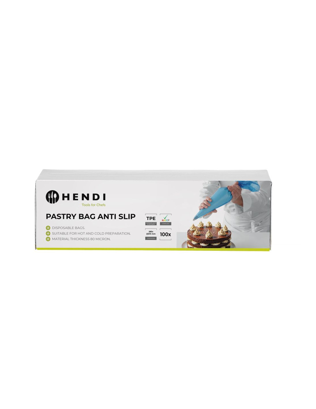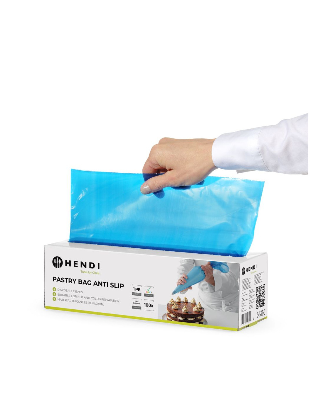 Tillverkad av TPE, BPA-fri. Engångsförpackad. Lämplig för varma och kalla ingredienser. Uppfyller HACCP-standarder. Filmtjocklek: 80 mikron. Rulle med 100 st.