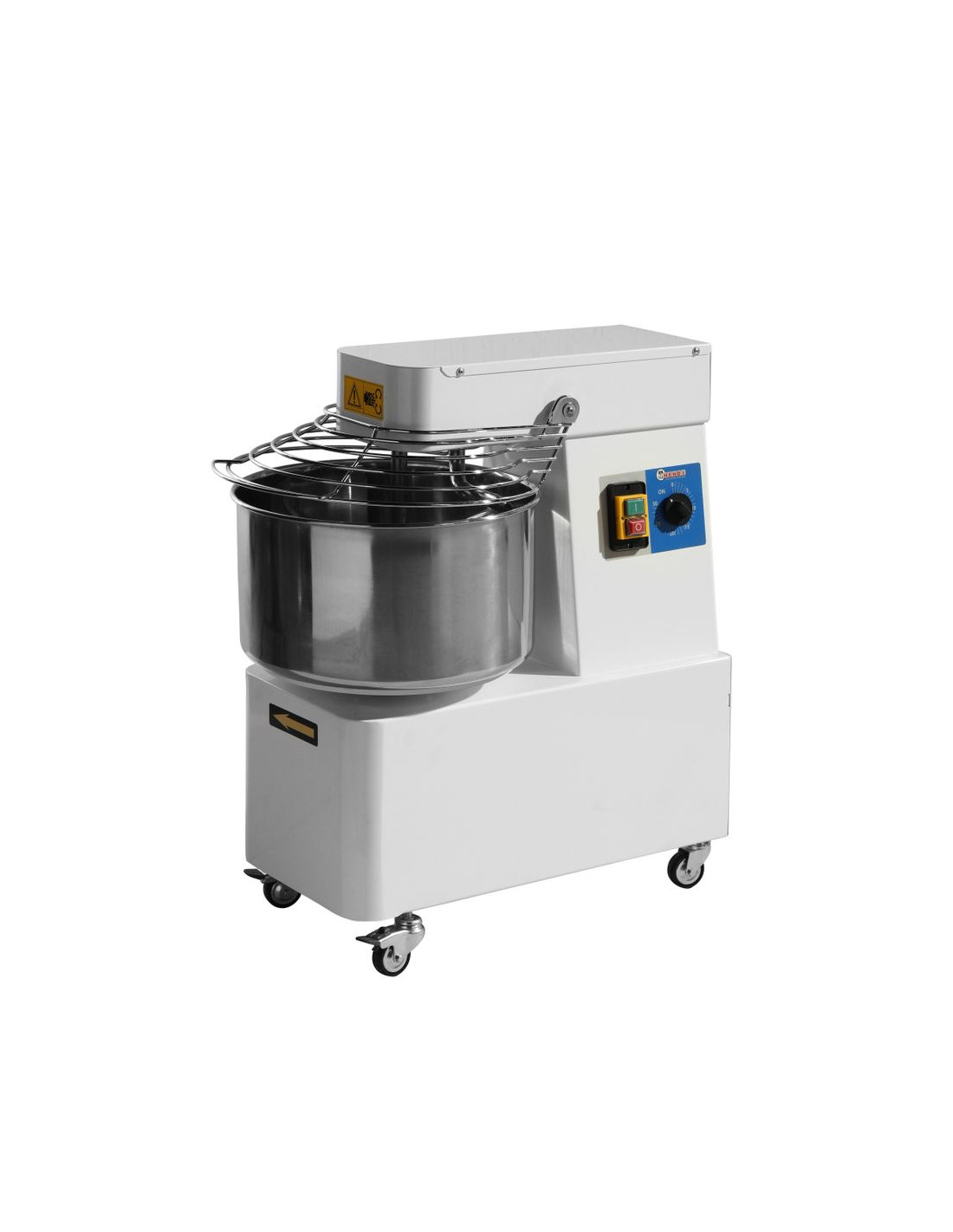 För professionellt bruk. Idealisk för pizzerior, bagerier, konditorier, dumplingsbarer och munkbutiker för att blanda tung deg. Robust och robust hölje av vitlackerat stål. Skålen, skyddsgallret och spiralen är tillverkade av rostfritt stål AISI 304. Säkerhetsskydd med galler gör det enkelt att tillsätta ingredienser under drift. Med mikrobrytare stoppas driften när säkerhetsskyddet lyfts. Kedjedrift säkerställer effektiv drift. Tyst arbete garanteras tack vare oljebadsmotor. Spiralkonstruktionen säkerställer perfekt homogenitet och luftning av degen. Mixern värmer inte upp degen under drift. Med inbyggd 30-minuterstimer. Utrustad med 4 hjul varav 2 har bromsar, vilket säkerställer bekväm transport och enkel användning i köket.