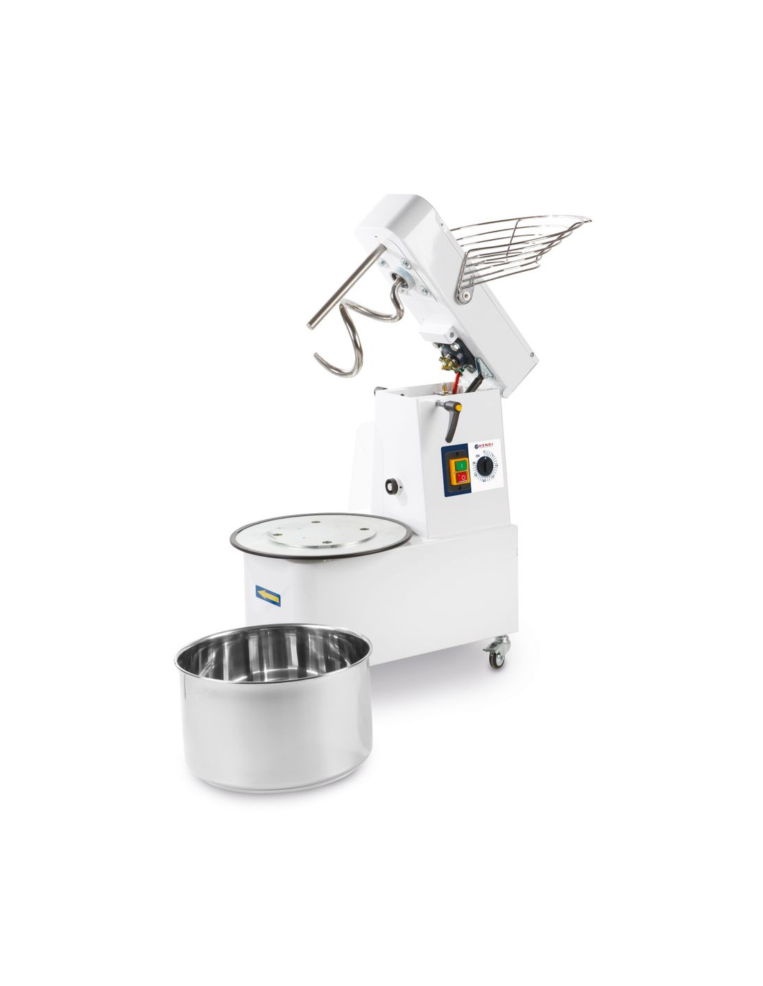 För professionellt bruk. Idealisk för pizzerior, bagerier, konditorier, dumplingsbarer och munkbutiker för att blanda tung deg. Robust och robust hölje av vitlackerat stål. Skålen, skyddsgallret och spiralen är tillverkade av rostfritt stål AISI 304. Säkerhetsskydd med galler gör det enkelt att tillsätta ingredienser under drift. Med mikrobrytare stoppas driften när säkerhetsskyddet lyfts. Kedjedrift säkerställer effektiv drift. Tyst arbete garanteras tack vare oljebadsmotor. Spiralkonstruktionen säkerställer perfekt homogenitet och luftning av degen. Mixern värmer inte upp degen under drift. Med inbyggd 30-minuterstimer. Utrustad med 4 hjul varav 2 har bromsar, vilket säkerställer bekväm transport och enkel användning i köket.