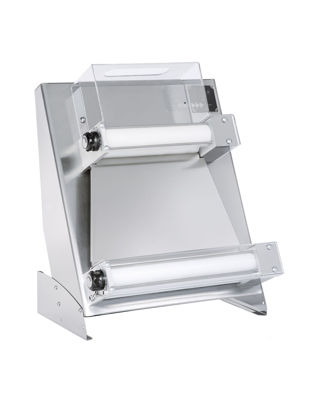 Den elektriska degvalsen Prismafood ”Touch and go” 400 har en automatisk startfunktion som aktiveras så snart degen läggs i, vilket sparar värdefull tid i kök med hög belastning. Den är tillverkad av slitstarkt rostfritt stål och har justerbara dubbla valsar för exakt tjocklek och rundning, utan att degen värms upp.