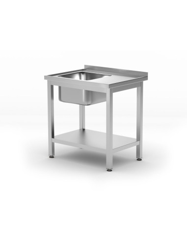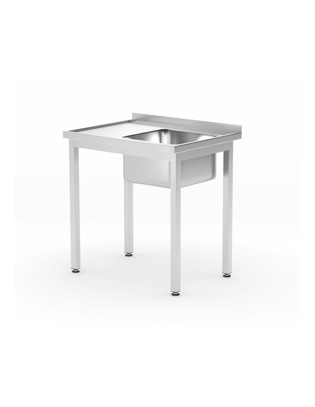 Bultad konstruktion för självmontering, vilket möjliggör enkel transport och förvaring. Tillverkad av rostfritt stål. Avloppskammaren är sömlöst bultad i bänkskivan, pressad ur en enda plåt av rostfritt stål. Diskbänkens mått: 400x400x(H)250 mm. Standardprägling i botten för sifonen: Ø50 mm. Hål för kran: Ø30 mm. 10 mm prägling av bänkskivan för att förhindra att vatten rinner ut. Den ungefärliga tillåtna belastningen på bänkskivan är 70 kg/m². Stänkskydd 40 mm högt för att skydda väggen mot fläckar. Bordets bakre ben är flyttade 50 mm från väggen för att underlätta väggmontering. Ben tillverkade av 40x40 mm profiler. Justerbara fötter i intervallet: +25/-5 mm.
