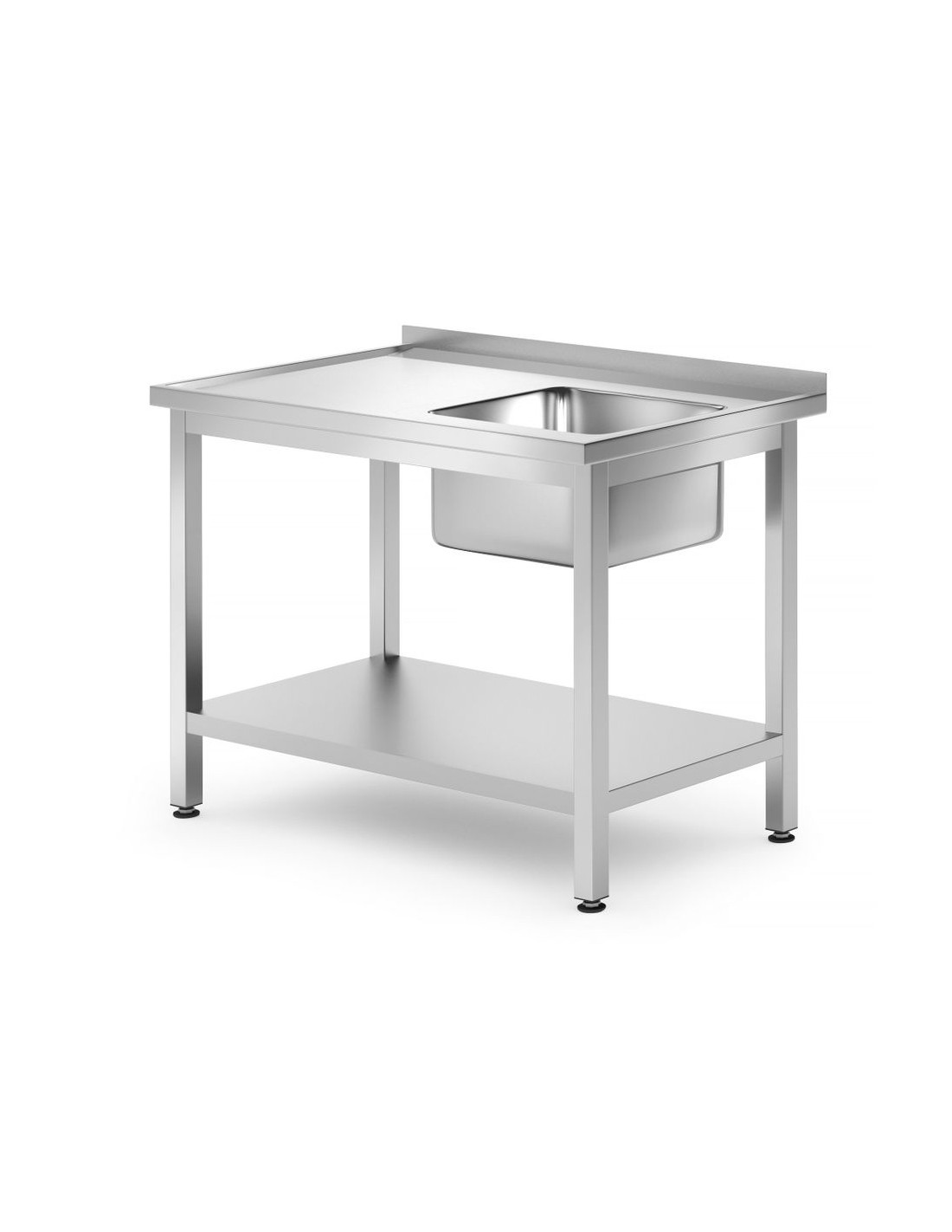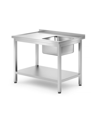 Bultad konstruktion för självmontering, vilket möjliggör enkel transport och förvaring. Tillverkad av rostfritt stål. Avloppskammaren är sömlöst bultad i bänkskivan, pressad ur en enda plåt av rostfritt stål. Diskbänkens mått: 400x400x(H)250 mm. Standardprägling i botten för sifonen: Ø50 mm. Hål för kran: Ø30 mm. 10 mm prägling av bänkskivan för att förhindra att vatten rinner ut. Den ungefärliga tillåtna belastningen på bänkskivan är 70 kg/m². Stänkskydd 40 mm högt för att skydda väggen mot fläckar. Bordets bakre ben är flyttade 50 mm från väggen för att underlätta väggmontering. Ben tillverkade av 40x40 mm profiler. Justerbara fötter i intervallet: +25/-5 mm.