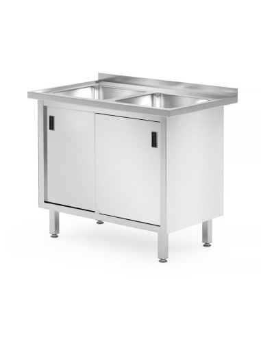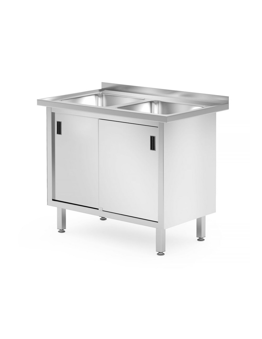 Tillverkad av rostfritt stål. Svetsad konstruktion. Standardprägling i botten för sifon: Ø50 mm. Hål för kran: Ø30 mm. Inkluderar frontkåpa. Ben tillverkade av 40x40 mm profiler. Ungefärlig tillåten belastning på bänkskivan: 70 kg/m². Stänkskydd 40 mm högt för att skydda väggen mot fläckar. Bakre ben flyttade 100 mm från väggen för att underlätta vägginstallation. Benhöjd: 160 mm. Justerbara fötter (+25/-5 mm). Inkluderar gångjärnsförsedda dörrar. Inkluderar ej bakvägg.