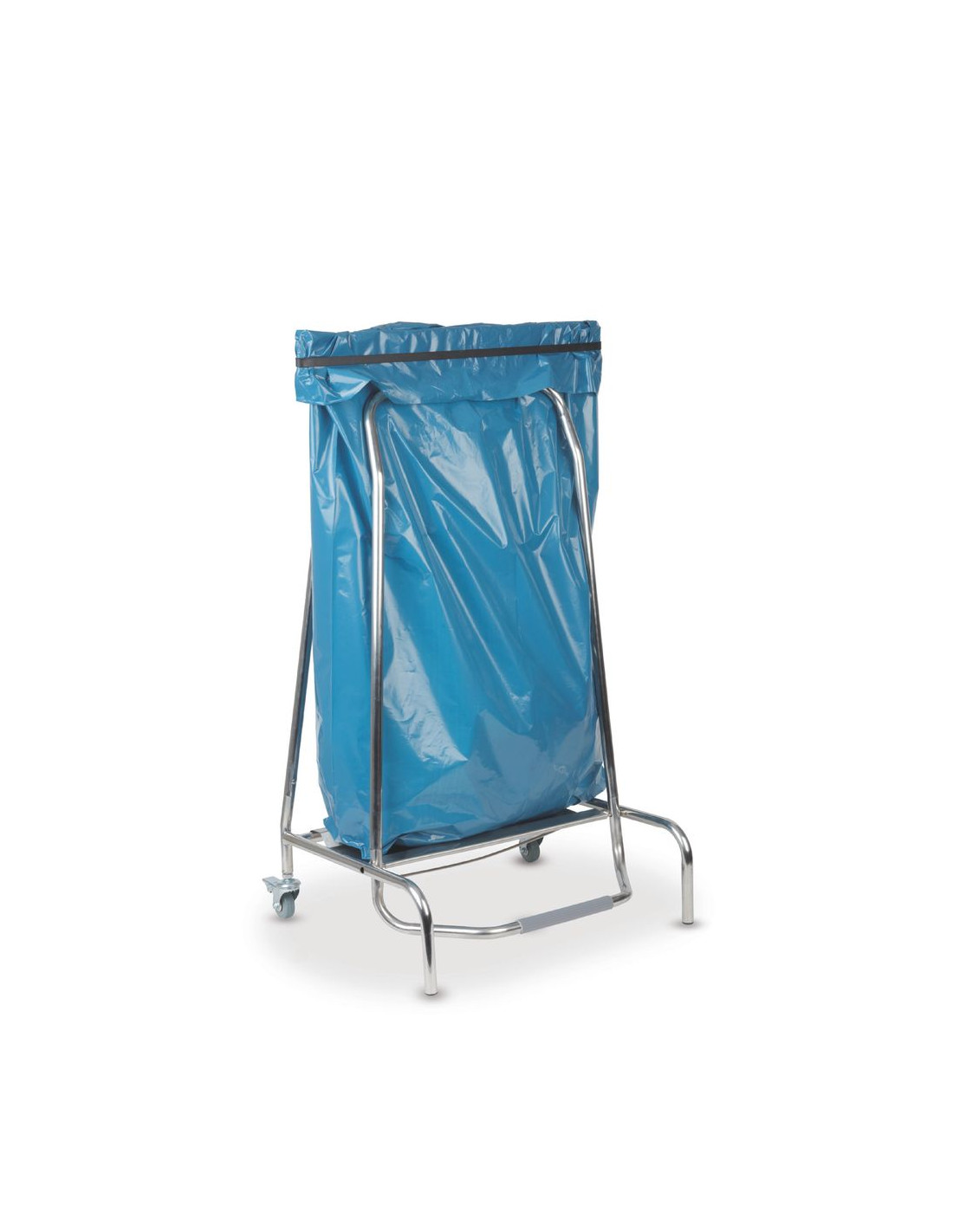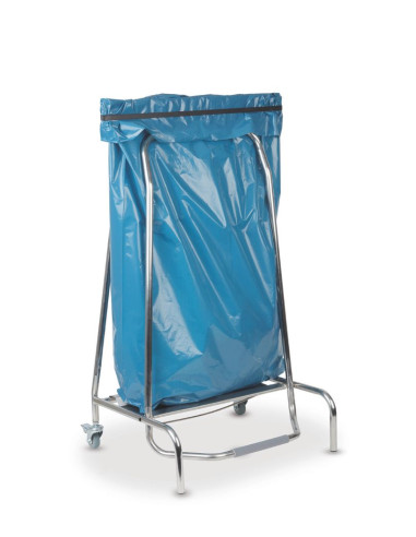 Ram av rostfritt stål. Avsedd för sopsäckar 70–110 cm, 120 liter. Fotmanövrerad klämmekanism håller påsen stängd. 2 hjul med bromsar.