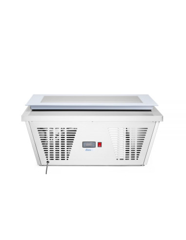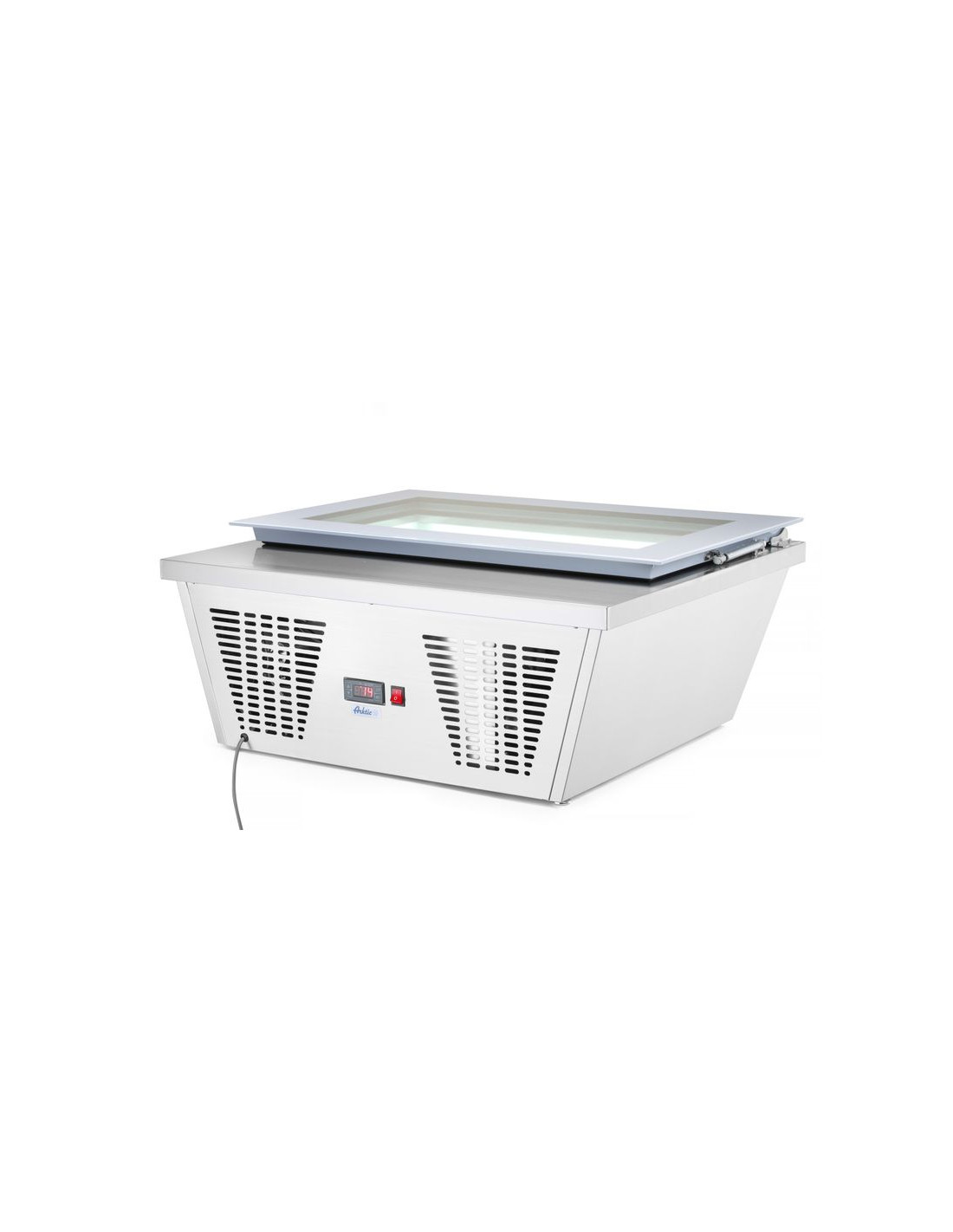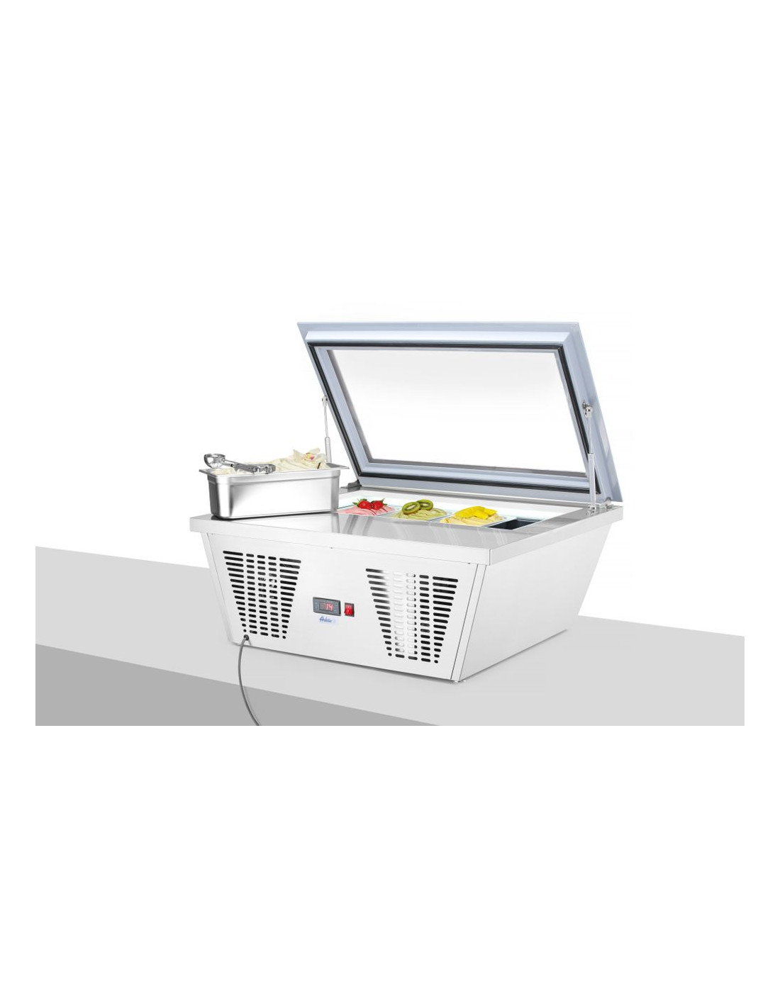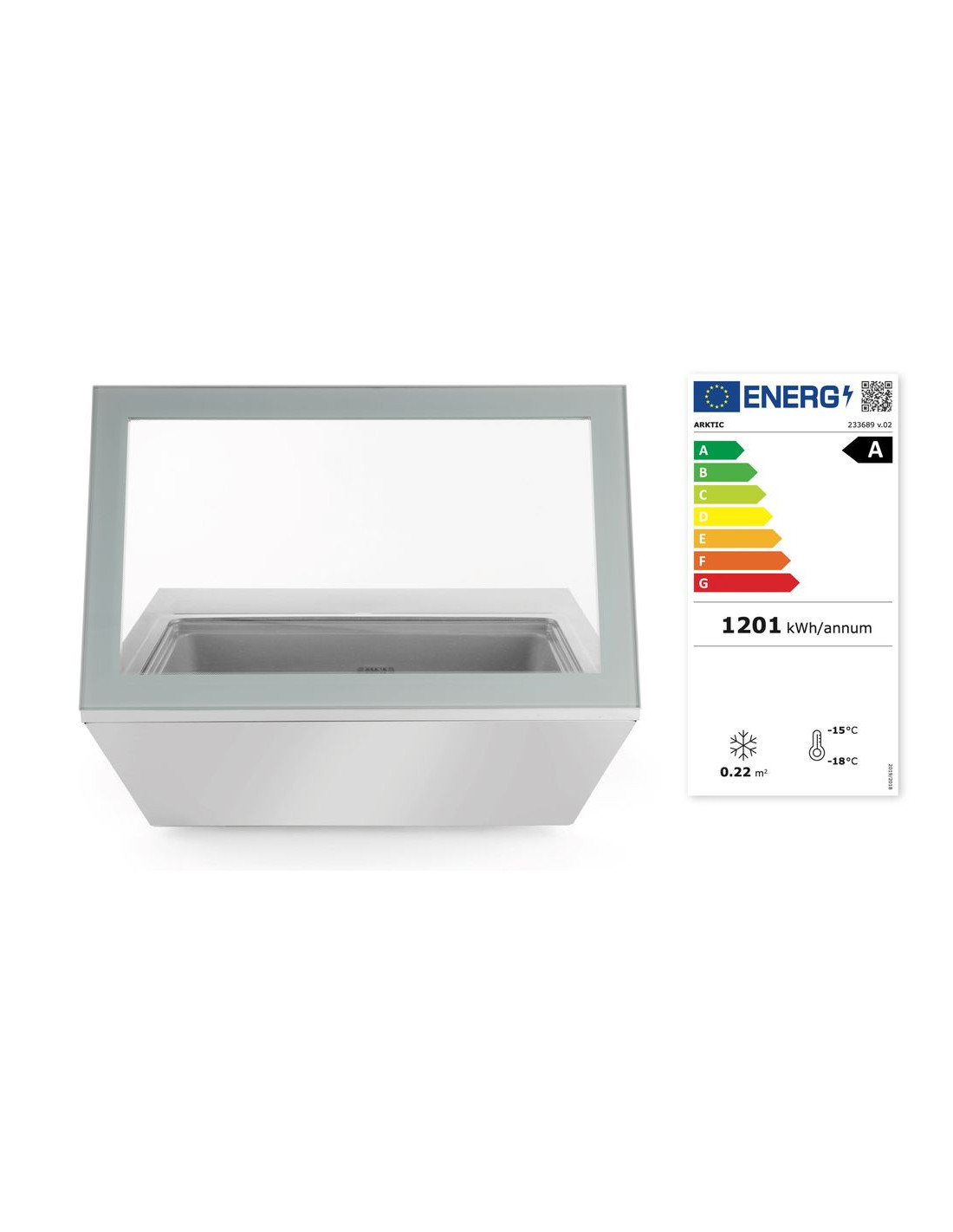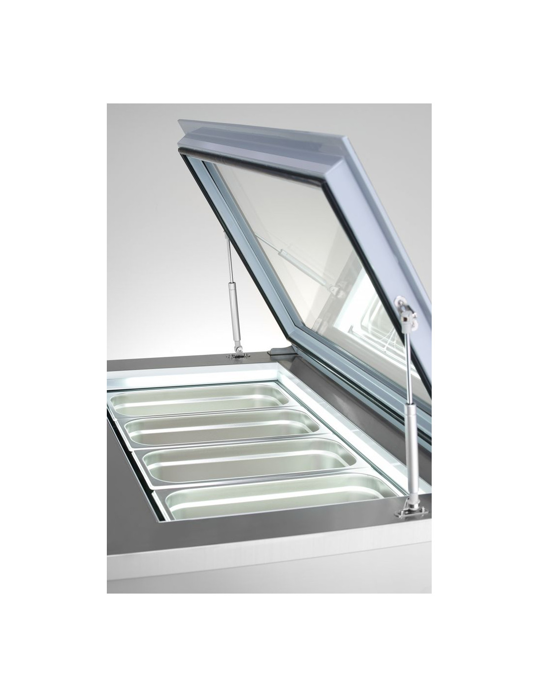 Hölje av rostfritt stål med härdat glas. Statisk kylning med automatisk avfrostning. Digital display och temperaturjusteringsområde: från -25 °C till -18 °C. Höjdjusterbara fötter. Köldmedium: R290. Klimatklass: 4. Energimärkning: A. Innehåller 4 behållare med kapacitet på 5 liter vardera och en höjd på 150 mm.