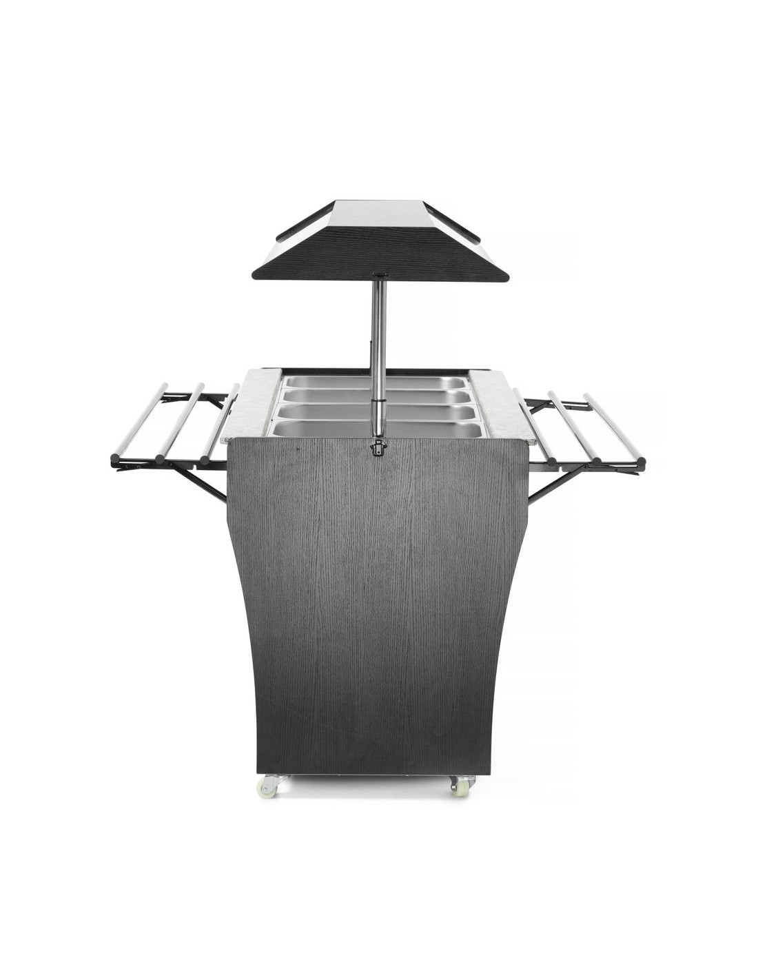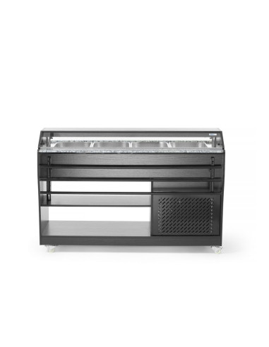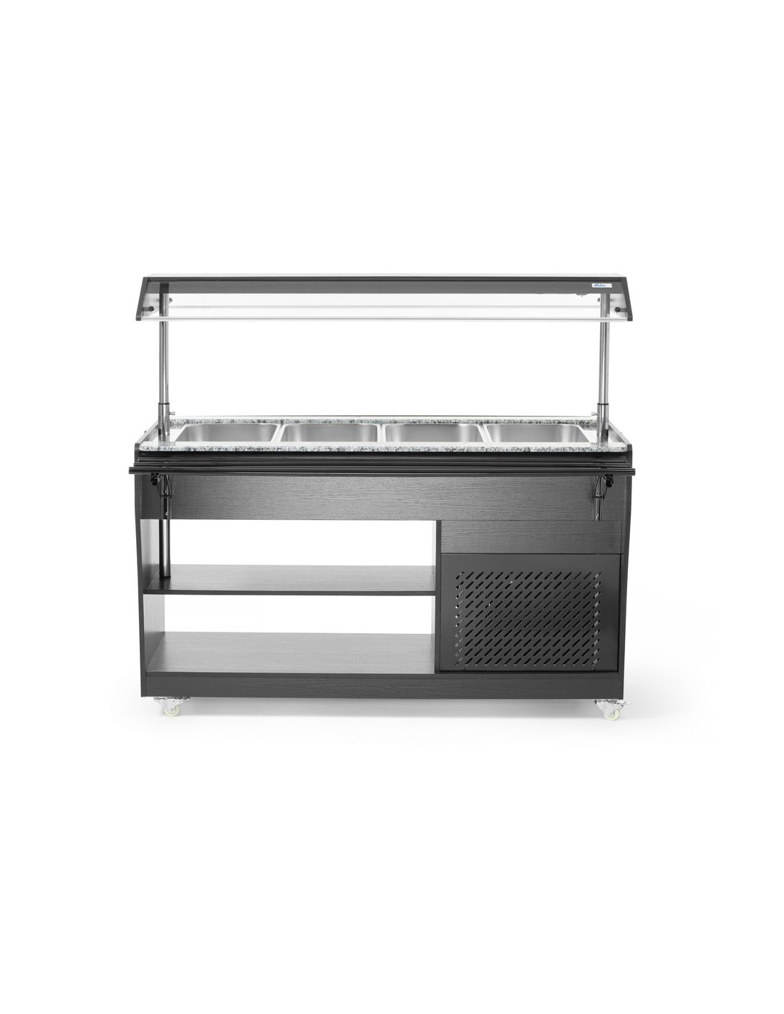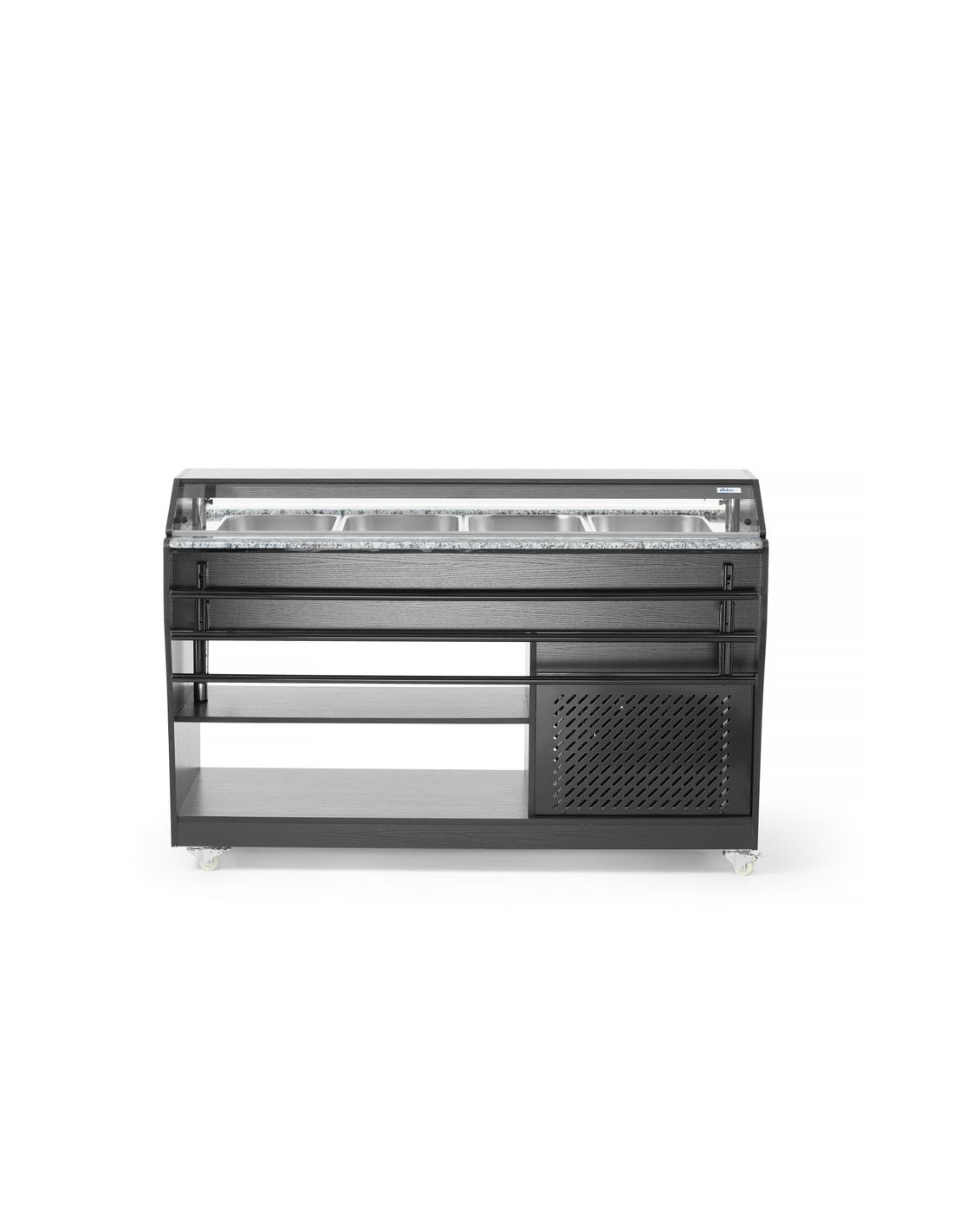 Hölje av rostfritt stål med svart plywood. Lämplig för 4 GN 1/1-behållare - max 150 mm djup. Levereras med 4 GN 1/1-behållare. Utrustad med belysning i locket. Locket kan sänkas ner för att fungera som lock, säkras med spärrar. Hopfällbara gejder på båda sidor. Stor hylla under bänkskivan. Utrustad med 4 hjul. Temperaturjusterbar från 2 °C till 10 °C. Klimatklass: 4.