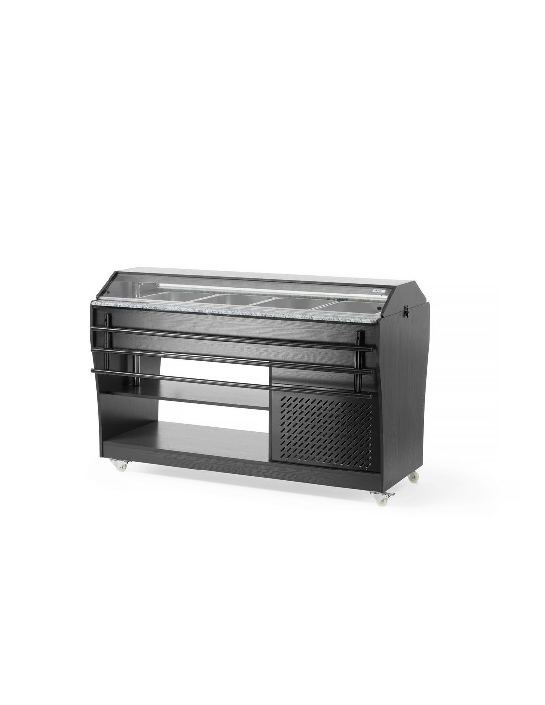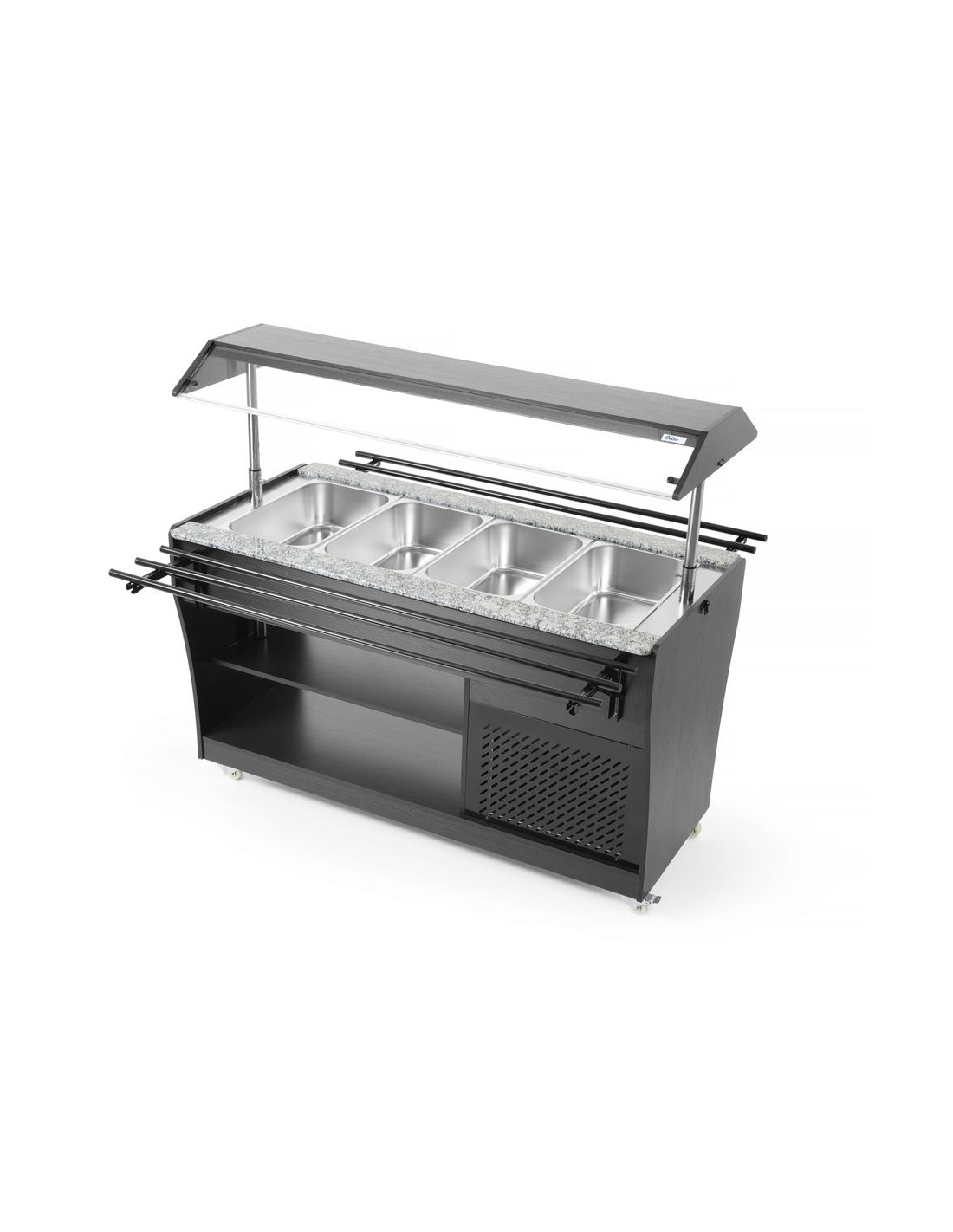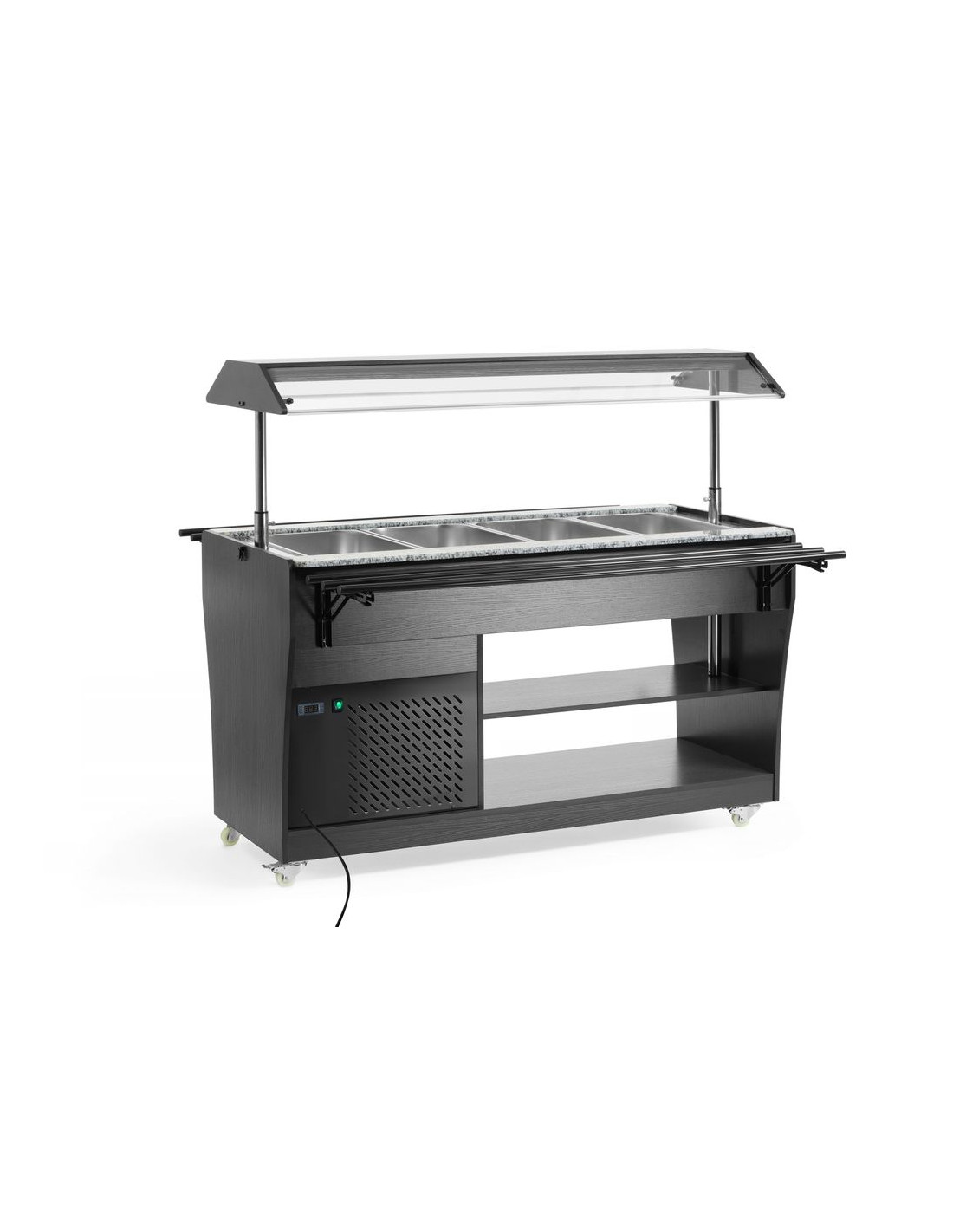 Arktic salladsbuffé har plats för 4 GN 1/1-behållare, vilka ingår i setet. Buffén är utrustad med belysning i taket, har 2 hyllplan undertill för förvaring av tallrikar och bestick och är lätt att flytta tack vare 4 hjul. Denna buffé är den perfekta lösningen för självbetjäningsställen eller evenemang, eftersom den har en hylla för brickor på båda sidor och säkerställer att maten förvaras perfekt sval.