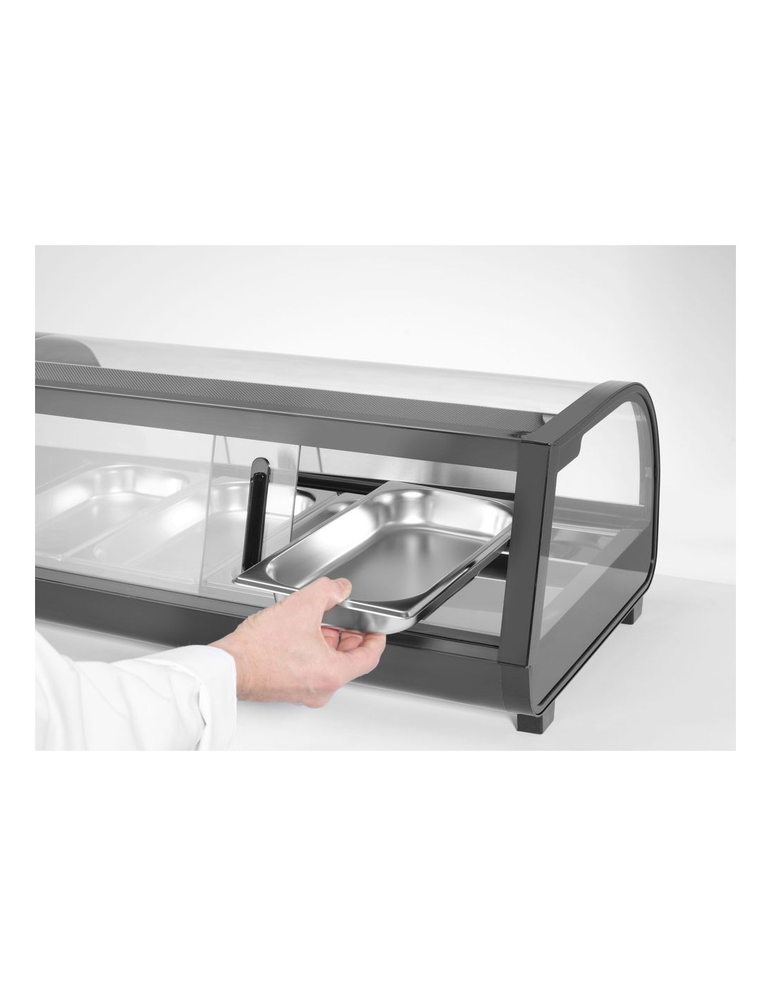 - Stort lock i härdat glas som erbjuder en praktisk presentation av maten.