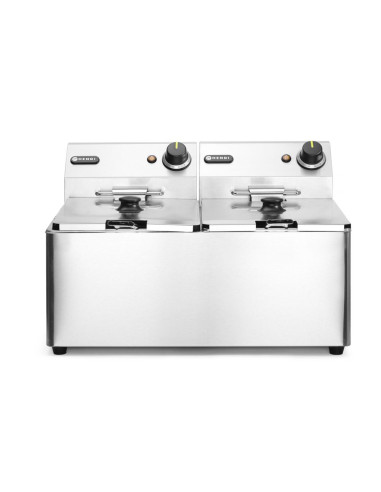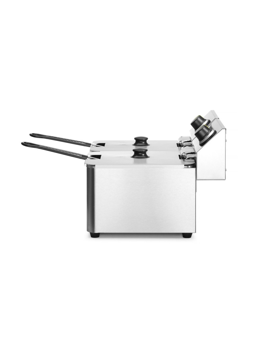 Med 2 värmeelement på 3500W vardera. Varje element har sin egen strömförsörjning, därför behövs 2 uttag. Hölje och oljetank tillverkade av rostfritt stål. Avtagbart element med avstängningsfunktion när det tas bort. Avtagbar oljebehållare, vilket gör den enklare att rengöra. Värmeindikatorlampa som visar om värmeelementet är i drift. Temperaturen kan ställas in upp till 190 °C. En säkerhetstermostat säkerställer att fritösen inte överhettas. Överhettningsskydd med återställning för extra skydd. En stekkorg med värmeisolering och extra långt handtag. Kall zon för att skydda oljekvaliteten. Levereras med stekkorg och lock.
