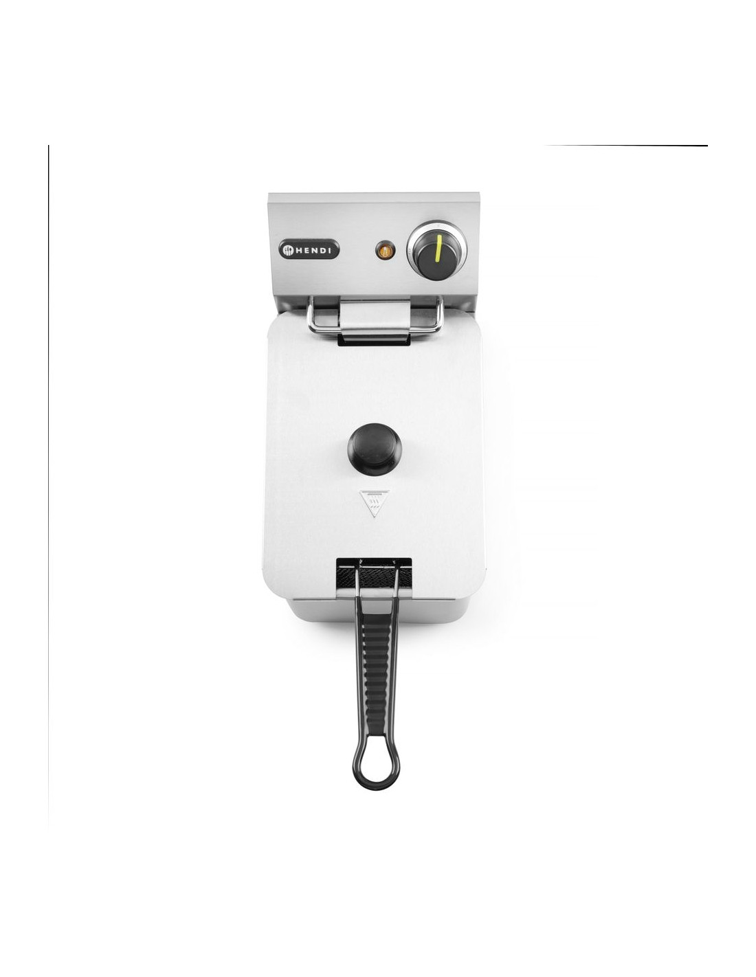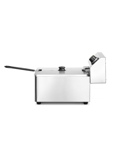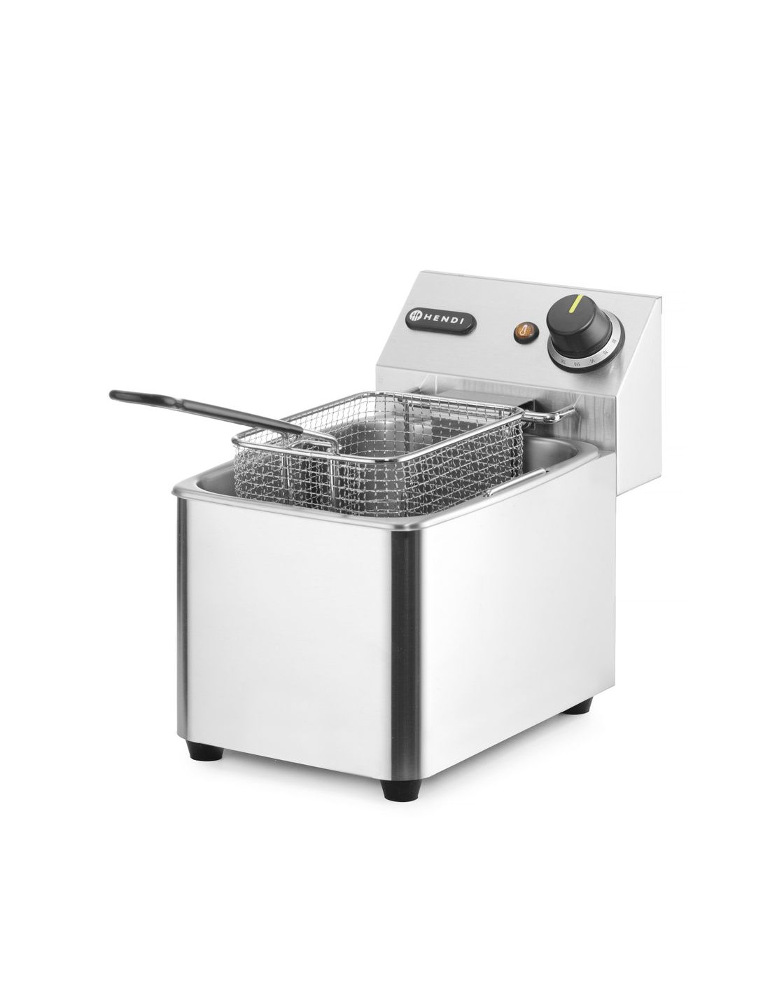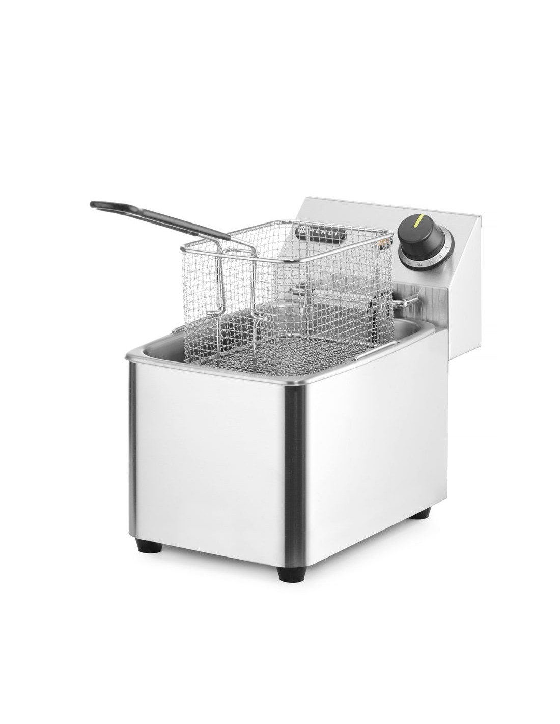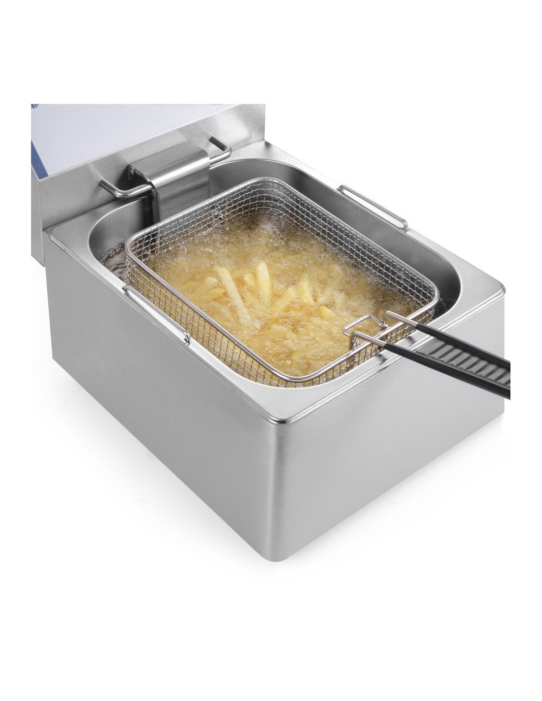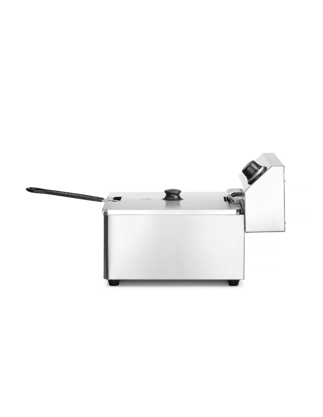 Hölje och oljetank tillverkade av rostfritt stål. Avtagbart element med avstängningsfunktion när det tas bort. Avtagbar oljebehållare, vilket gör den enklare att rengöra. Värmeindikatorlampa som visar om värmeelementet är i drift. Temperaturen kan ställas in upp till 190 °C. En säkerhetstermostat säkerställer att fritösen inte överhettas. Överhettningsskydd med återställning för extra skydd. En stekkorg med värmeisolering och extra långt handtag. Kall zon för att skydda oljekvaliteten. Levereras med stekkorg och lock.