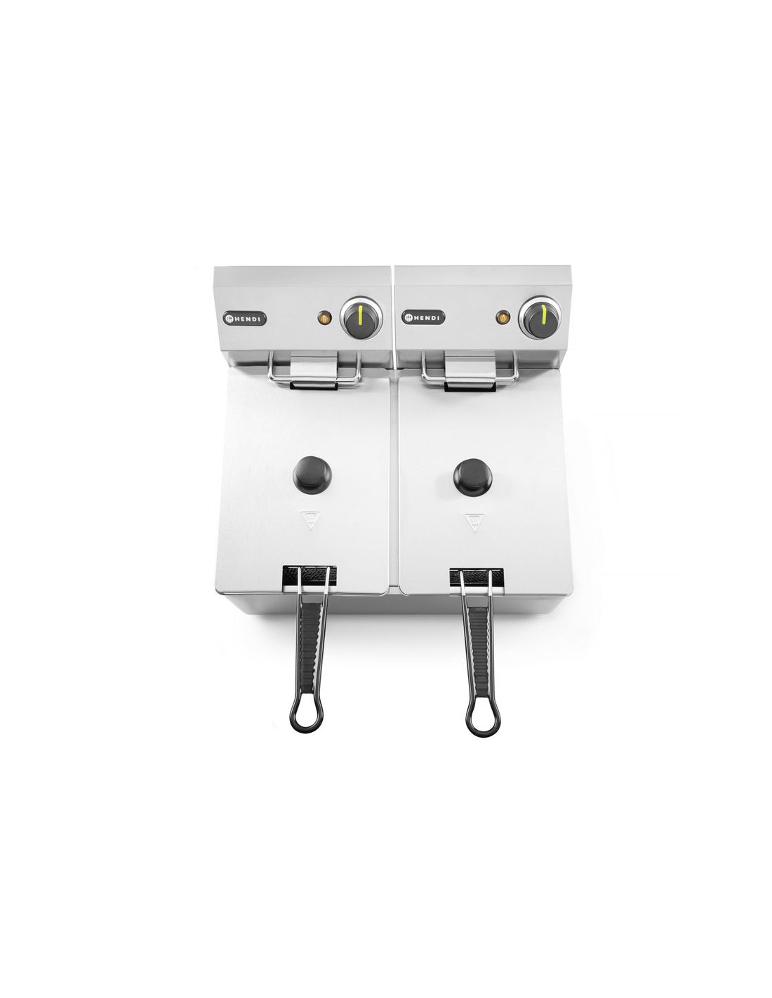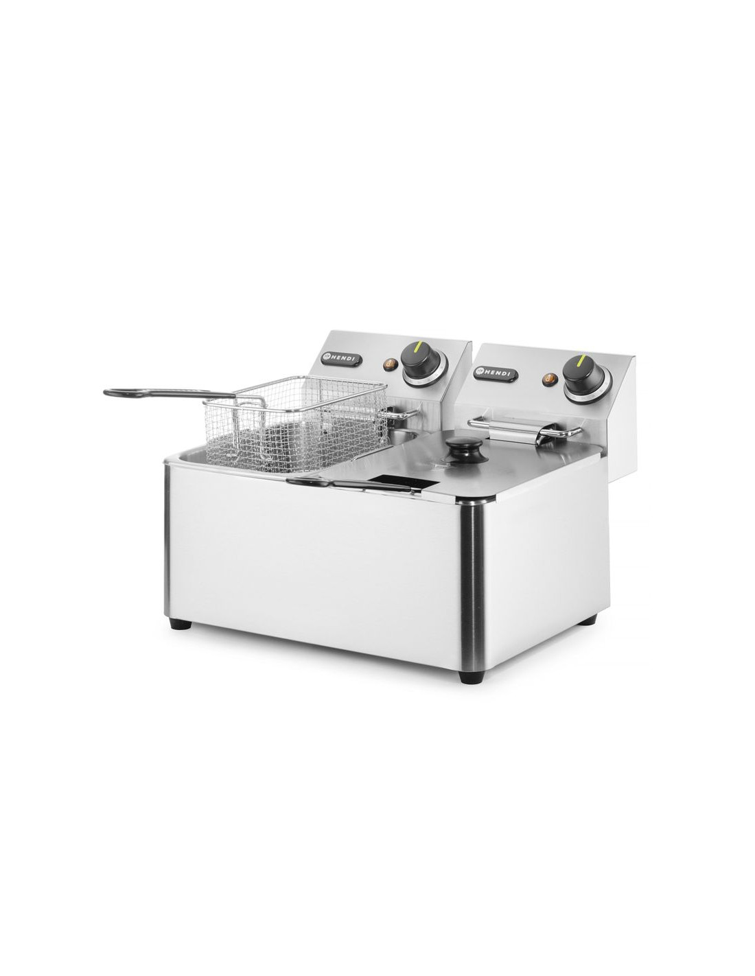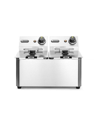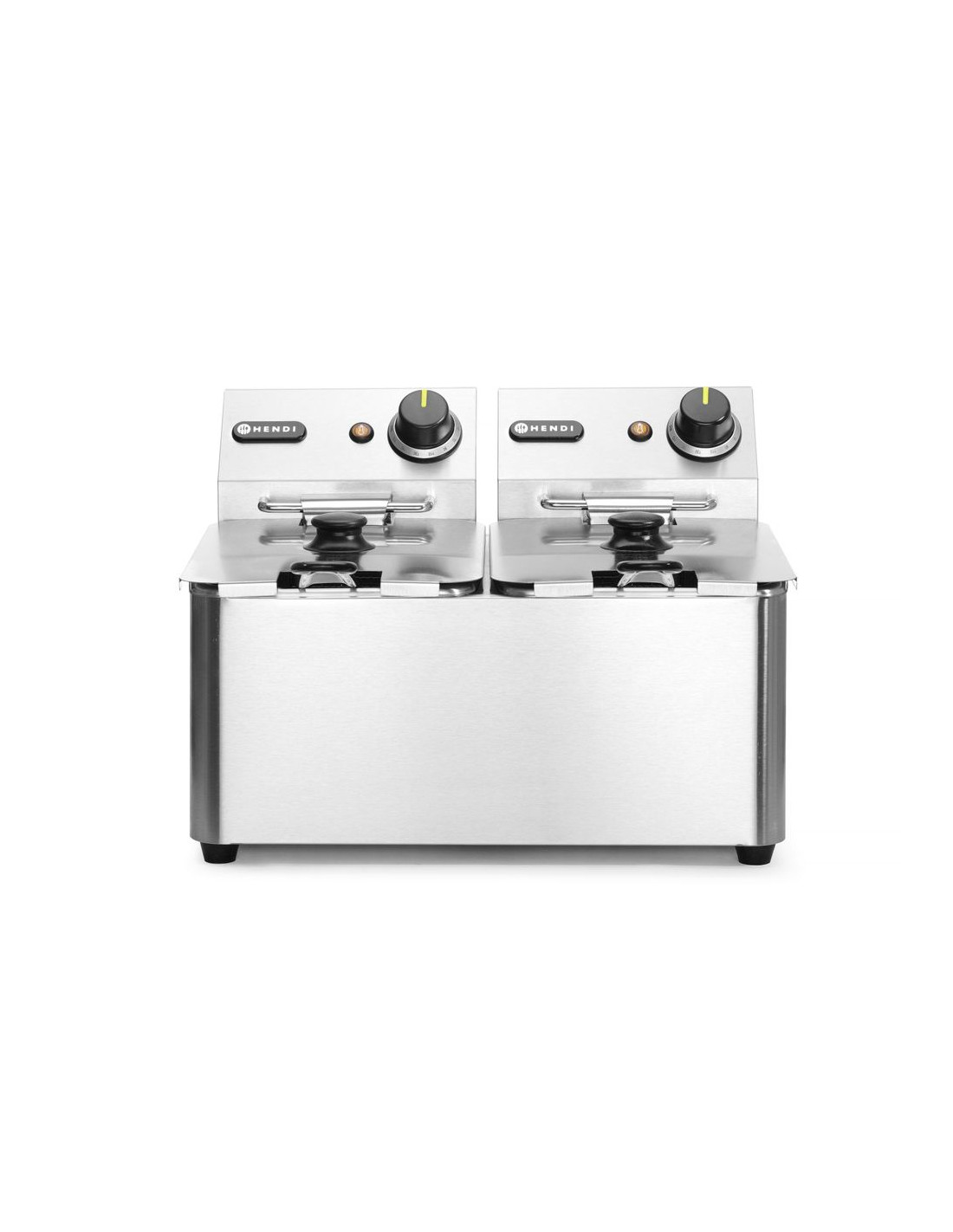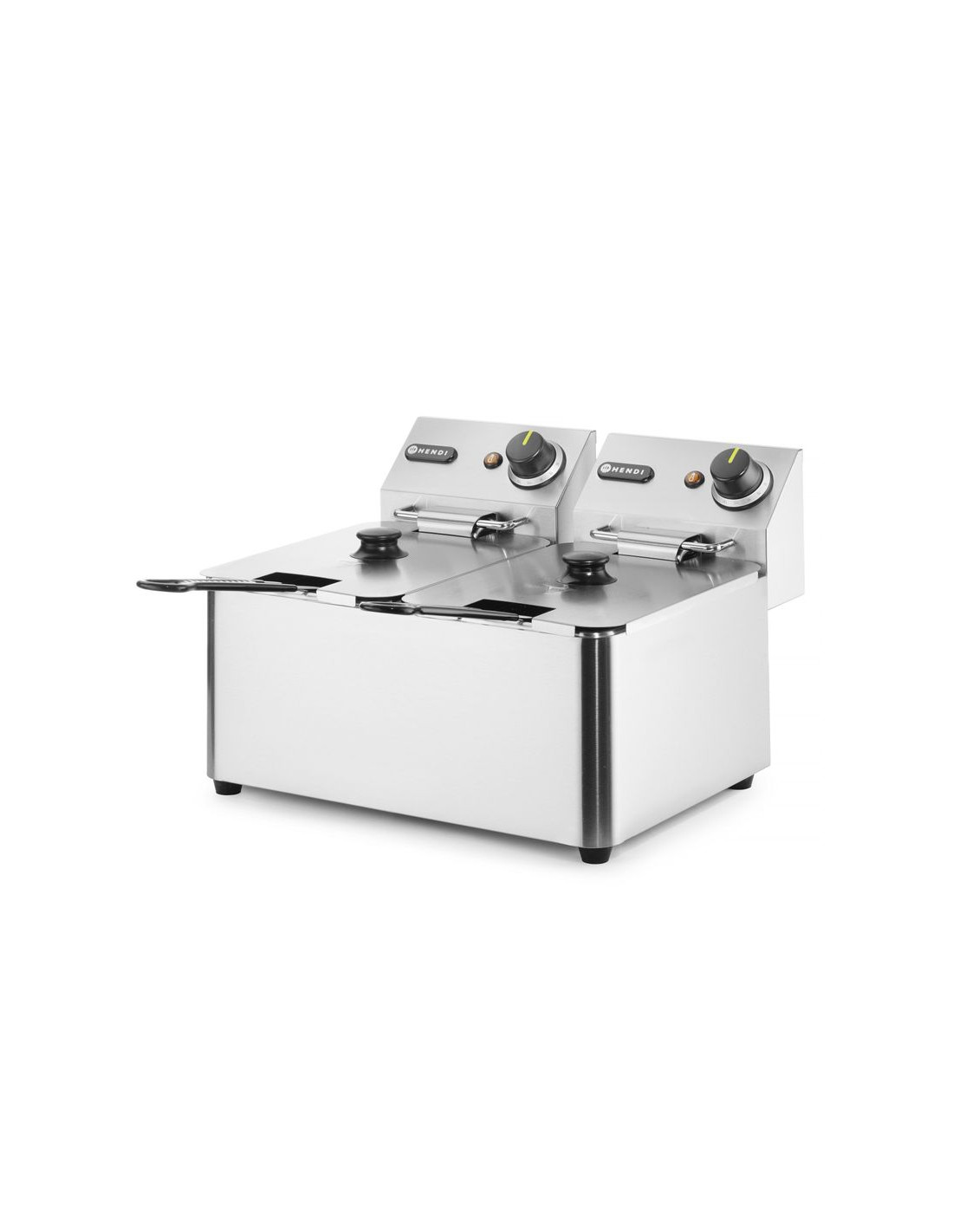 Med 2 värmeelement på 3000 W vardera. Varje element har sin egen strömförsörjning, därför behövs 2 uttag. Hölje och oljetank tillverkade av rostfritt stål. Avtagbart element med avstängningsfunktion när det tas bort. Avtagbar oljebehållare, vilket gör den enklare att rengöra. Värmeindikatorlampa som visar om värmeelementet är i drift. Temperaturen kan ställas in upp till 190 °C. En säkerhetstermostat säkerställer att fritösen inte överhettas. Överhettningsskydd med återställning för extra skydd. En stekkorg med värmeisolering och extra långt handtag. Kall zon för att skydda oljekvaliteten. Levereras med stekkorg och lock.