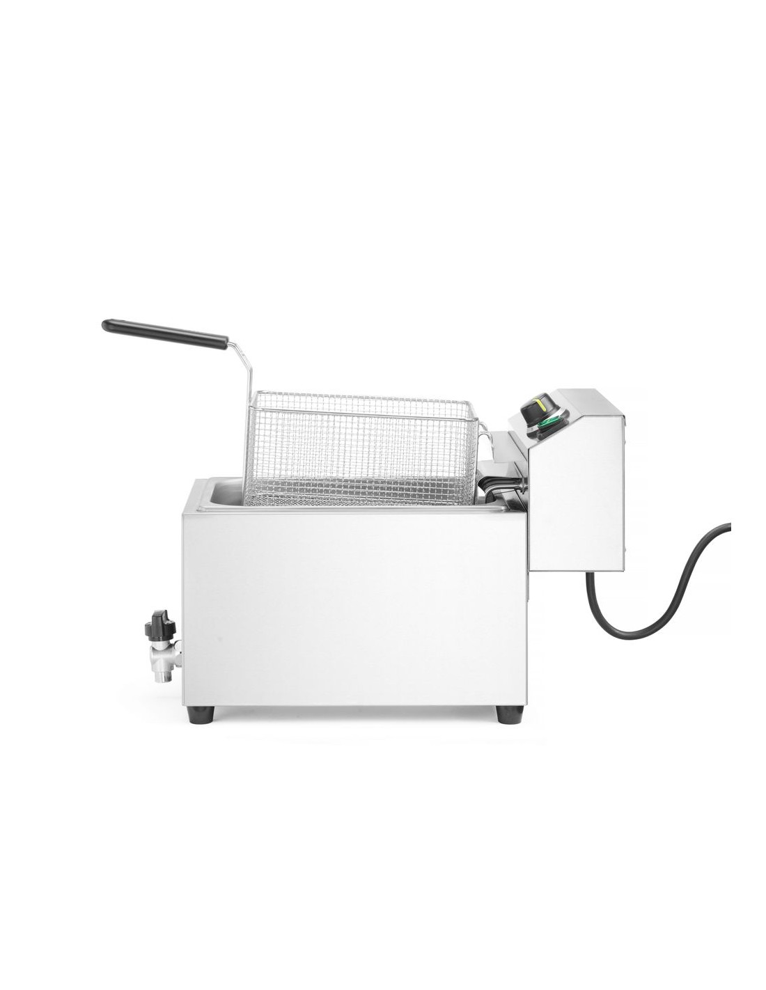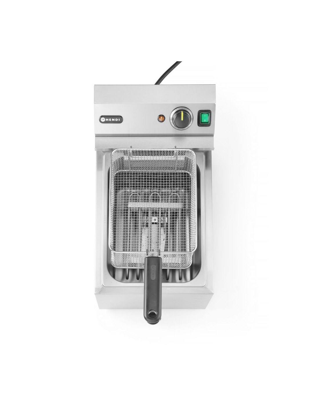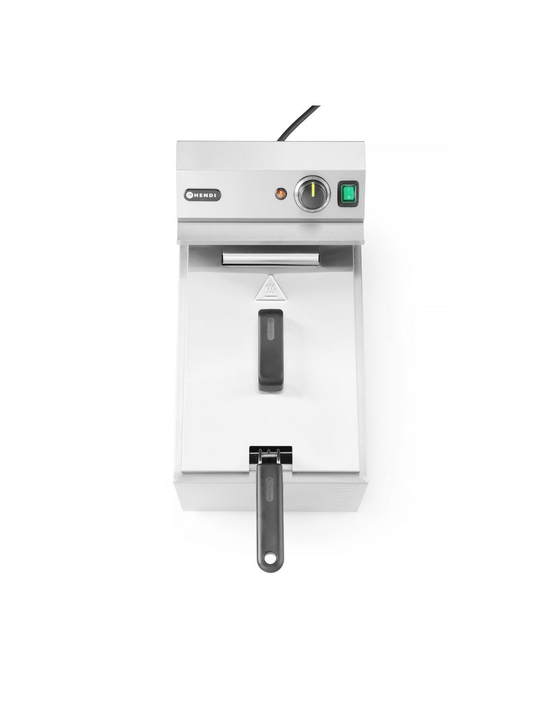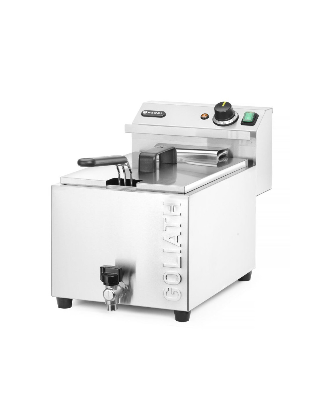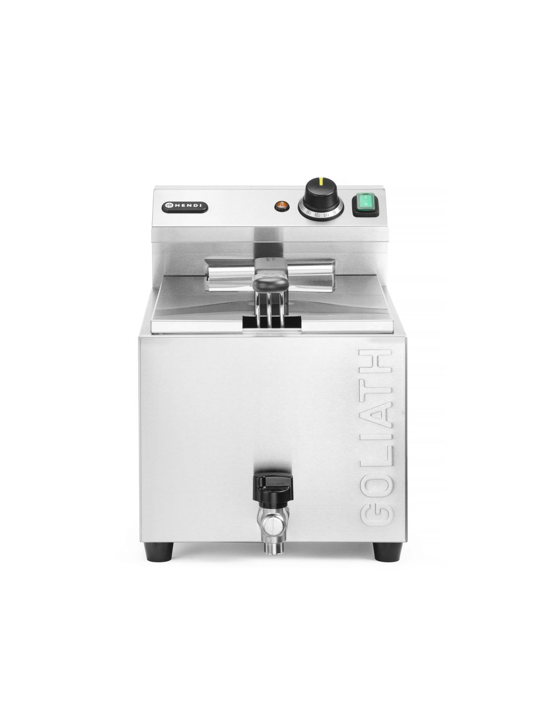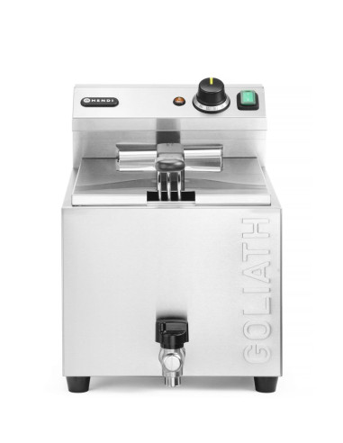 Fritös med marknadens högsta effekt i sitt kapacitetsområde – HENDI GOLIATH har en effekt på 10 200 W. Tillagar upp till 1 kg pommes frites på cirka 3 minuter – tack vare det extremt effektiva, extra starka värmeelementet. Mycket snabb uppvärmning av olja: cirka 5 minuter (beroende på omgivningsförhållanden). Höljet, tanken och locket är tillverkade av rostfritt stål som är motståndskraftigt mot höga temperaturer. Rymlig 10-liters tank med profilerad botten i form av bokstaven V – en ännu effektivare "kall" zon som förbättrar fritösens prestanda. Setet innehåller en mycket robust fritöskorg med måtten: 290x200x(H)142 mm, tillverkad av förnicklad tråd. Korgen är utrustad med ett långt handtag utan värme – 162 mm. Stöd för säker placering av fritösen i kammaren. Högkvalitativ termostat från den tyska tillverkaren EGO, med en kontrollampa som indikerar värmeelementets funktion. Avtagbar styrenhet och värmeelement, med inbyggt skydd som stänger av apparaten när enheten lyfts. Temperaturjusterbar inom intervallet: från 50 °C till 190 °C. Präglade min. och max. oljenivåindikatorer i kammaren. Avtappningskran för enkel tömning av oljebehållaren. Skydd mot överhettning med hjälp av en återställningsbar termosäkring. OBS: Installation av en elektriker krävs – enheten levereras utan kontakt.