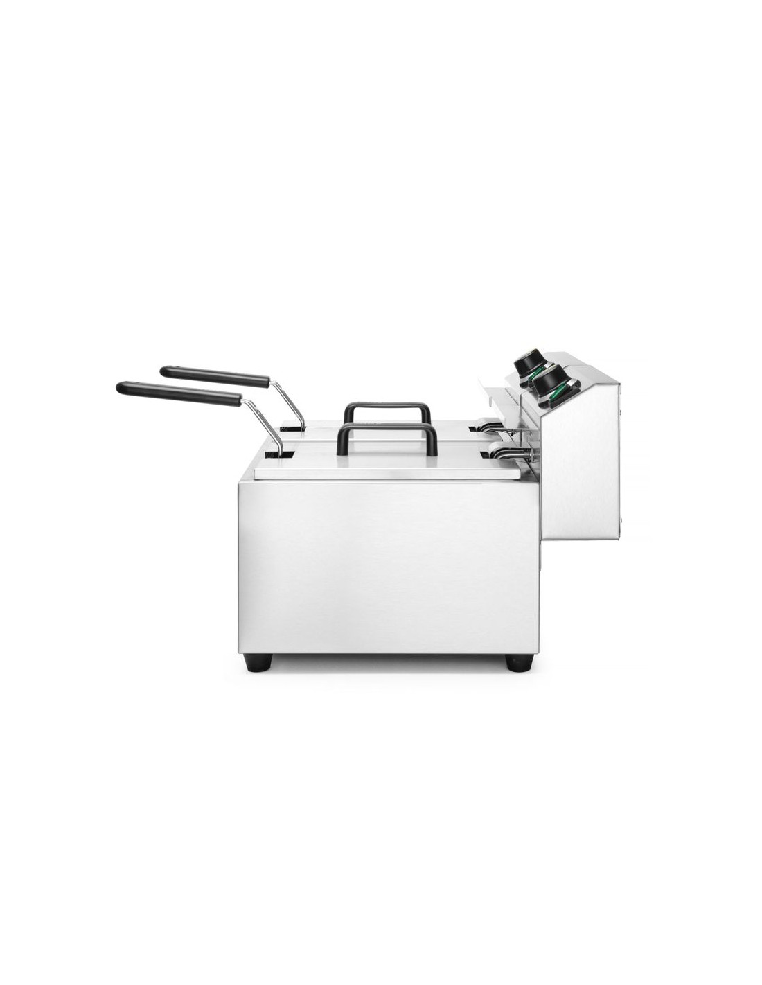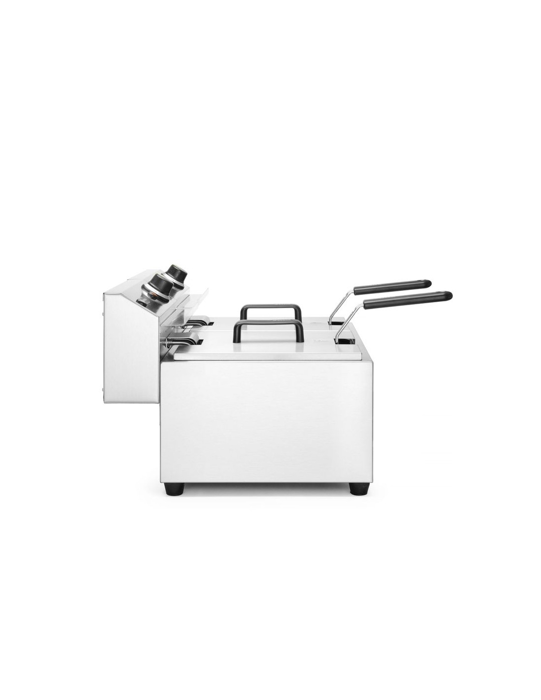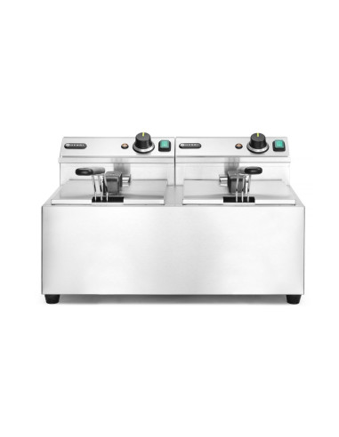 Profi Line fritöser är tillverkade av rostfritt stål 18/0. Avtagbart kontrollelement med en extra säkerhetsfunktion som stänger av fritösvärmaren när den tas bort. Fettbehållaren har en V-formad botten med en optimal "kallzon" för ökad fettutvinning. Lättavläst kontrollpanel med temperaturkontrollratt och indikatorlampa. Överhettningsskydd tack vare en återställningsbar termosäkring. Fritös korg med extra långt, svalt handtag för intensiv användning. Alla fritöser är utrustade med 1 fritös korg och 1 lock för varje kammare.