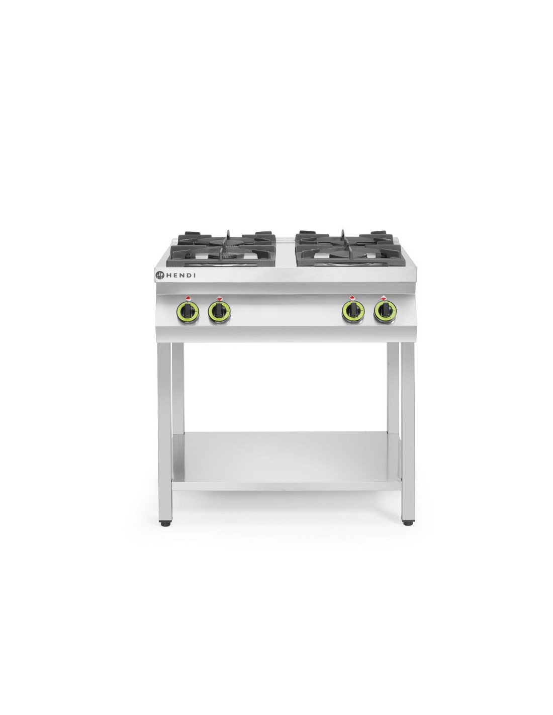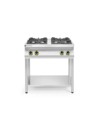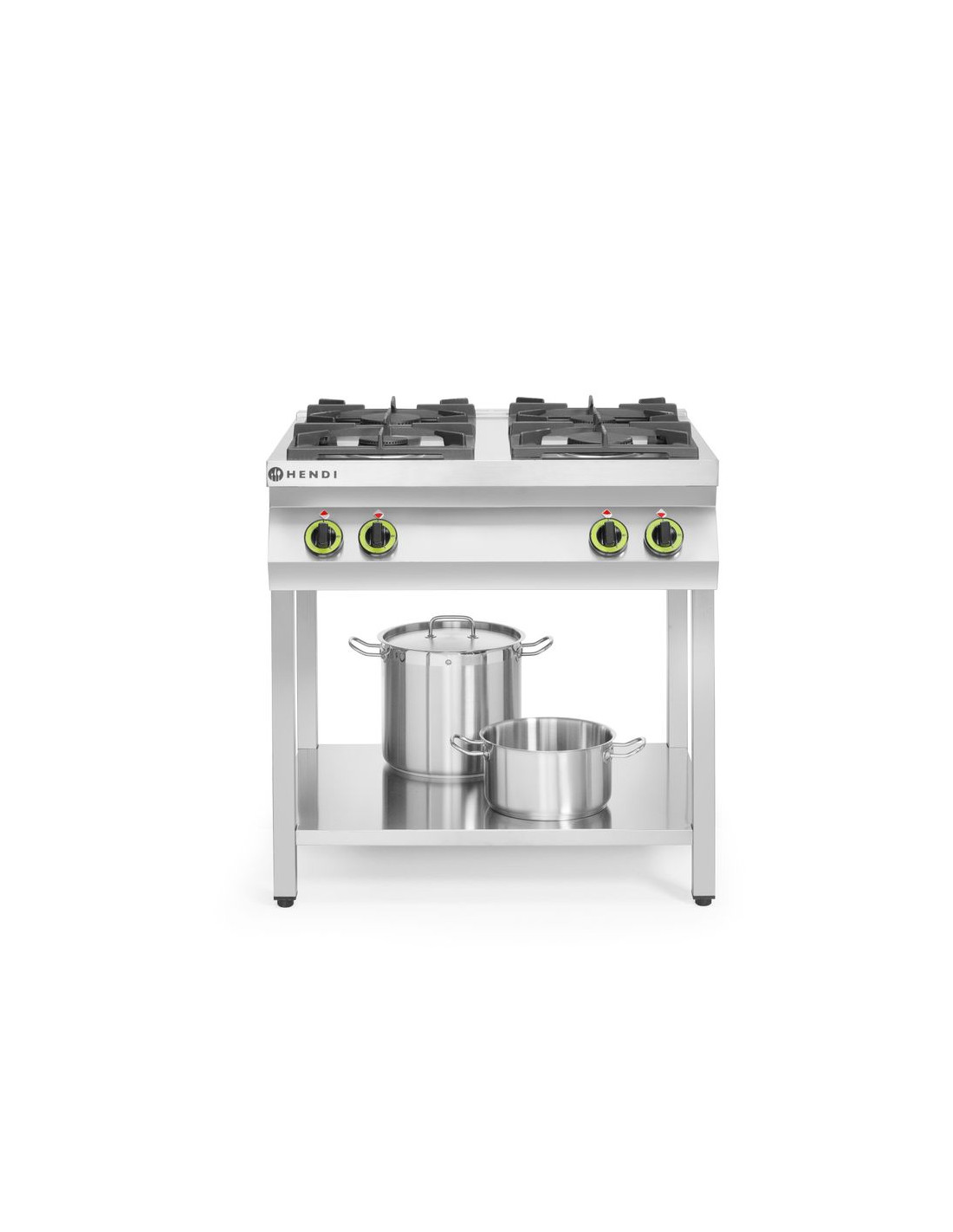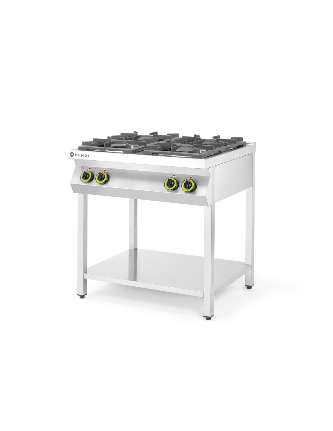 Tillverkad av rostfritt stål. Utrustad med 4 brännare: - 2 brännare på 6,0 kW - 2 brännare på 3,5 kW. Brännarna är utrustade med termoelement. Lämplig för kastruller från Ø 120 upp till 300 mm. Stekgrytor och brännare tillverkade av gjutjärn. Höjdjusterbara ben med halkfria fötter. Lämplig för naturgas, ombyggnadsset för gasol ingår. Obs: Ingen pilotlåga eller tändning, behöver tändas med tändstickor eller tändare. Vikt: 72 kg.