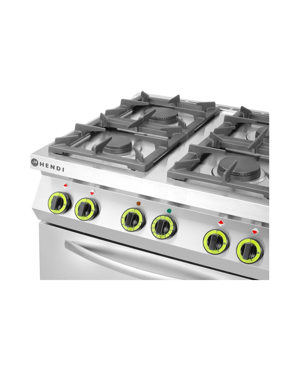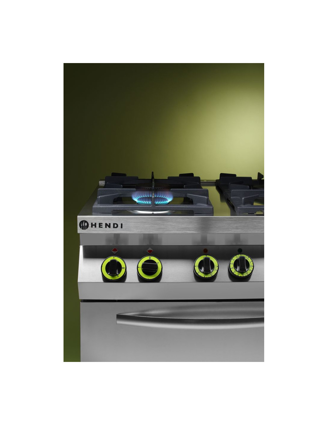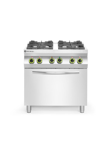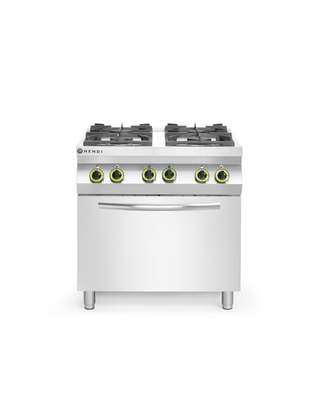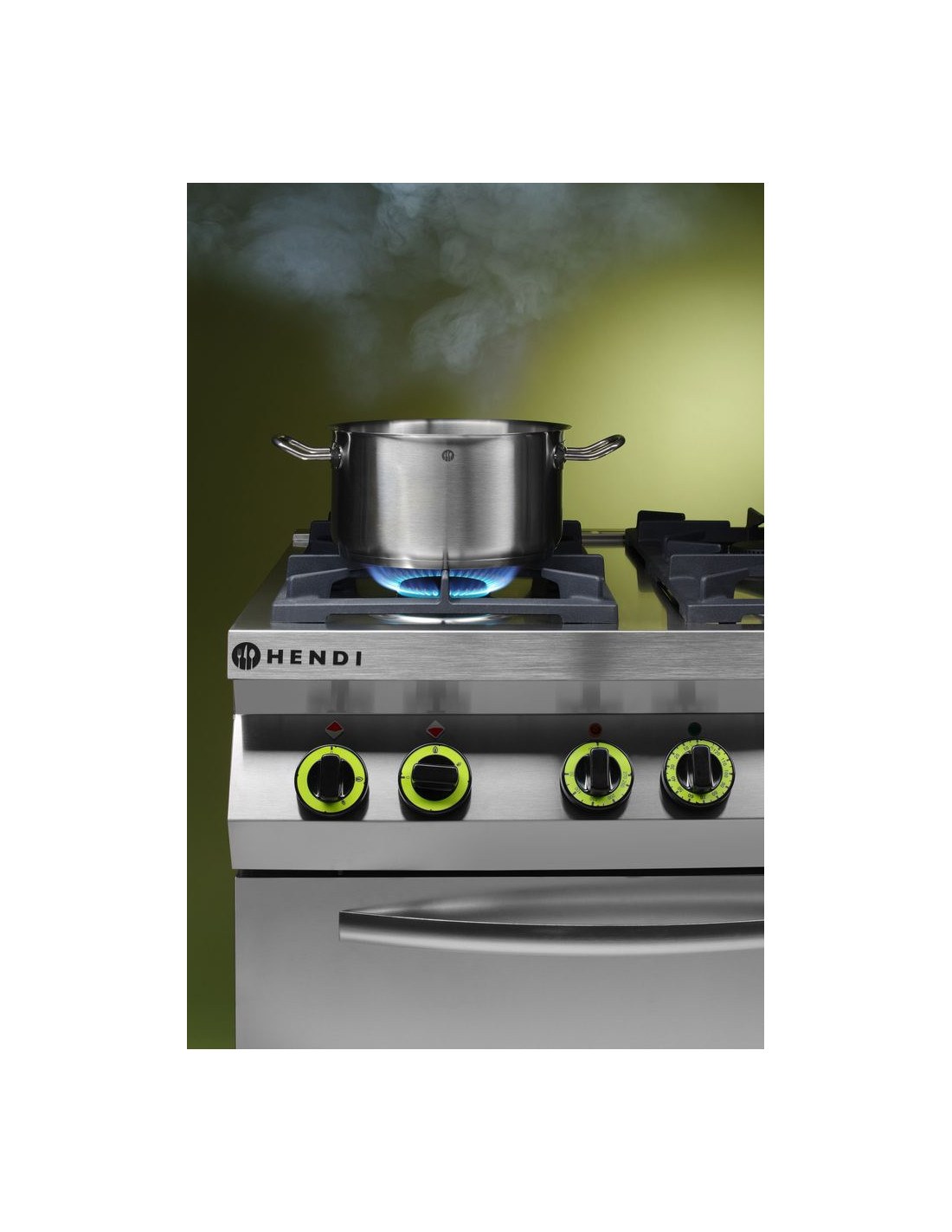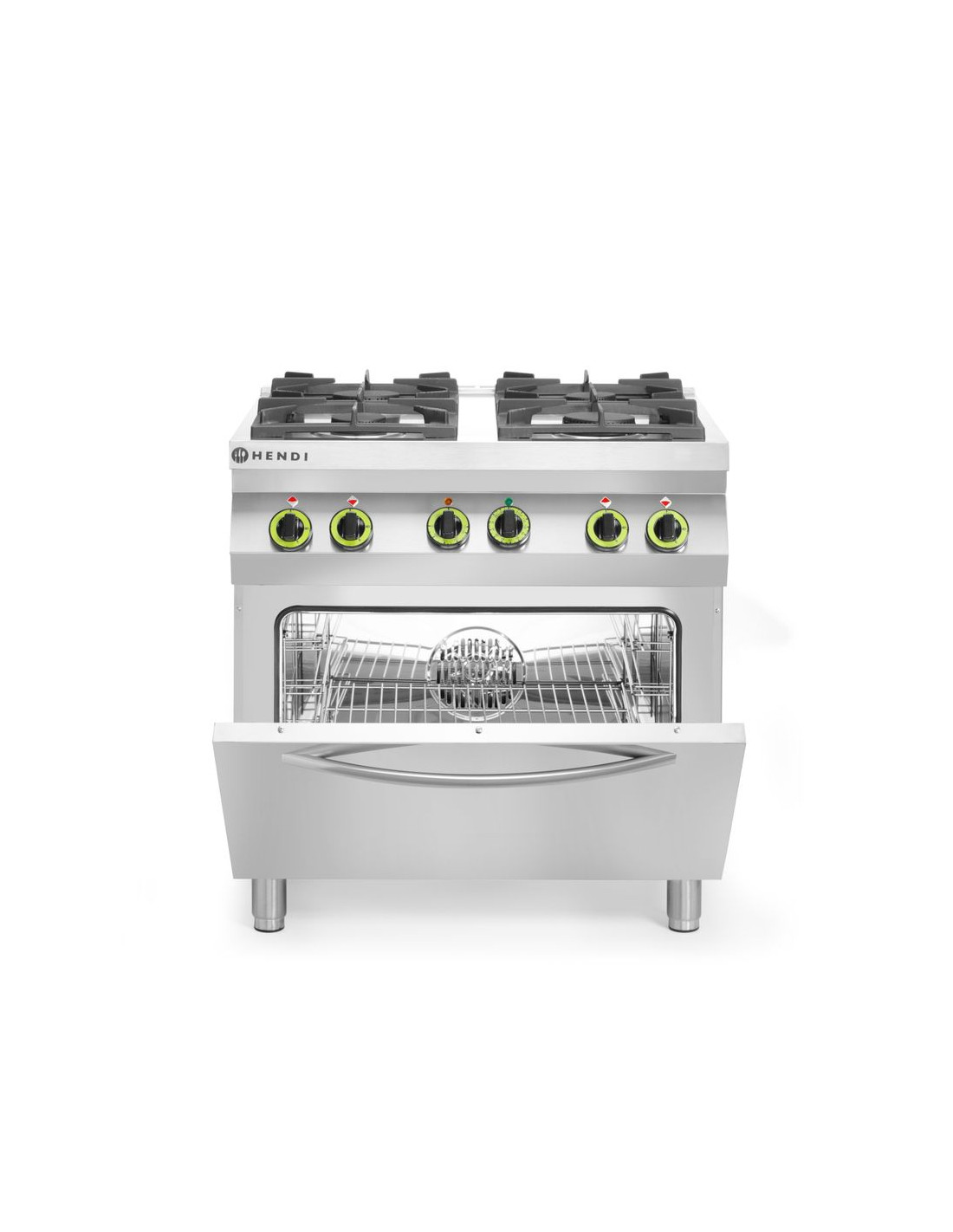 HENDI gasspis med 4 brännare i Kitchen Line och elektrisk ugn erbjuder 4 brännare kombinerat med en stor ugn. Brännarna har 2x 3,5 kW och 2x 6,0 kW och är lämpliga för kokkärl upp till Ø 300 mm. Den stora ugnen erbjuder plats för 4 GN 1/1-plåtar eller galler och levereras med ett galler.