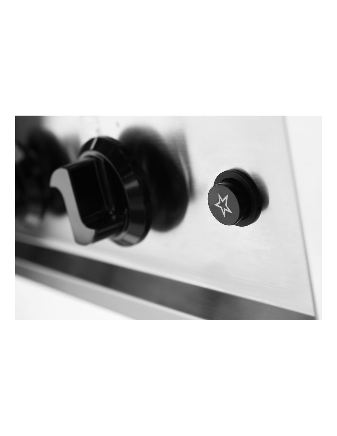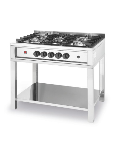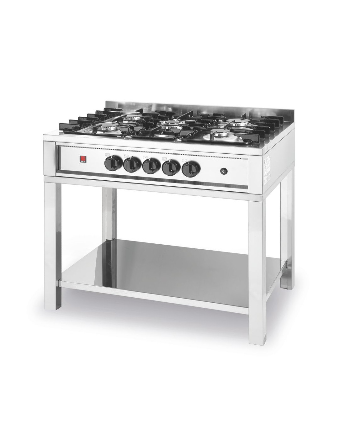 Tillverkad av rostfritt stål. Öppen ram erbjuder gott om förvaringsutrymme. Utrustad med 5 brännare: - 3 brännare på 3,0 kW. - 1 liten brännare på 1,8 kW. - 1 wokbrännare på 3,5 kW. Brännarna är utrustade med termoelement och piezotändning. 3-delat gjutjärnsstöd. Lämplig för naturgas. Vikt: 45 kg.