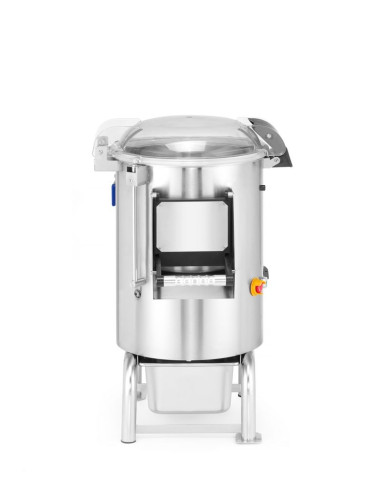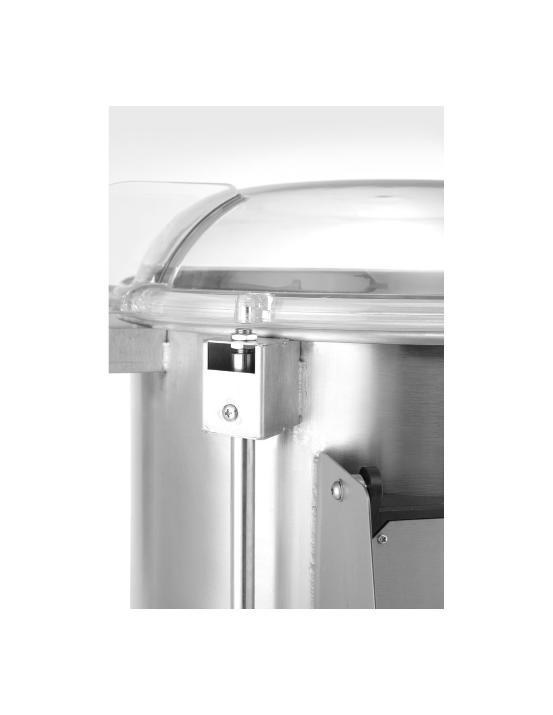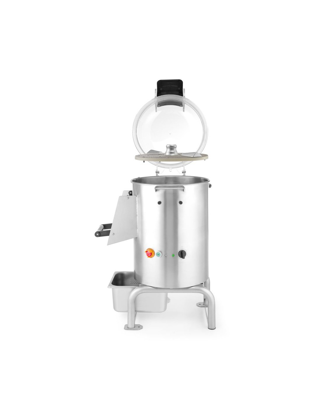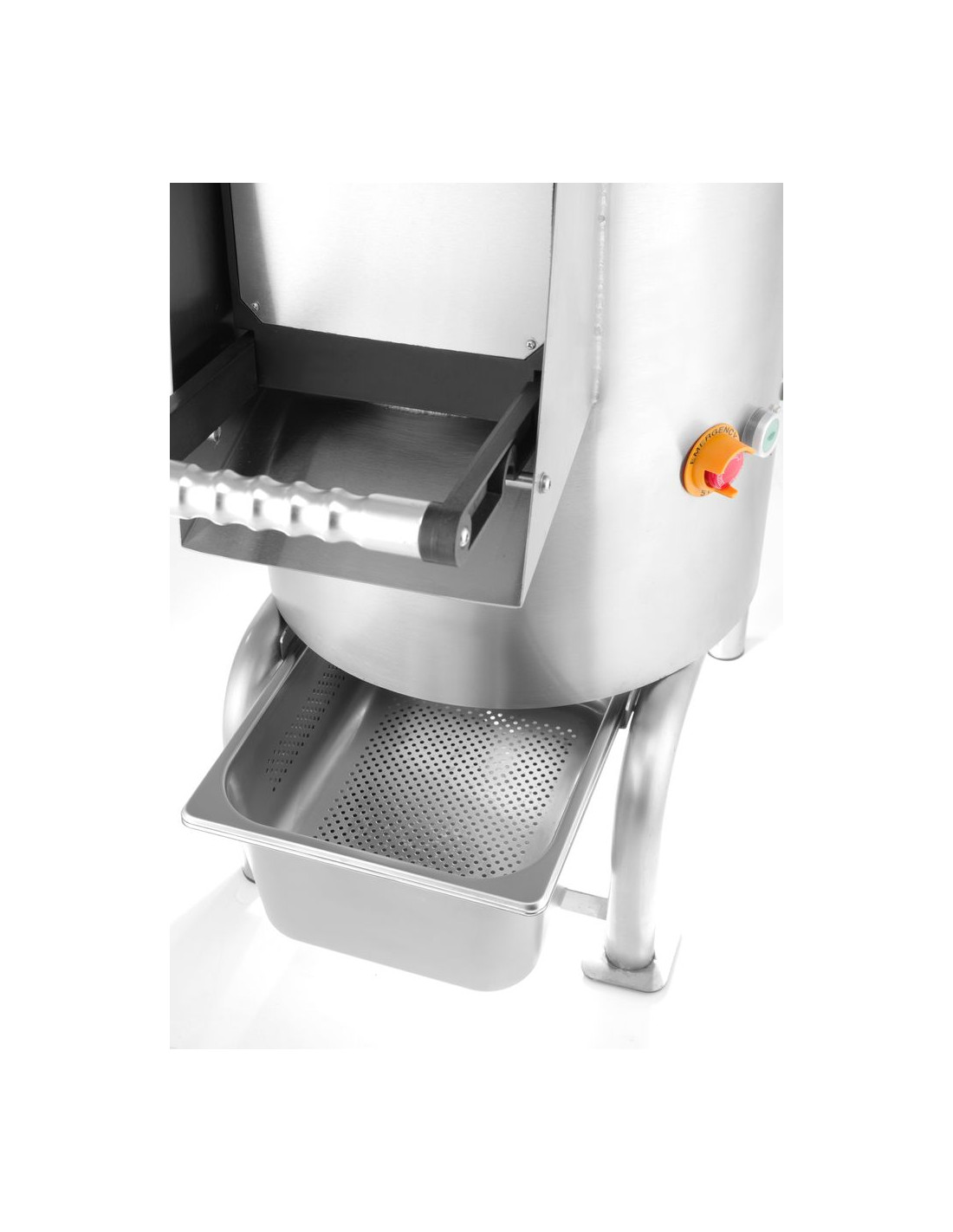 Skalar potatisen med hjälp av en slipskiva och slipkuddar på insidan av trumman. Trumma, skiva och slipkuddar är tillverkade av högkvalitativt rostfritt stål, vilket resulterar i en mycket hållbar, effektiv och lättrengjord maskin. Slipskivan är försedd med omrörare i aluminiumlegering. Locket är tillverkat av slitstark polykarbonat; låter dig hålla koll på skalningsprocessen. Tack vare den kraftfulla motorn tar en enda maskin bara 2 till 3 minuter. Kontrollpanel utrustad med en 8-minuterstimer och kontrollampor. Mycket säker att använda, en mikrobrytare stoppar skalaren när locket öppnas. Utrustad med en sötvatten- och avloppsanslutning för att skölja potatisen under skalning. Med en effektiv skaluppsamlingsfälla, består av 2 behållare varav en är perforerad, förhindrar igensättning av avloppssystemet. Benen är försedda med plastfötter för stabilitet, två ben har monteringsplattor för säker montering i golvet. Vattentålighetsklass: IP23.