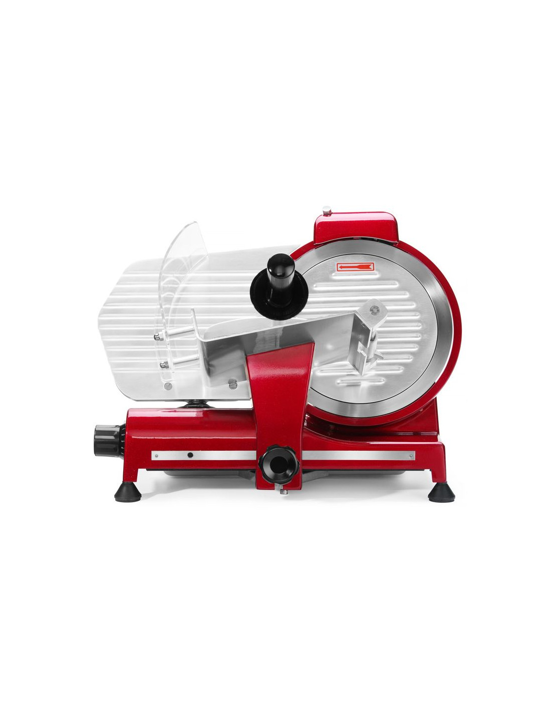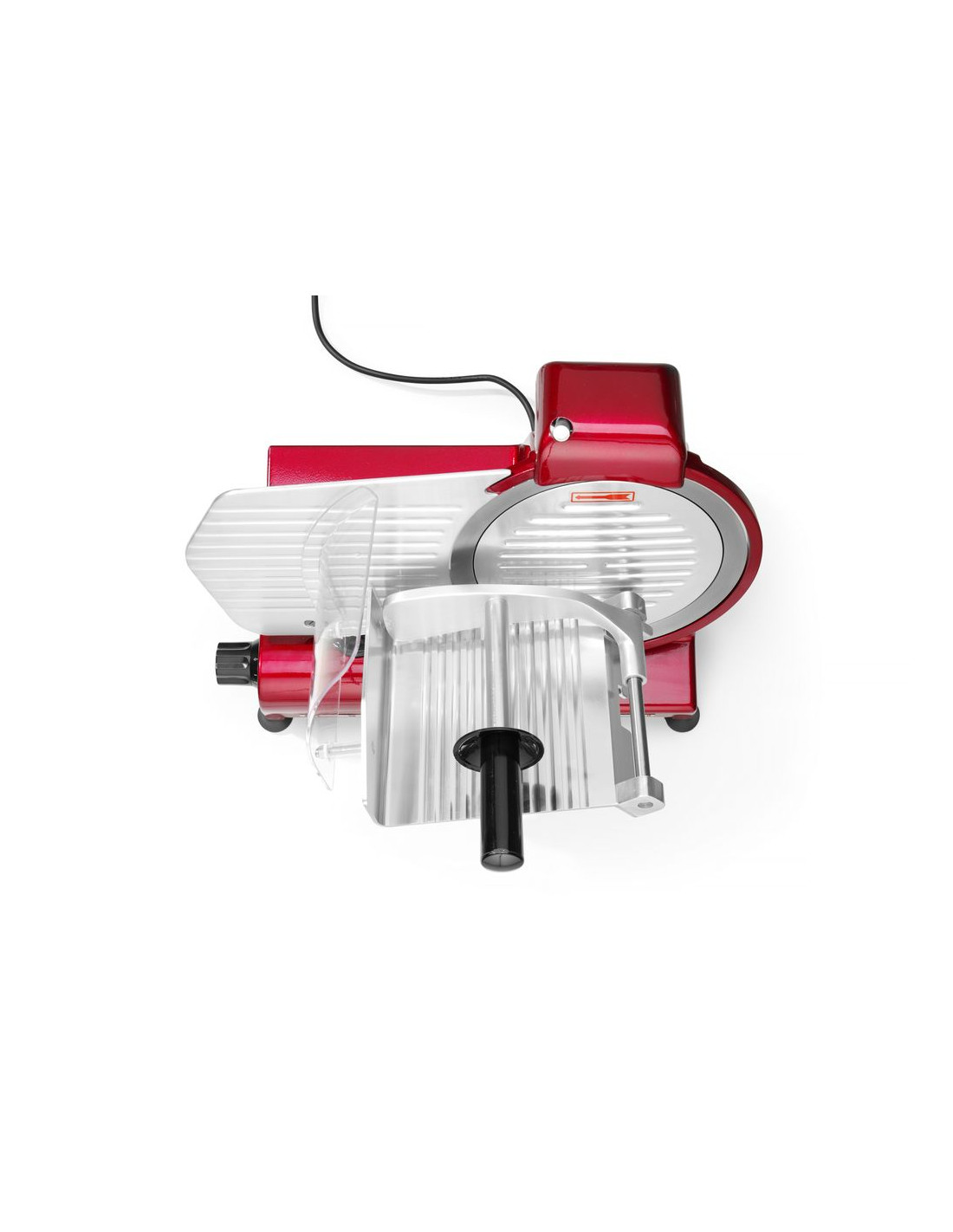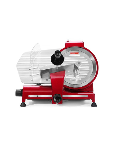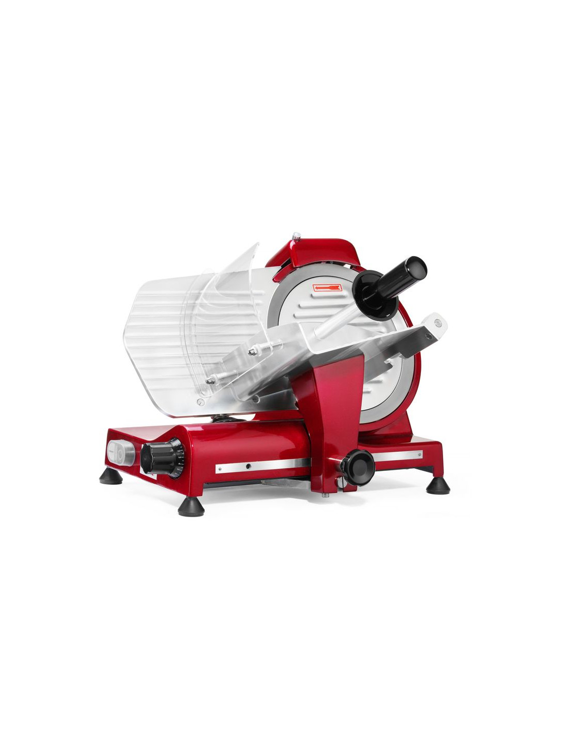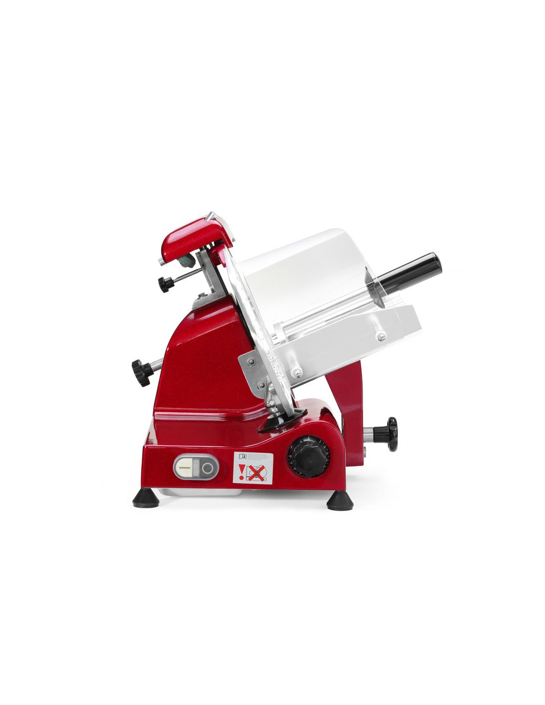 Hölje av belagd aluminium. Härdat rostfritt stålblad, vinklat. Luftkyld motor med överhettningsskydd. Kraftfull motor för att skära tufft kött. Utrustad med bladskydd och inbyggd slipmaskin. Vagn med säkerhetsskydd, klämelement och vertikal låsanordning. Snabb och enkel demontering för enkel rengöring. Uppfyller alla säkerhetskrav för utrustning för professionellt bruk, dvs: – genom att ställa in vredet på "0" skärtjocklek håller bladet sig bakom skyddet. – skydd mot oönskad start om slipmaskinen eller bladskyddet tas bort. – möjlighet att låsa och ta bort vagnen endast med bladet inställt i "0" skärtjockleksläge. Ej lämplig för att skära ost. Ostskivning möjlig med en separat tillgänglig non-stick kniv.