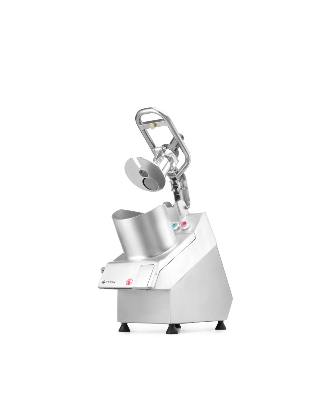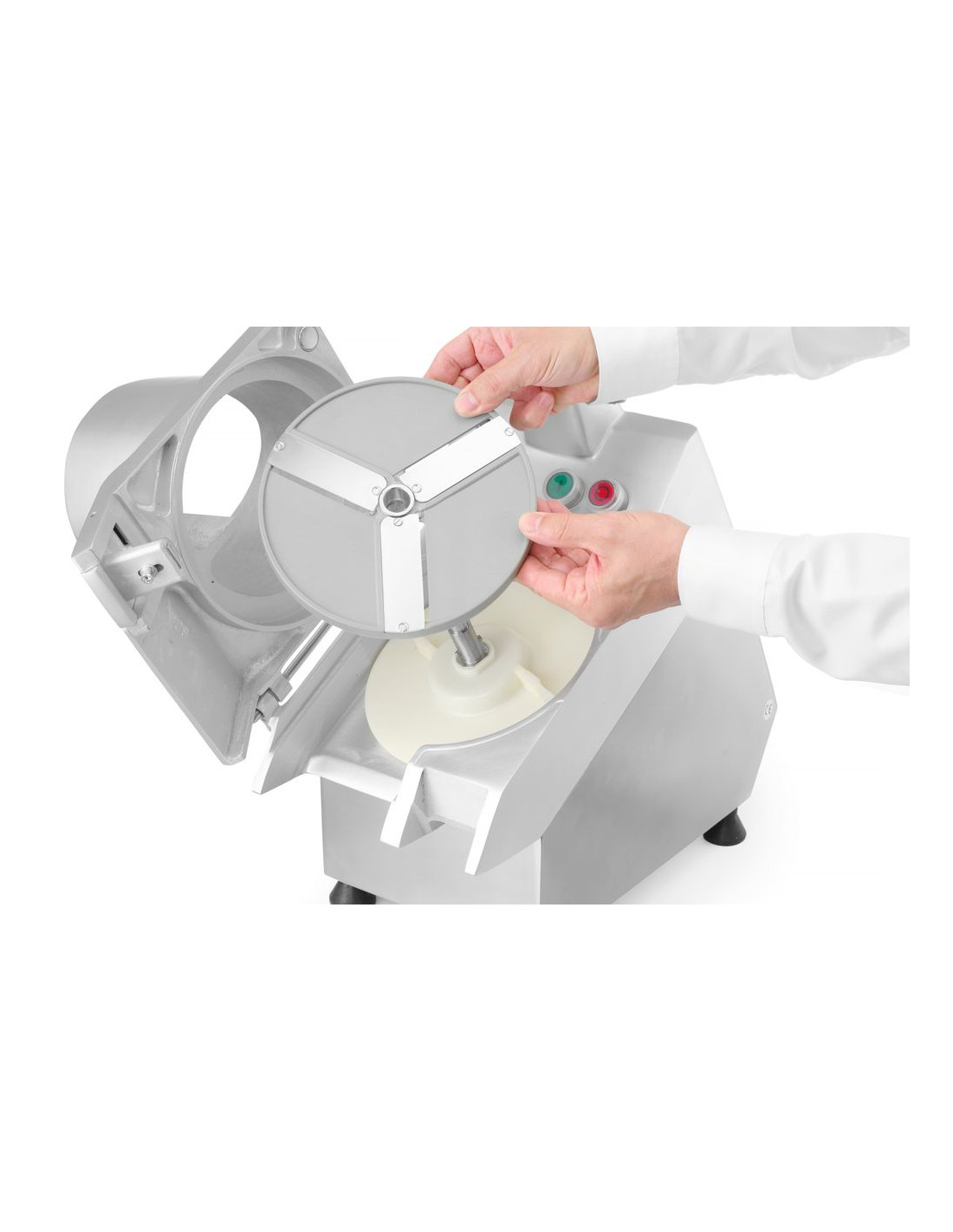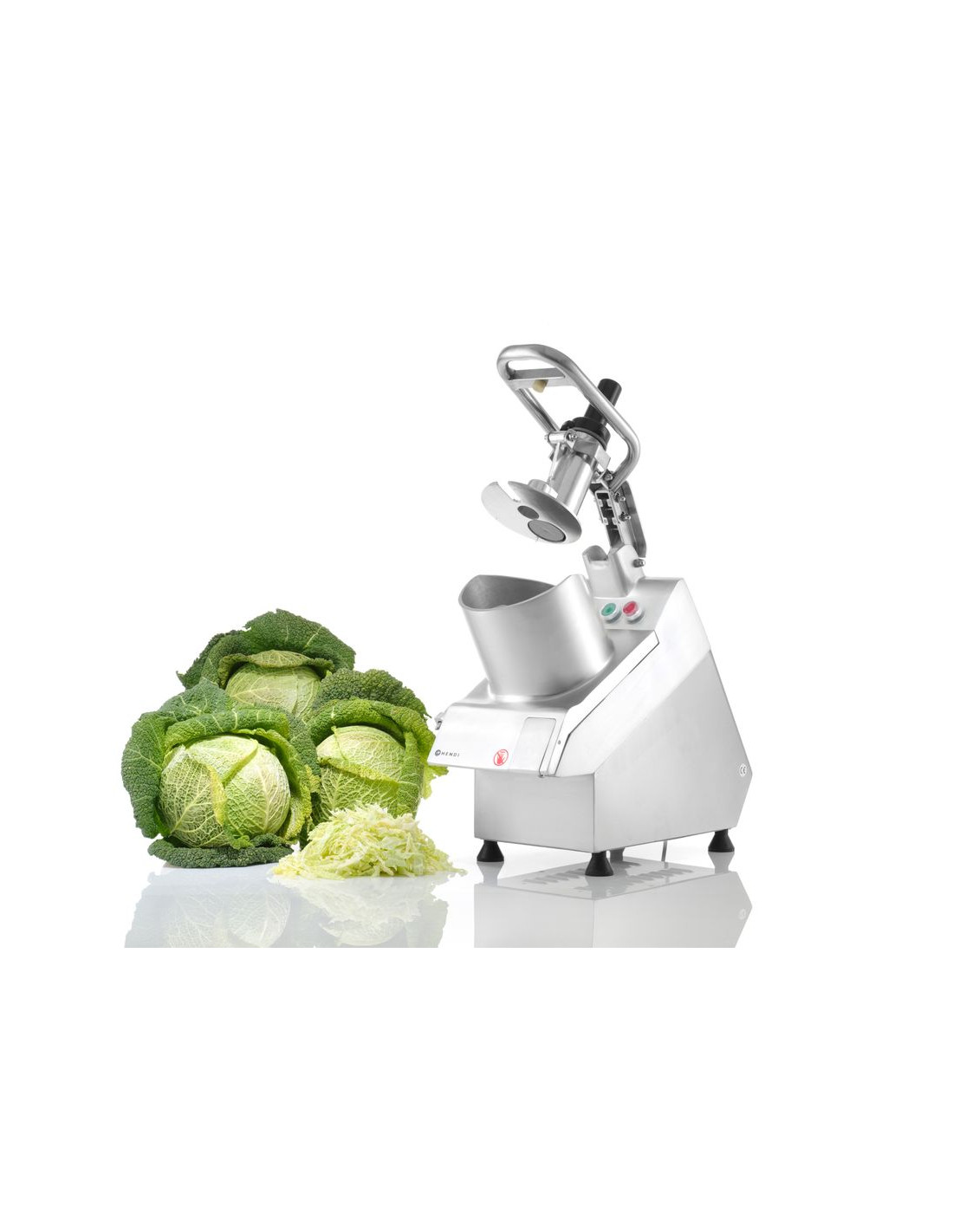 Utformad för att skära stora mängder grönsaker. Stort inlopp för stora grönsaker, upp till Ø 165 mm. Litet inlopp för långa grönsaker, t.ex. morötter, gurkor upp till Ø 55 mm. Skärkammarens hölje av gjuten aluminium, höljets nedre del av rostfritt stål. Praktiskt tryckhandtag. 750W = 1 hk luftkyld högpresterande motor. Lågspänningsknappar: STOPP, START (24 V). 2 säkerhetssystem: skäraren stängs av när tryckhandtaget lyfts och när kammarens övre lock lyfts. När tryckhandtaget sänks startar skäraren automatiskt. Enkelt och snabbt byte av skärskivor. 5 skärskivor ingår: 2 mm skivor (skiva med 3 blad), 4 mm skivor (skiva med 3 blad), 3 mm rivjärn, 4,5 mm rivjärn, 7 mm rivjärn, utkastarskiva. 4 halkfria gummifötter. Hastighet: 300 RPM. Produktivitet: 100 – 350 kg/h. Vikt: 25 kg.