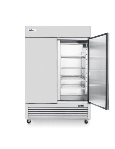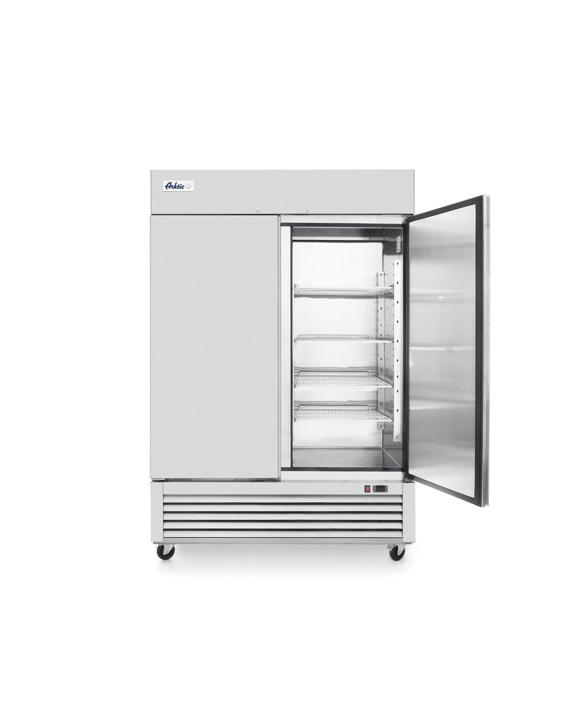Arktic-kylskåpet på 1300L erbjuder hållbar och effektiv kylförvaring med ett hölje i rostfritt stål och fläktassisterad statisk kylning. Det inkluderar en låsbar, självstängande dörr, användarvänliga digitala kontroller och smidig mobilitet med fyra hjul. Kompatibel med Gastronorm 2/1-fack och utrustad med flera hyllplan.