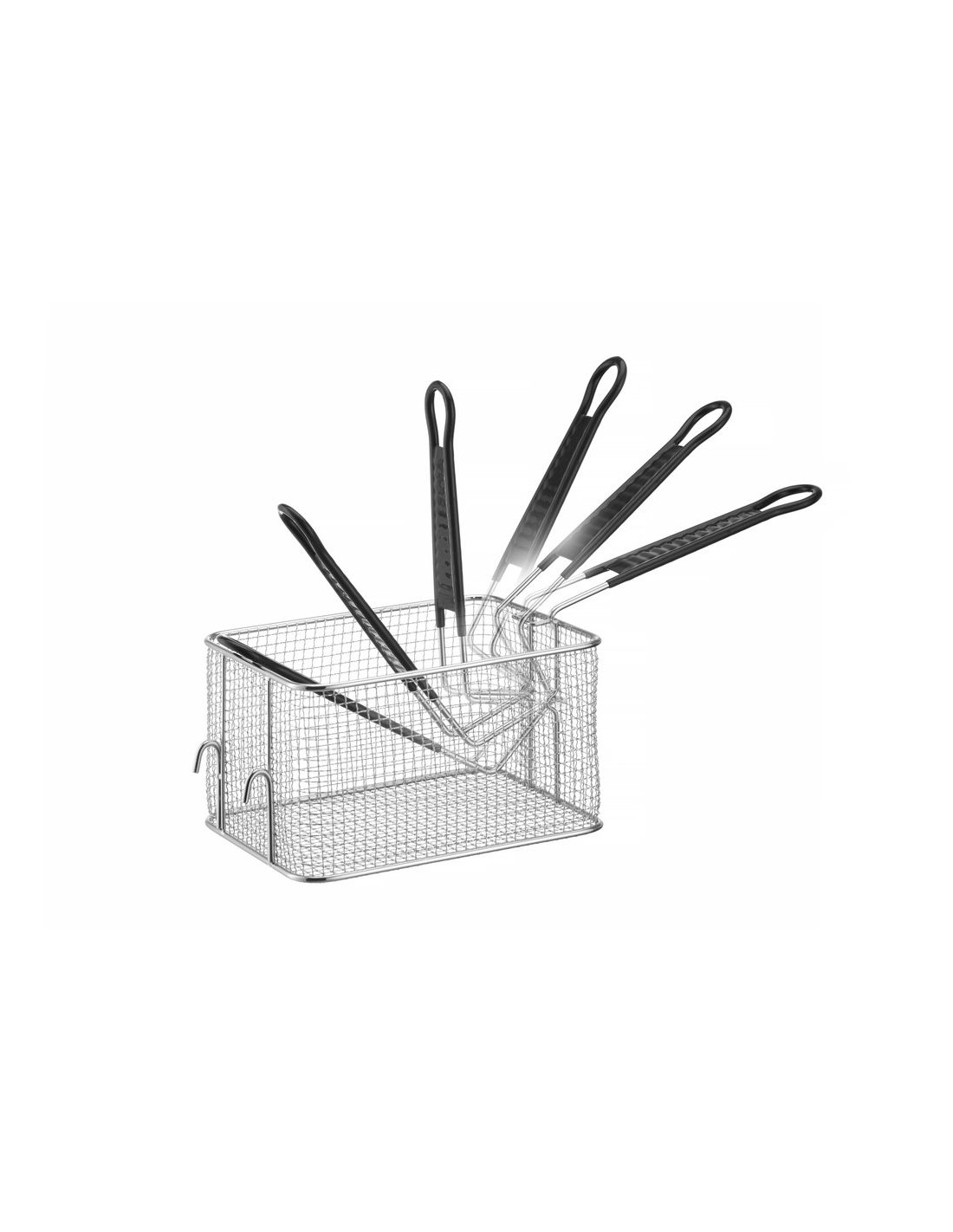 Hållbar konstruktion i rostfritt stål. Finmaskigt nät för jämn stekning och snabb oljedränering. Värmeisolerat ergonomiskt handtag. Lätt att rengöra och underhålla. Utformad för att passa specifika HENDI-fritösmodeller.