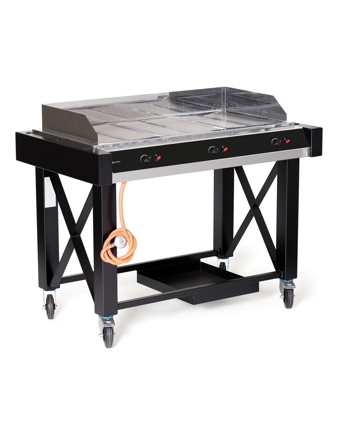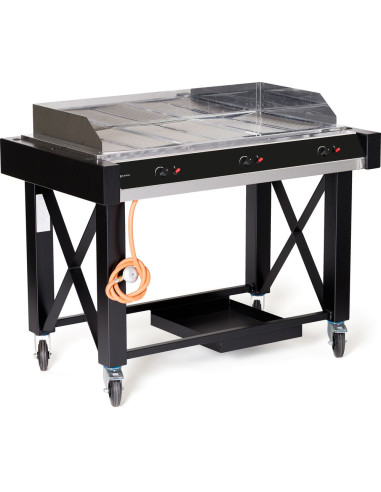 Atlanta har utmärkta tillagningsegenskaper tack vare optimal värmefördelning och varmluftscirkulation inuti brännarens hölje. Den höga temperaturen bryner köttet jämnt och snabbt, vilket minskar vidhäftningen till gallret även när gallret inte har smorts. De 3 separat justerbara tvärgående brännarna har termoelementsäkerhet och elektronisk tändning. Brännaraggregatet är helt tillverkat av rostfritt stål och gallren är avtagbara för enkel rengöring. De tre brännarna gör det också möjligt att dela upp ytan i separata värmezoner för samtidig tillagning av kött, grönsaker och fisk. Atlanta har en helt svart epoxibelagd ram med fyra hjul och en säker gasflaskhållare. Tack vare den djupa gasflaskhållaren kan du placera gasflaskan säkert under grillen. Stekyta: 1100 x 500 mm.