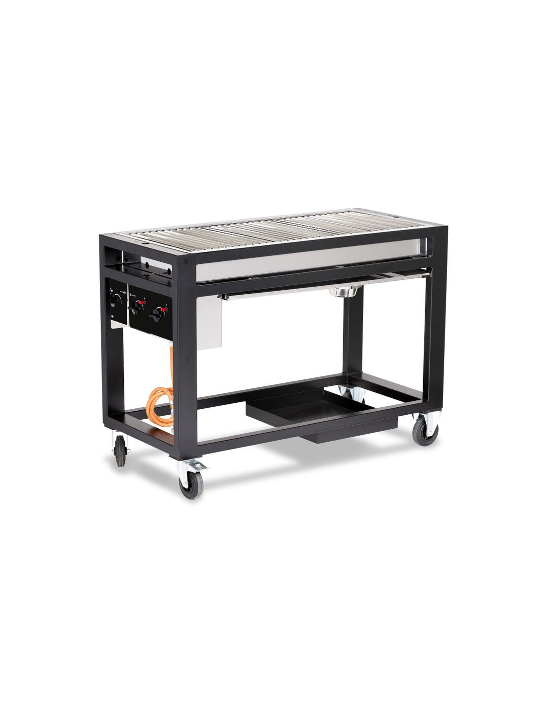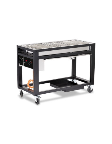 Europa-grill har utmärkta tillagningsegenskaper. Den höga temperaturen bryner köttet jämnt och snabbt, vilket minskar vidhäftningen till gallret även när gallret inte har smorts. De tre separat justerbara, längsgående brännarna har termoelementsäkerhet och elektronisk tändning. Europa 3 har en helt svart epoxibelagd ram med fyra hjul, varav två är länkhjul, och en säker gasflaskhållare. Fett som dräneras från köttet under tillagningen leds genom en speciell kanal till en fettuppsamlare. Tack vare den djupa gasflaskhållaren kan du placera gasflaskan säkert under grillen. Europa 3 levereras komplett med lavastenar och en stekpanna. Stekyta: 1100 x 500 mm.