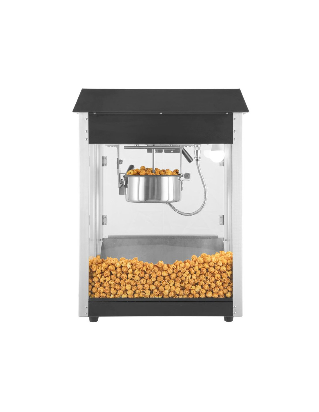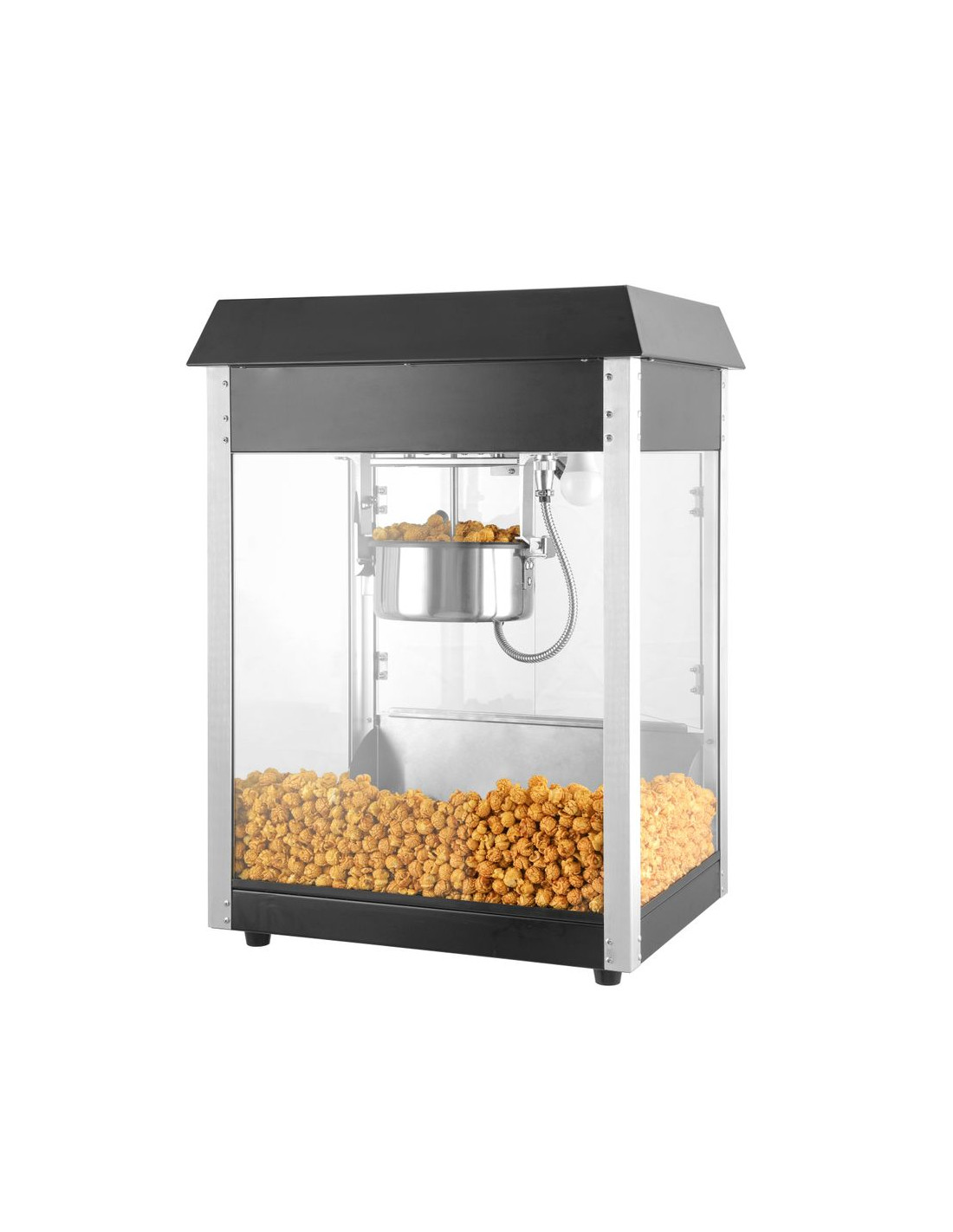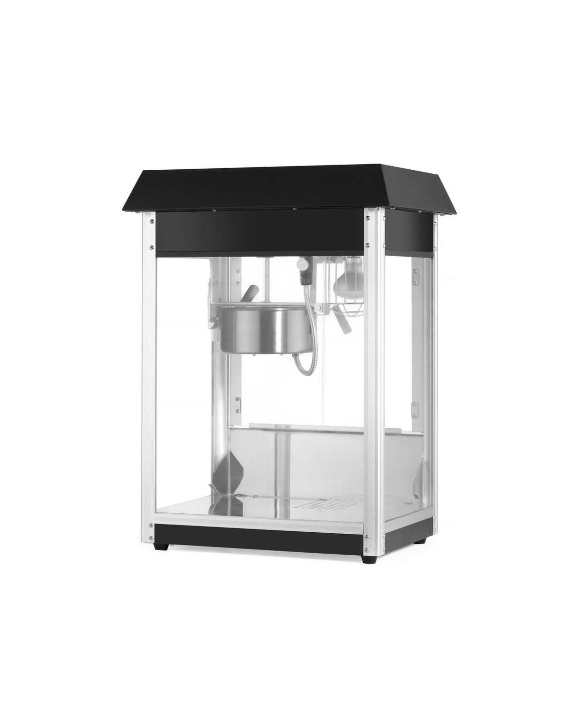Ram tillverkad av aluminiumlegering. Robust hölje av härdat glas och pulverlackerat stål i två färger tillgängliga: röd eller svart. Med gångjärnsförsedd servicelucka av härdat glas. Popcornvärmepanna med omrörningsenhet. Lock med handtag av icke-värmande material. Lucka för popcornuppsamling. Smullåda under kammaren för enkel bortskaffning av opoppade kärnor och smulor. Opoppade kärnor och smulor samlas upp under smullådan. Belyst insida. Uppvärmd botten av popcornkammaren. Cykeltid: ≤ 2 min. – 150 g majskorn per cykel.