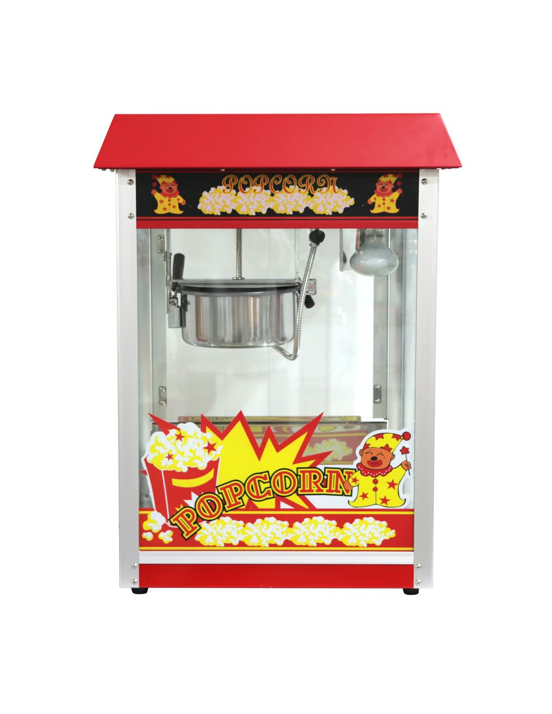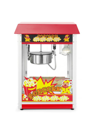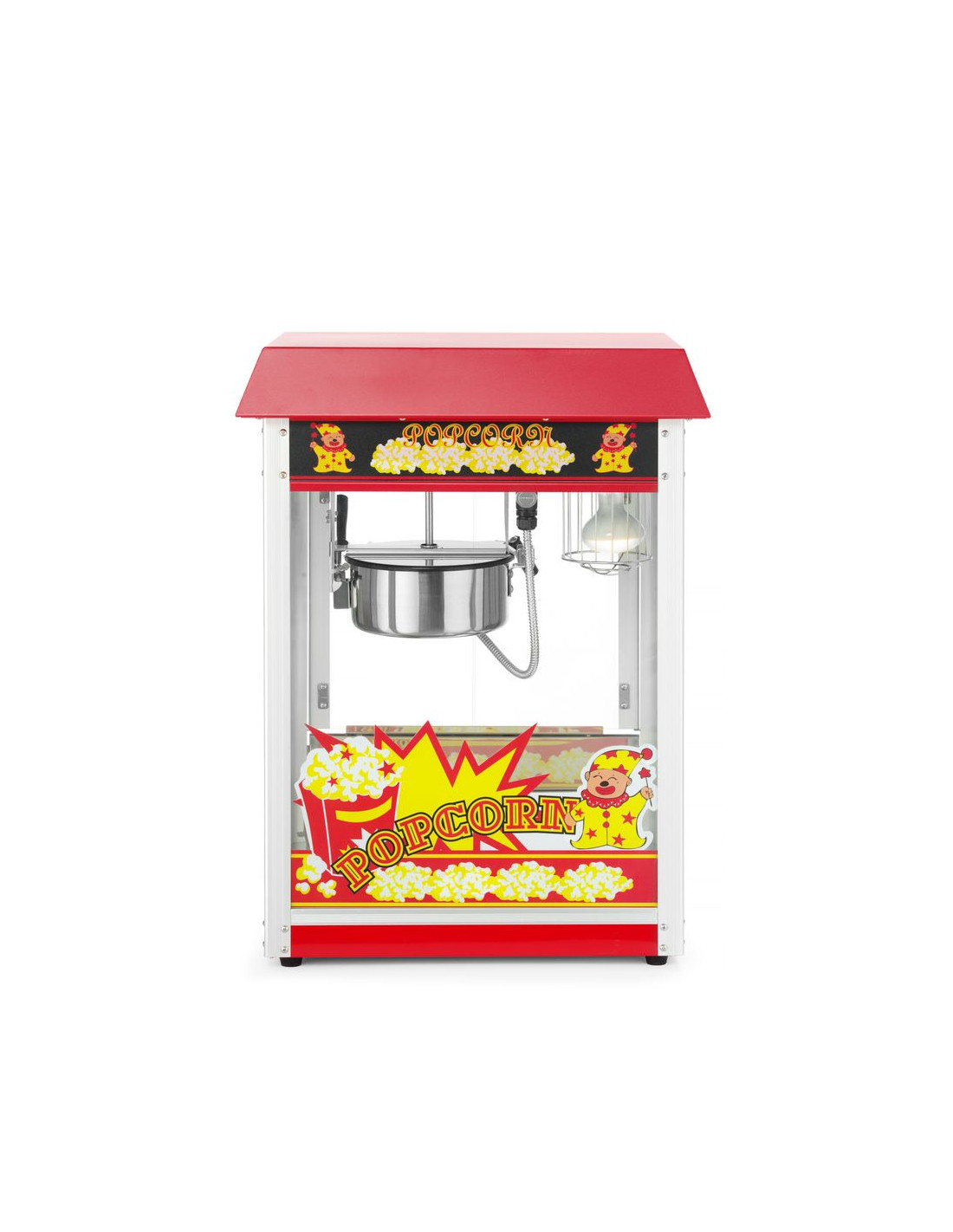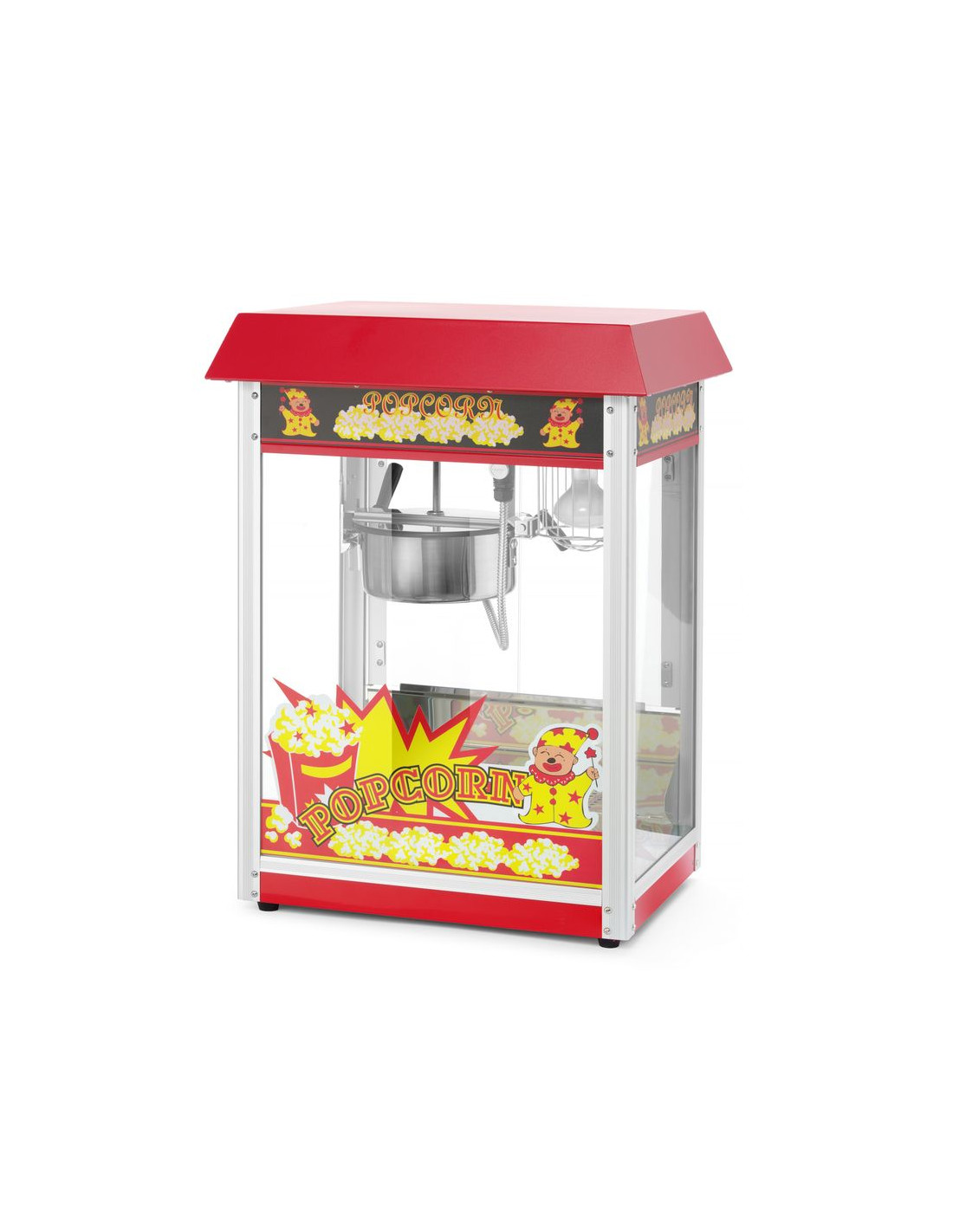 Ram tillverkad av aluminiumlegering. Robust hölje av härdat glas och pulverlackerat stål i två färger tillgängliga: röd eller svart. Med gångjärnsförsedd servicelucka av härdat glas. Popcornvärmepanna med omrörningsenhet. Lock med handtag av icke-värmande material. Lucka för popcornuppsamling. Smullåda under kammaren för enkel bortskaffning av opoppade kärnor och smulor. Opoppade kärnor och smulor samlas upp under smullådan. Belyst insida. Uppvärmd botten av popcornkammaren. Cykeltid: ≤ 2 min. – 150 g majskorn per cykel.