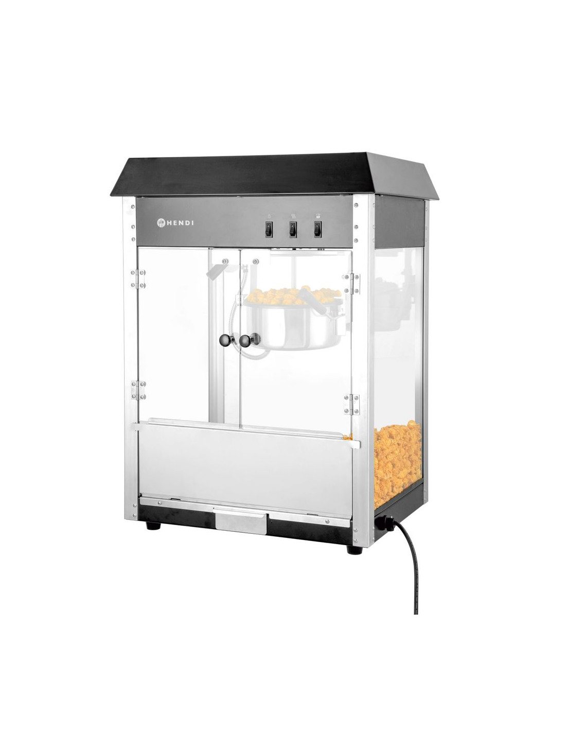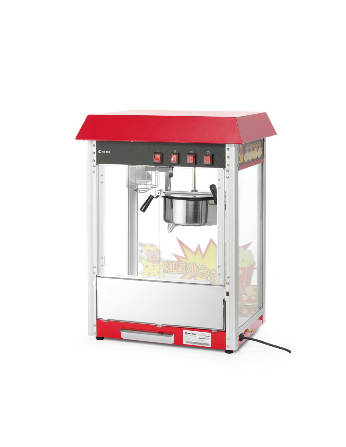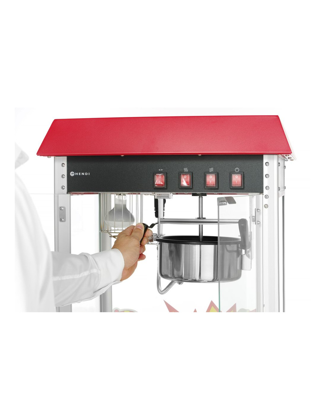 HENDI popcornmaskin producerar popcorn från 150 g majskorn på en gång. Finns i två färger: röd med iögonfallande klistermärken och svart minimalistisk utan klistermärken.