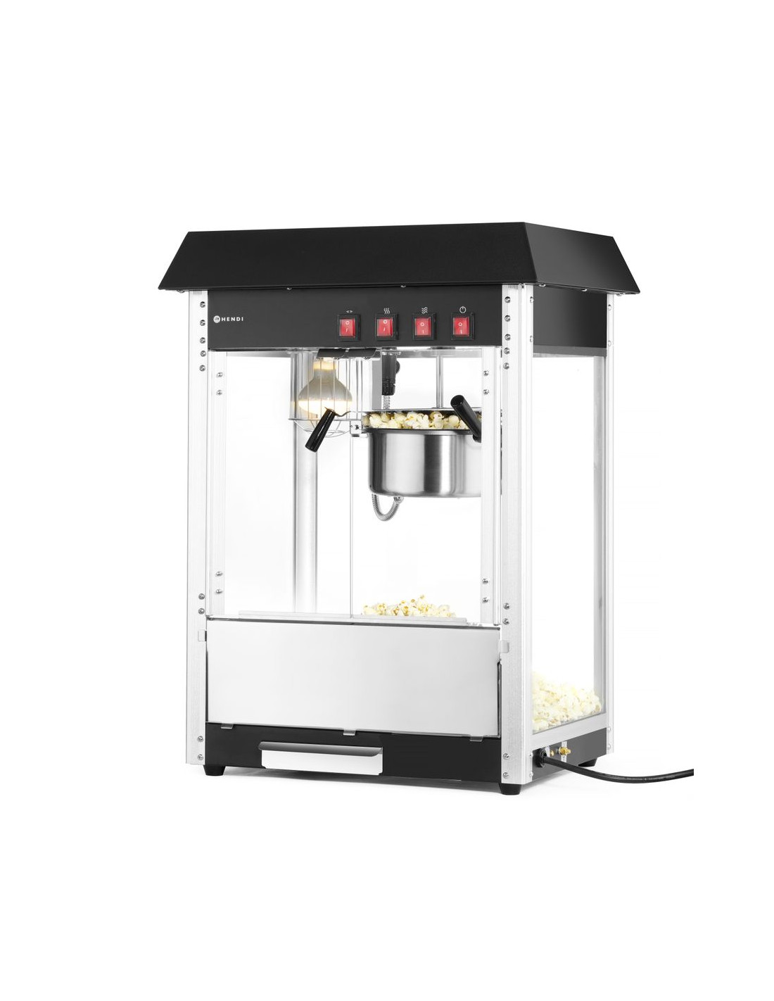 HENDI popcornmaskin producerar popcorn från 150 g majskorn på en gång. Finns i två färger: röd med iögonfallande klistermärken och svart minimalistisk utan klistermärken.