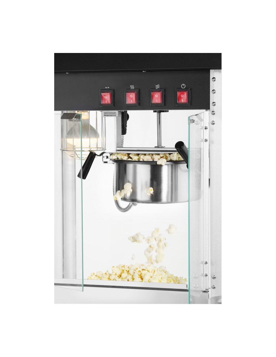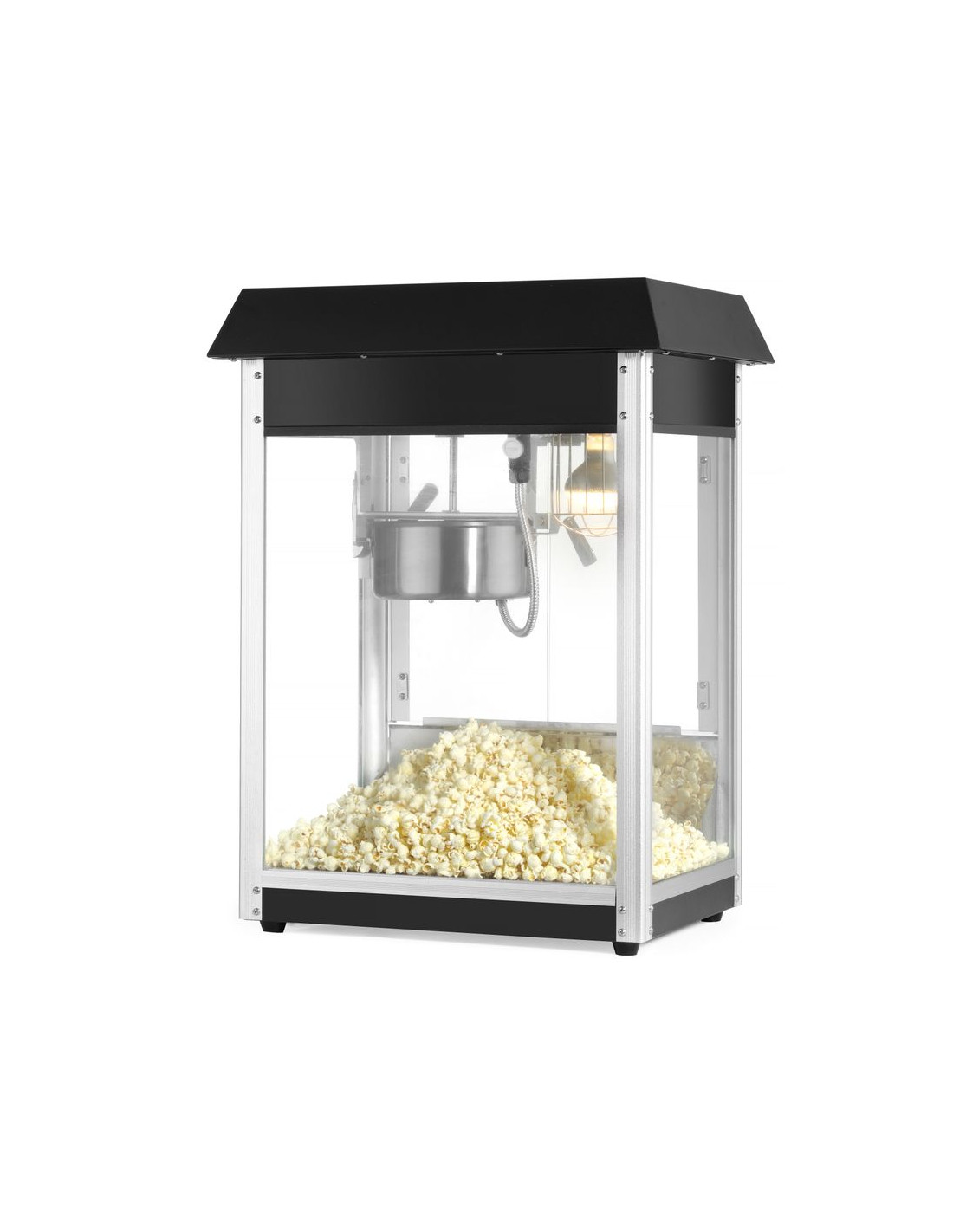 Ram tillverkad av aluminiumlegering. Robust hölje av härdat glas och pulverlackerat stål i två färger tillgängliga: röd eller svart. Med gångjärnsförsedd servicelucka av härdat glas. Popcornvärmepanna med omrörningsenhet. Lock med handtag av icke-värmande material. Lucka för popcornuppsamling. Smullåda under kammaren för enkel bortskaffning av opoppade kärnor och smulor. Opoppade kärnor och smulor samlas upp under smullådan. Belyst insida. Uppvärmd botten av popcornkammaren. Cykeltid: ≤ 2 min. – 150 g majskorn per cykel.