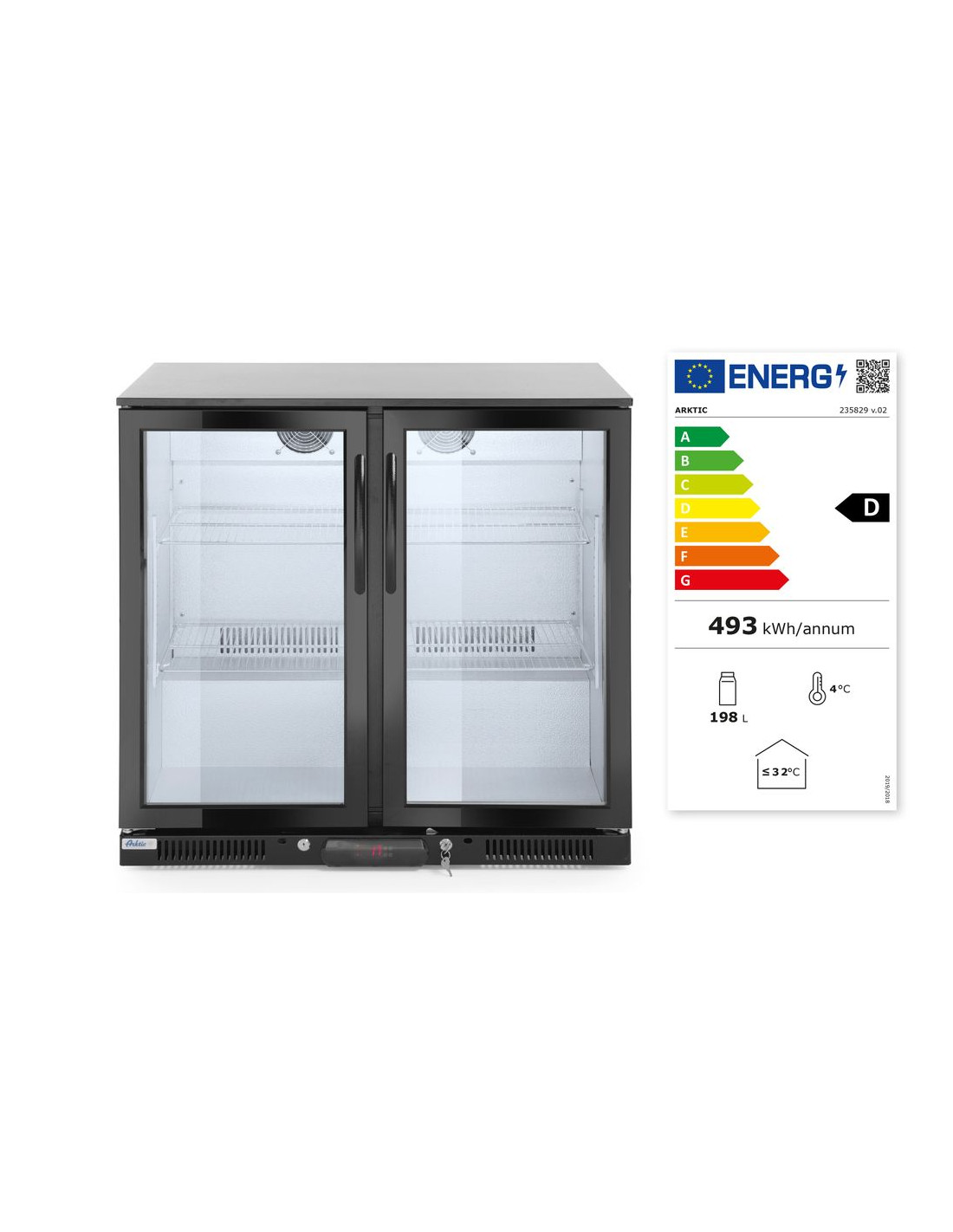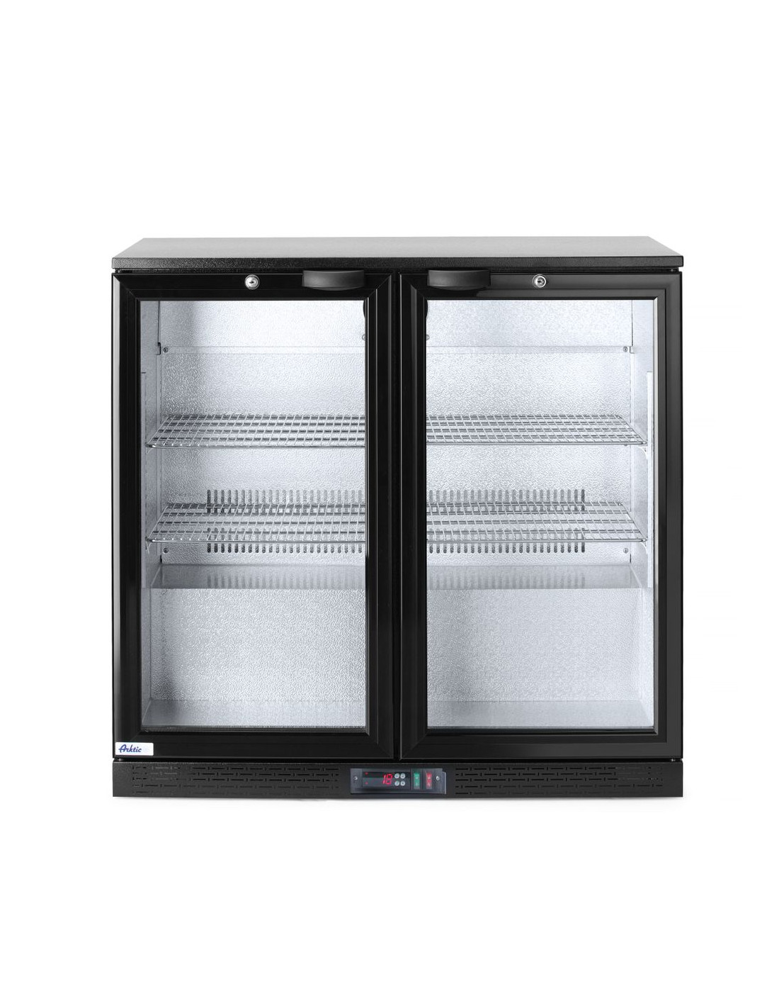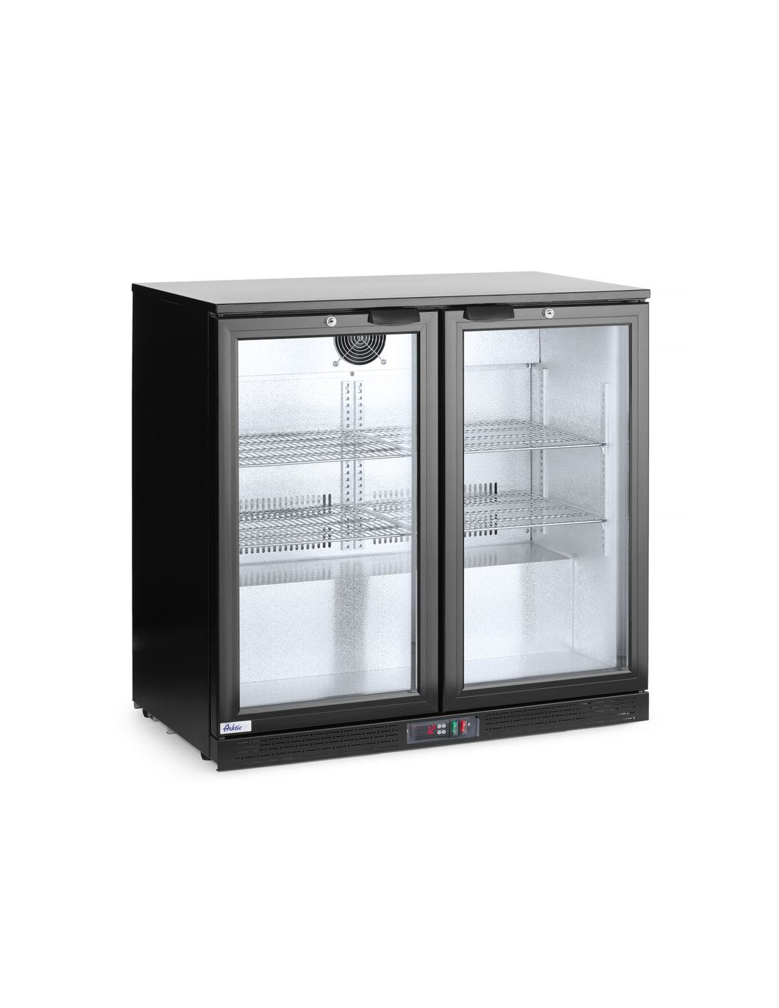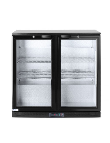 Rymlig barkyl med dörrar i härdat glas. Utrustad med LED-belysning för att presentera produkter.