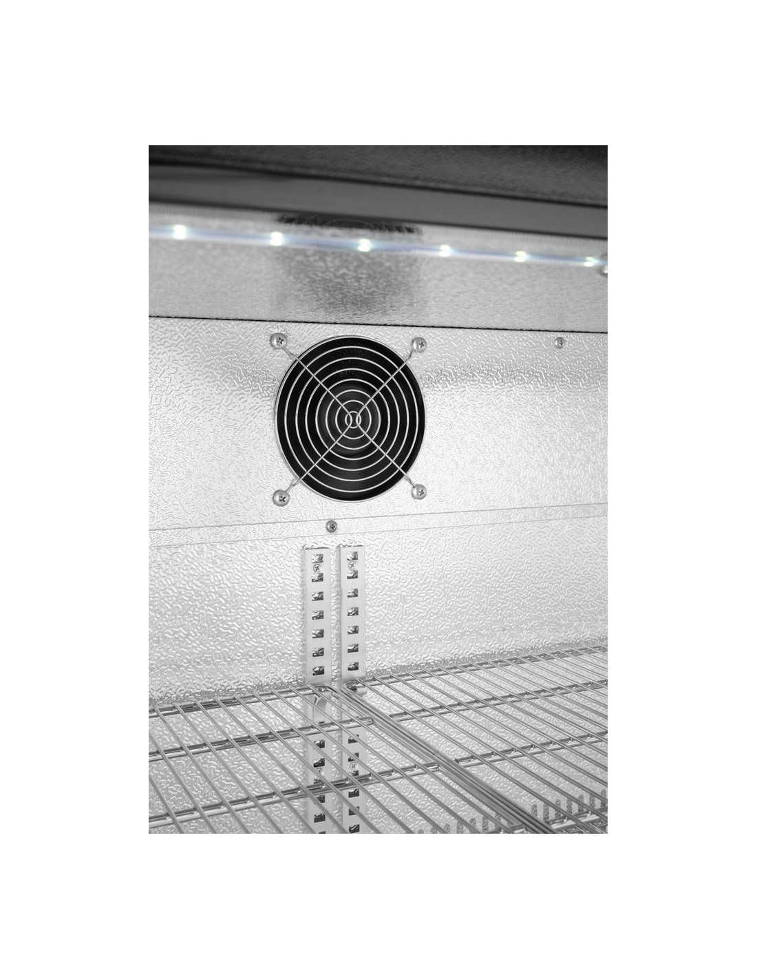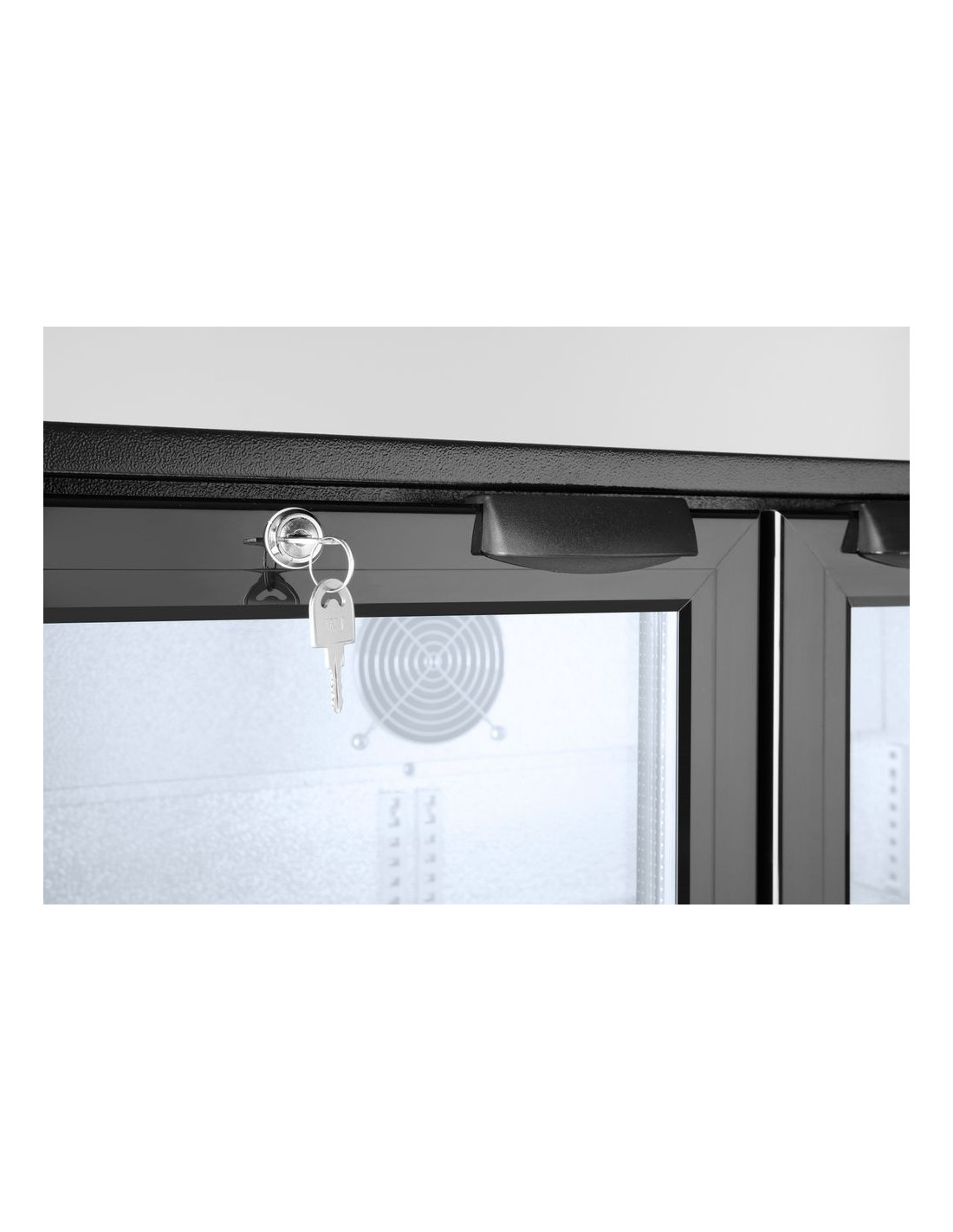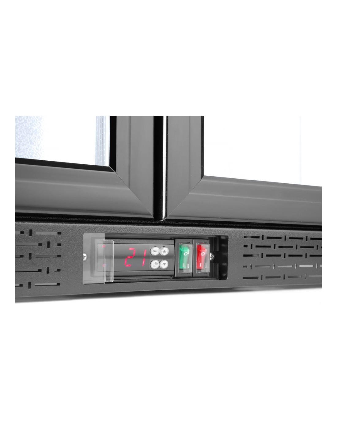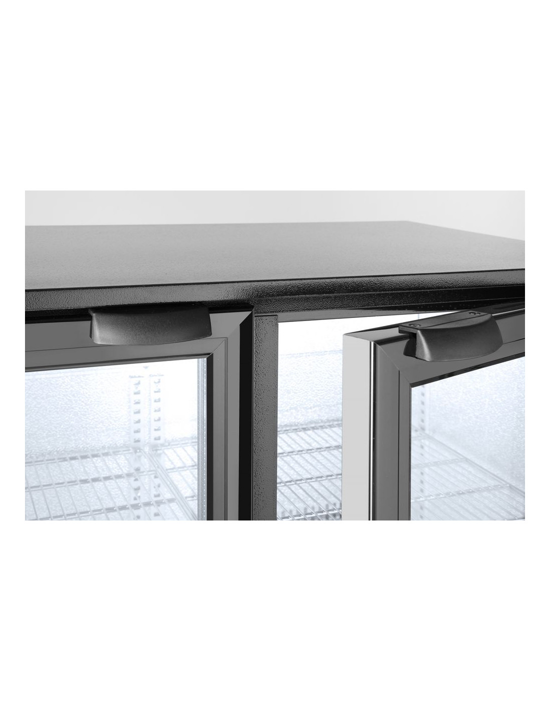 Hölje och kammare tillverkade av svart pulverlackerat stål. Självstängande dörrar med dubbelglas och plastram. Frontruta av härdat glas. Lås med nyckel. Ventilerad kylning. Automatisk avfrostning. Enhet placerad under kammaren. Temperaturområde: 0-10 °C. Kammare utrustad med LED-belysning. Elektronisk kontrollpanel med digital temperaturdisplay. 4 justerbara halkfria fötter.