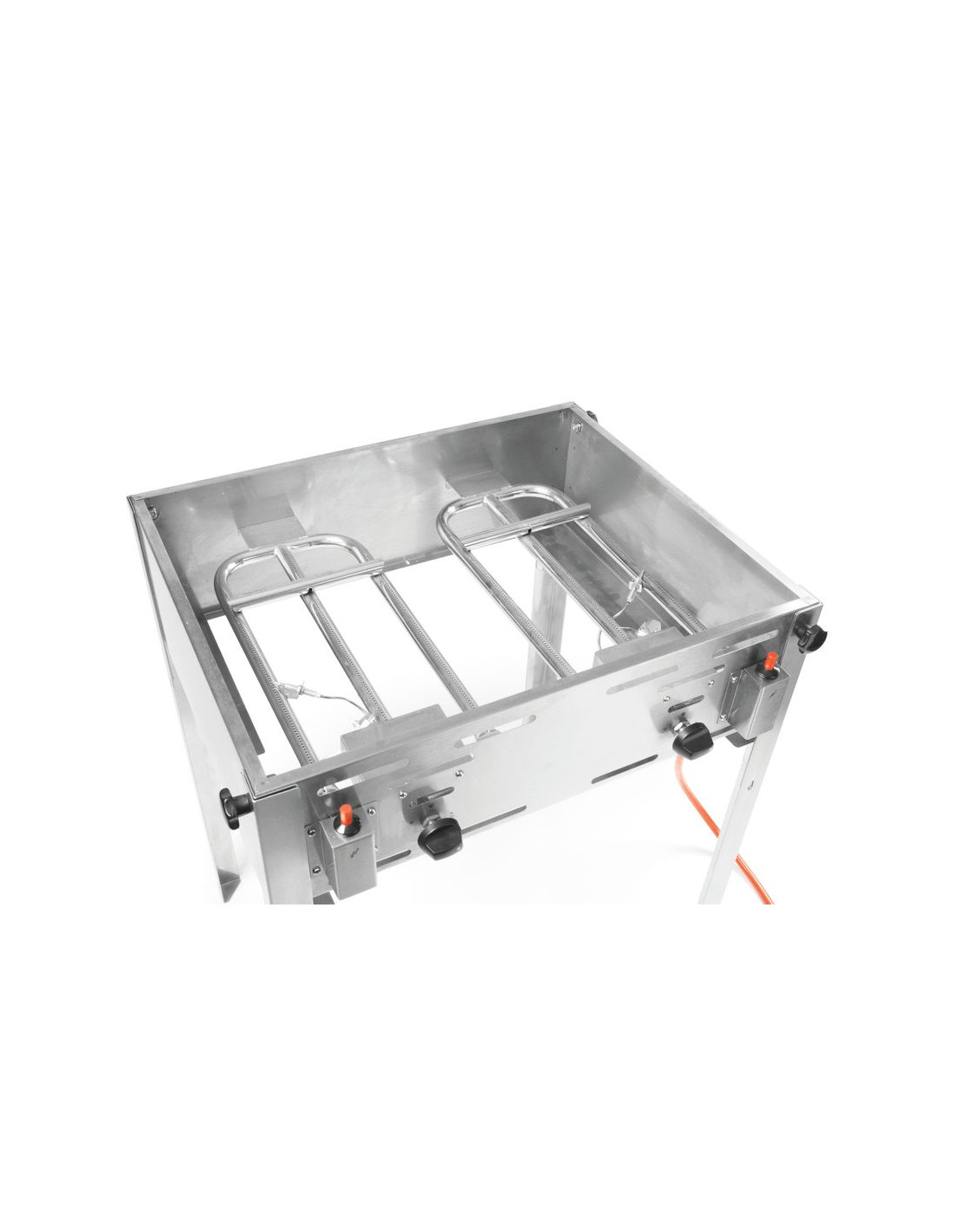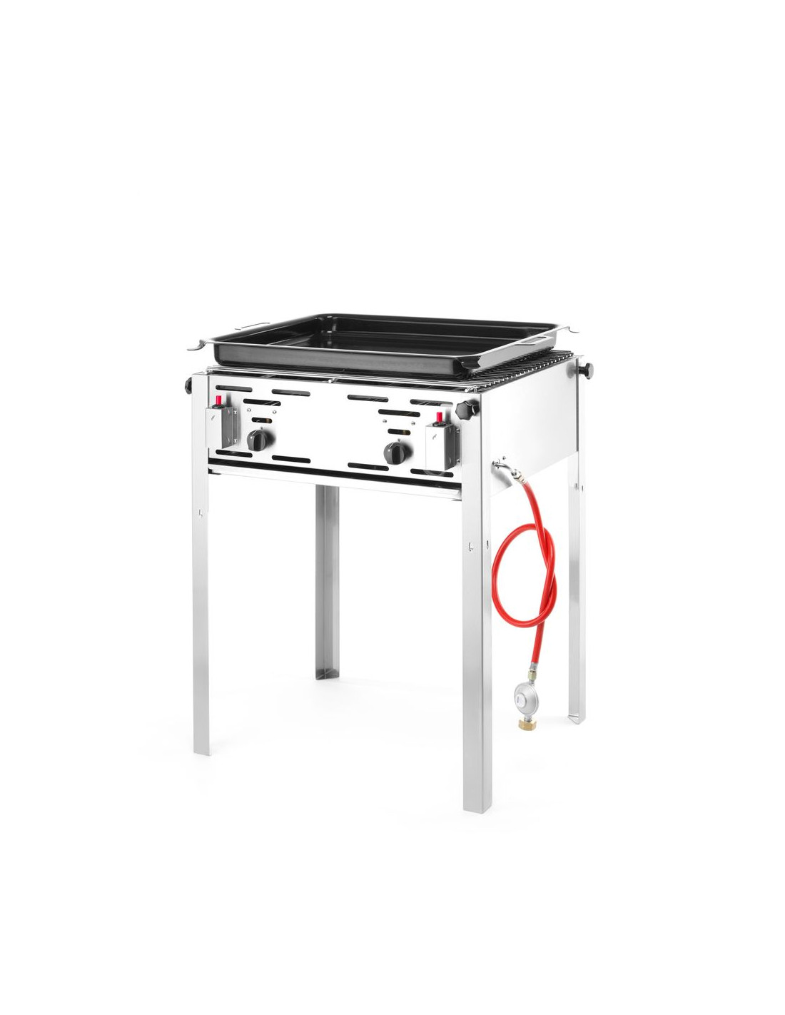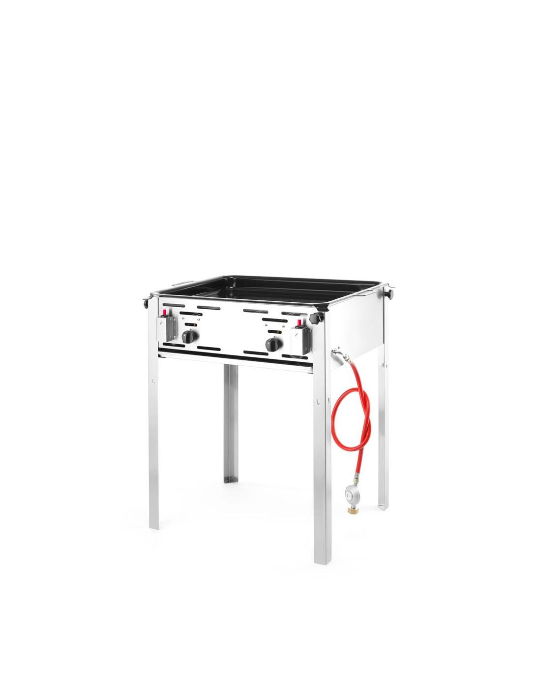 Ram av rostfritt stål 18/0. Med förkromat galler och emaljerad stekpanna. Stekpannans innermått: 590x480x(H)55 mm. Elektronisk tändning och termoelement. Gasslang och tryckregulator ingår. Lämplig för propan och butangas. Förbrukning 0,430 m³/h.