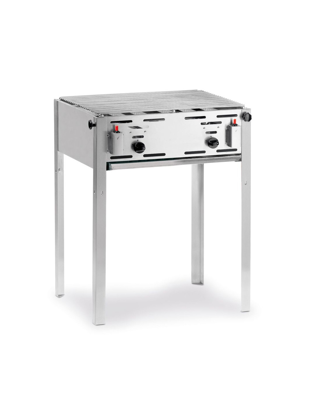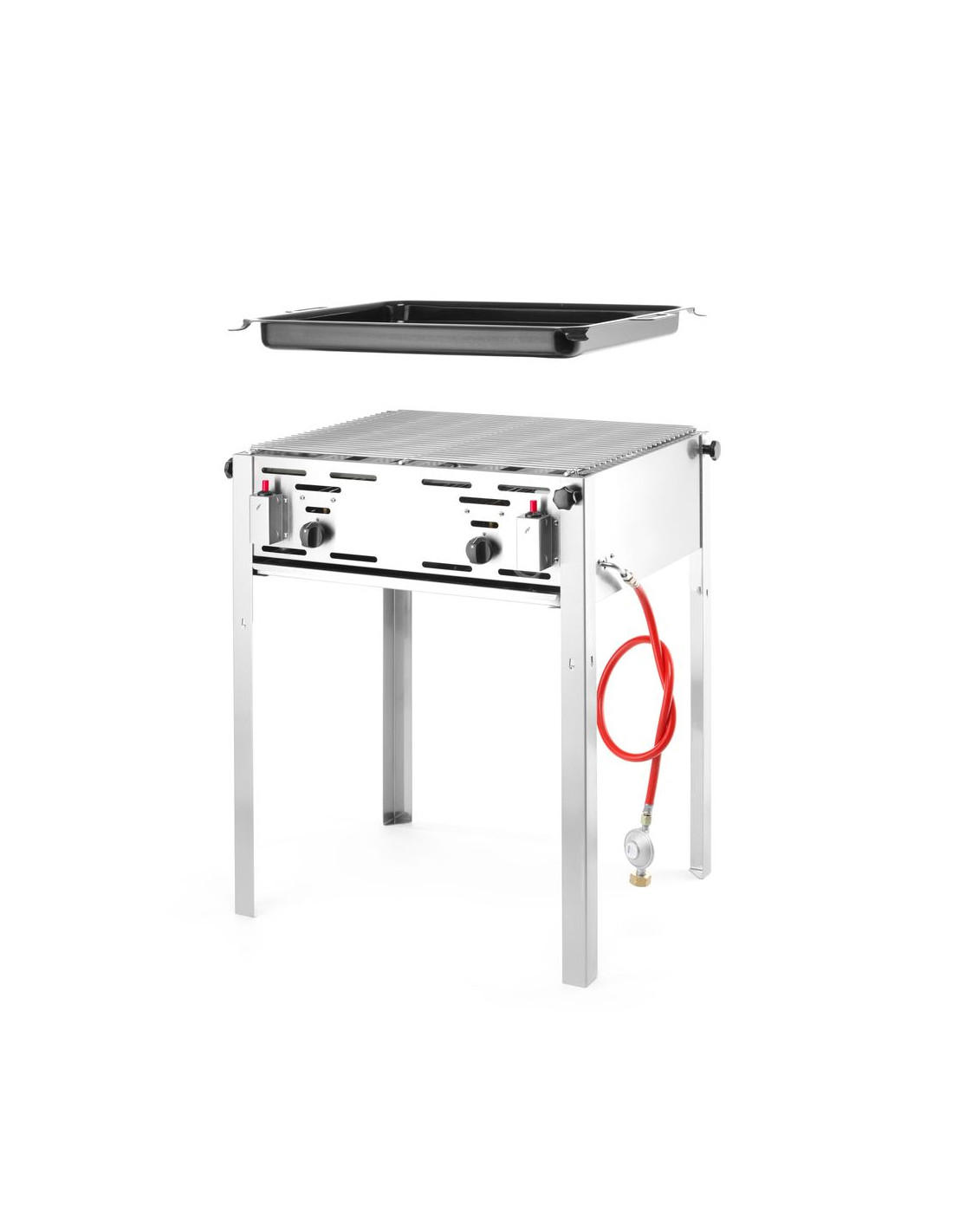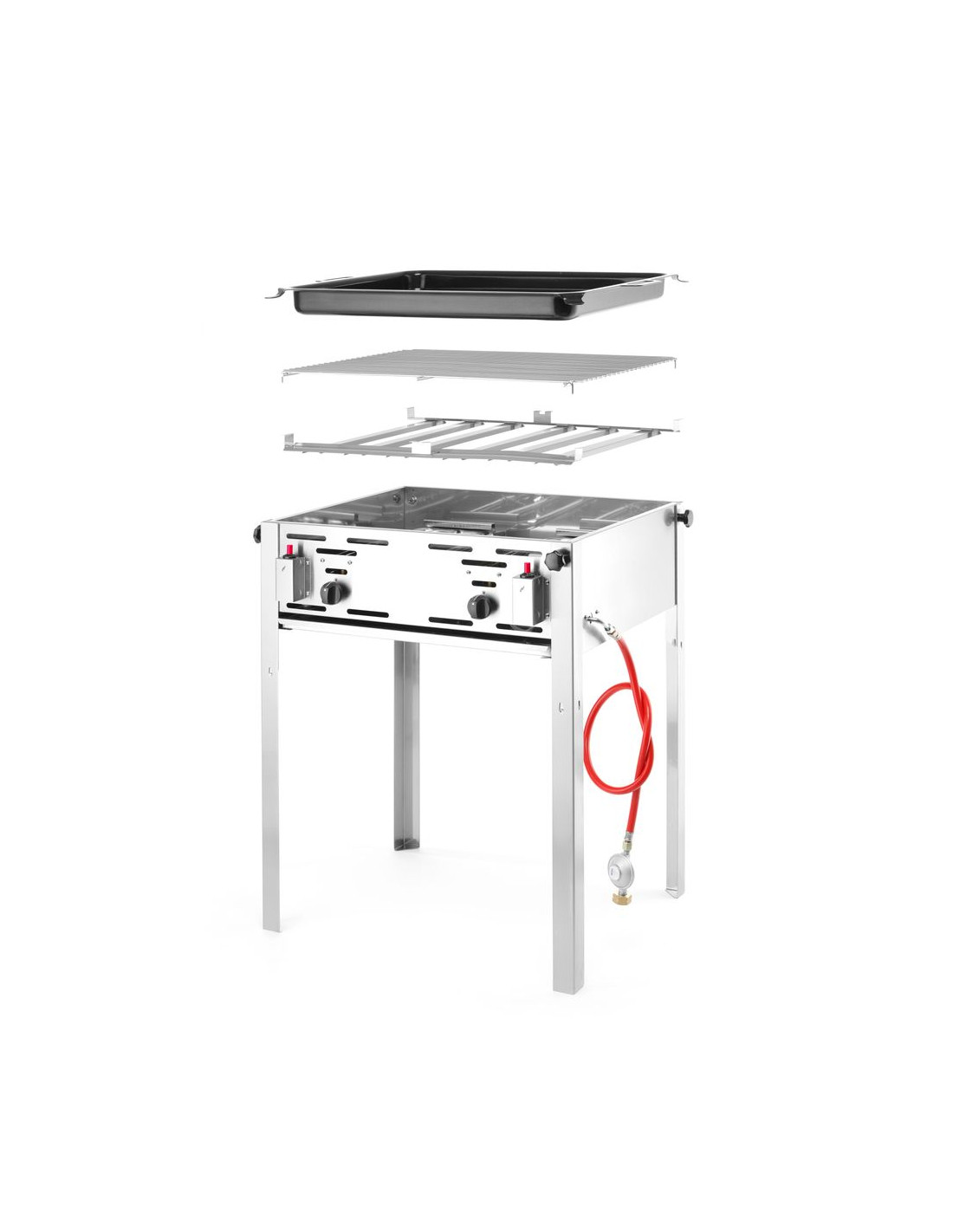 Ram av rostfritt stål 18/0. Med förkromat galler och emaljerad stekpanna. Stekpannans innermått: 590x480x(H)55 mm. Elektronisk tändning och termoelement. Gasslang och tryckregulator ingår. Lämplig för propan och butangas. Förbrukning 0,430 m³/h.