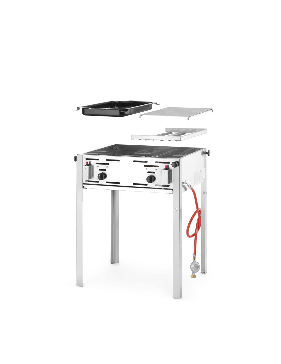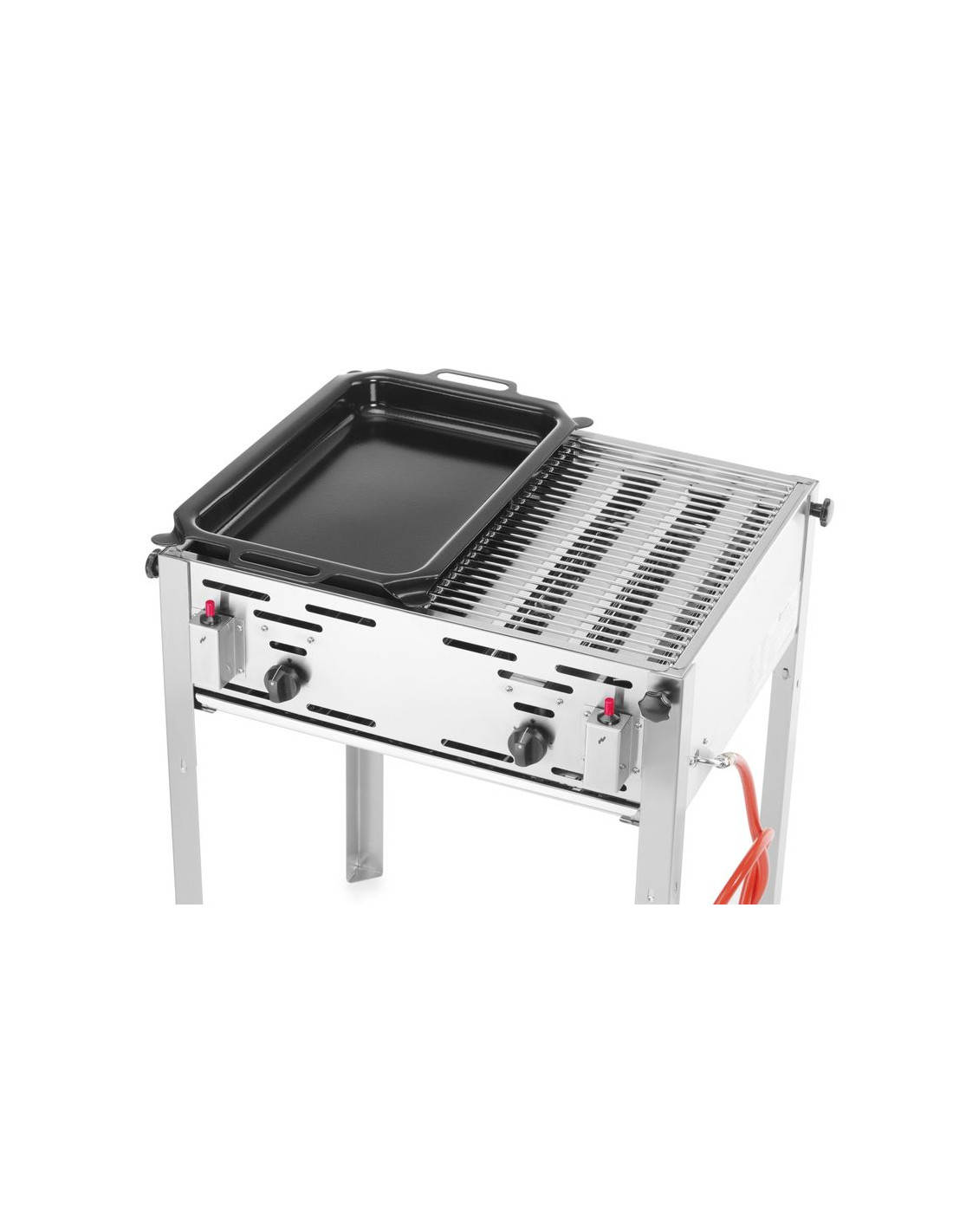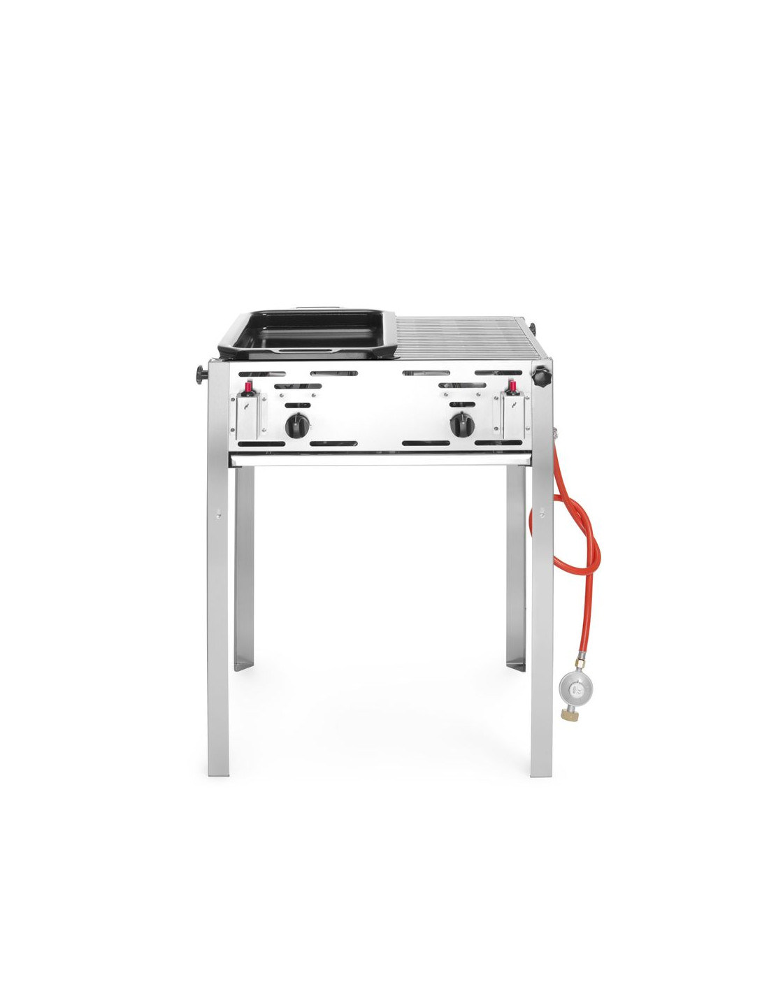 Ram tillverkad av rostfritt stål. Dubbel yta: hälften rostfritt stålgrill, hälften emaljerad stekpanna. Mått på stekpanna: 603x360x(H)60 mm. Mått på stekpanna: 290x480 mm. Piezoelektrisk tändning. Gasslang och tryckregulator ingår.