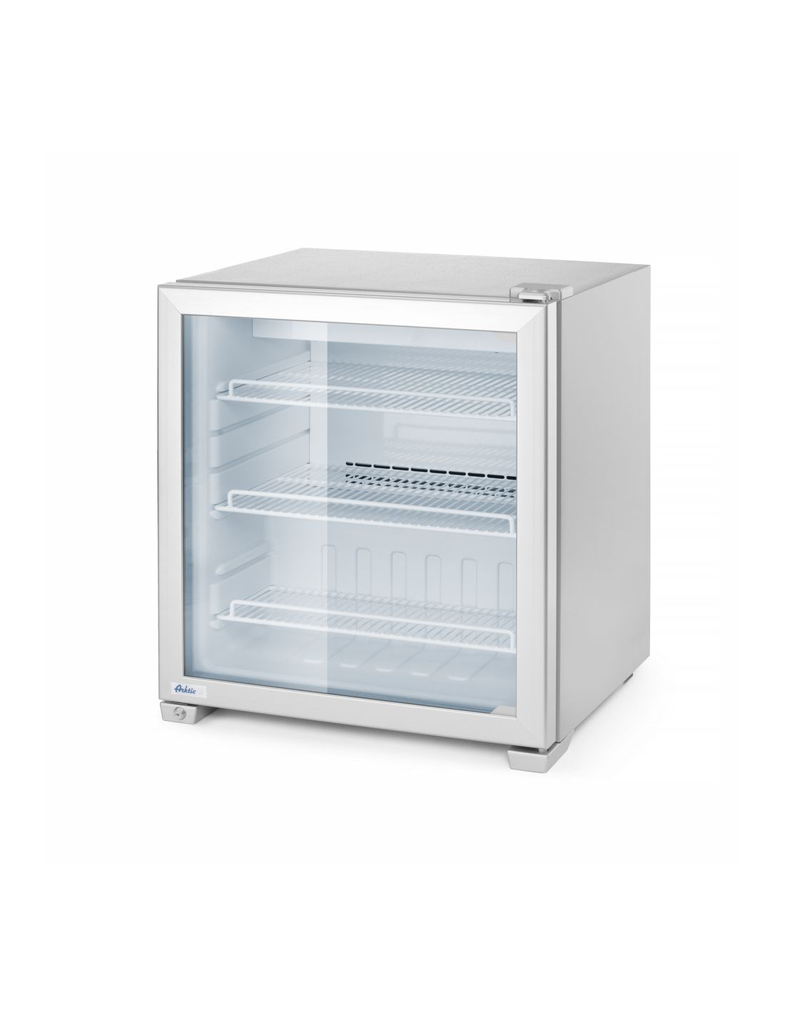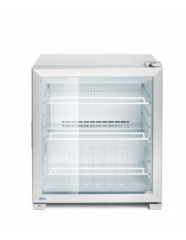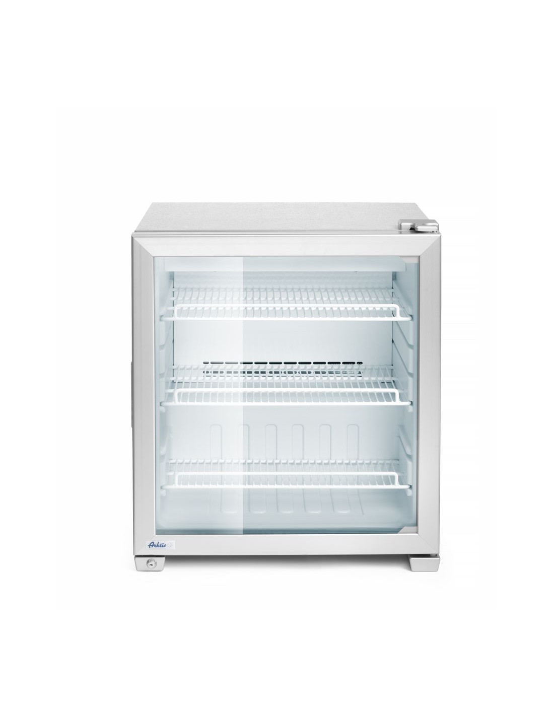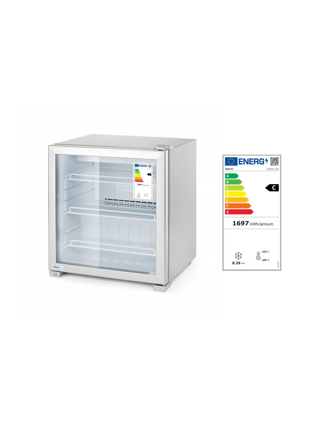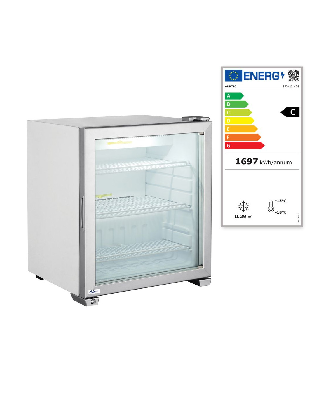 Kompakt frys med transparent trippelglasdörr. Dörren tål imbildning tack vare ett integrerat värmeelement.