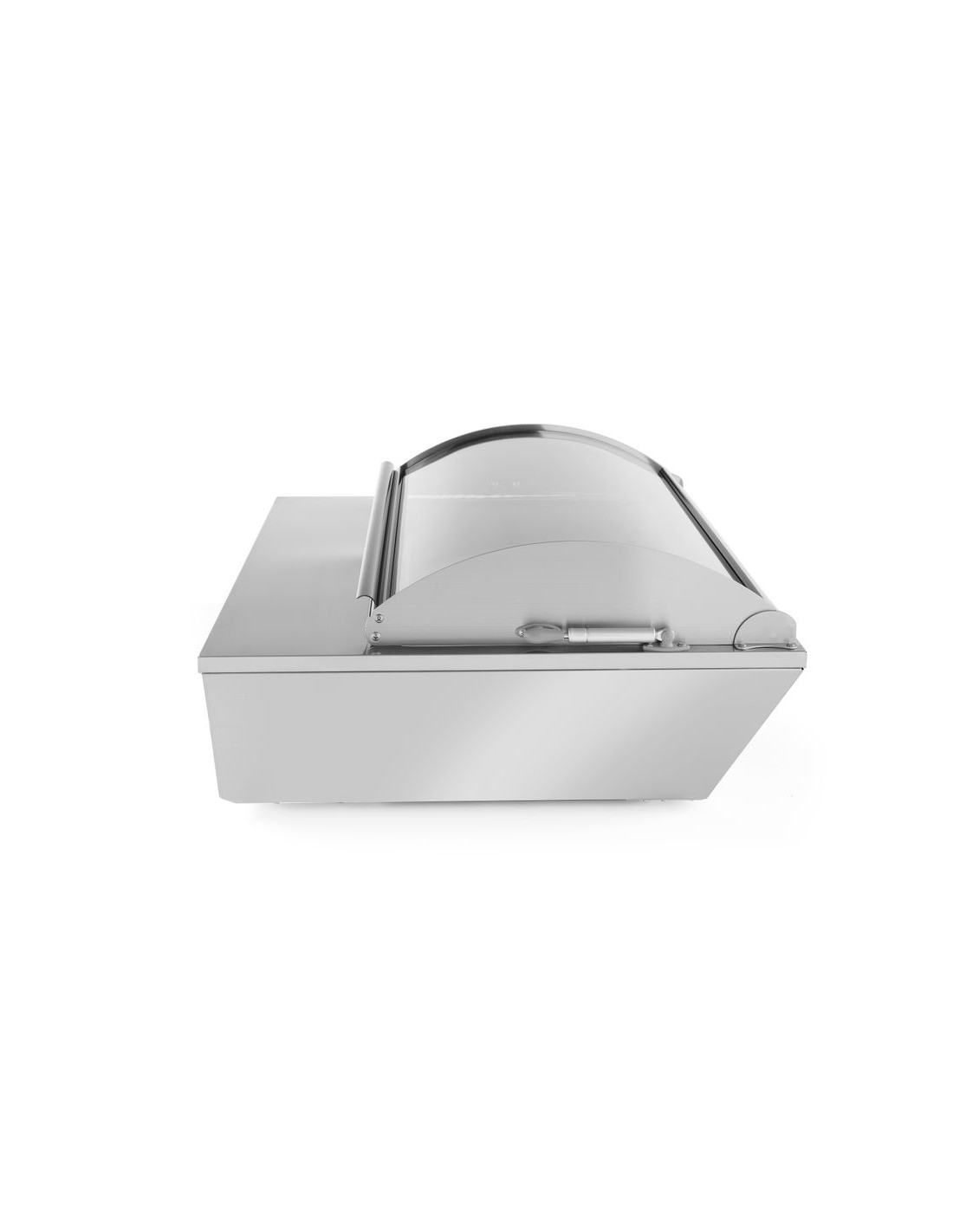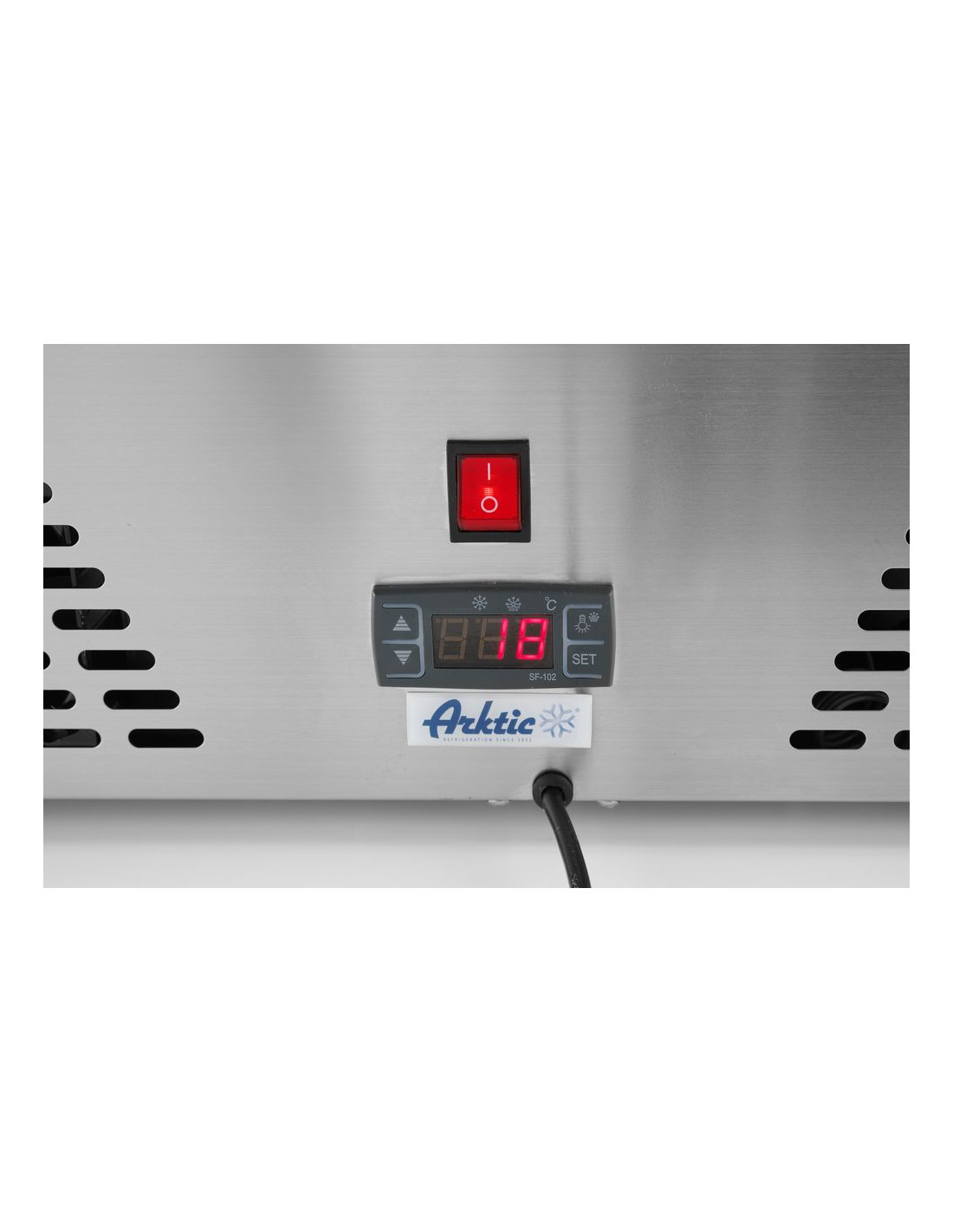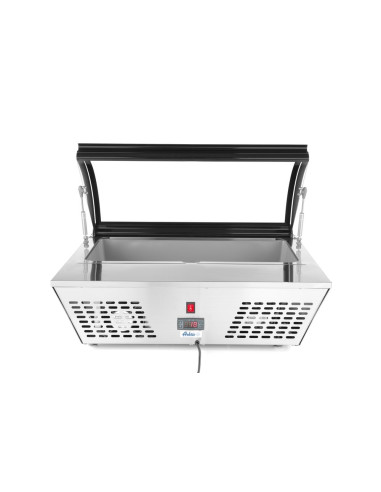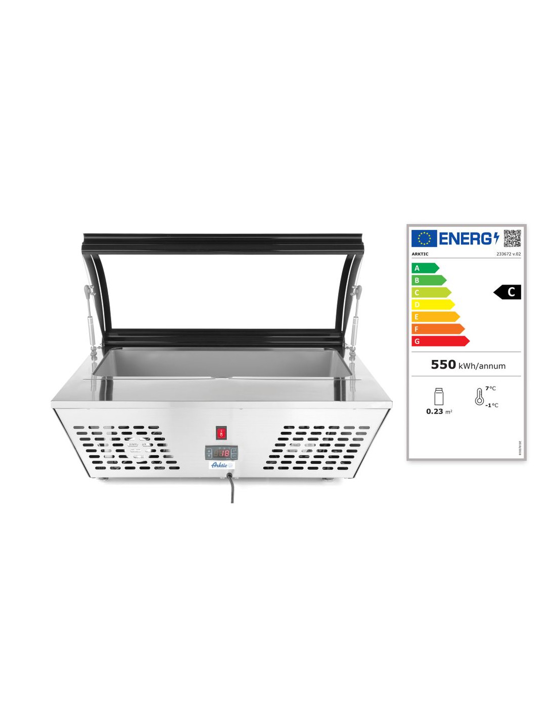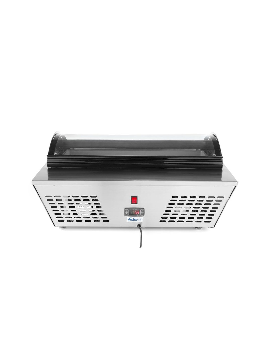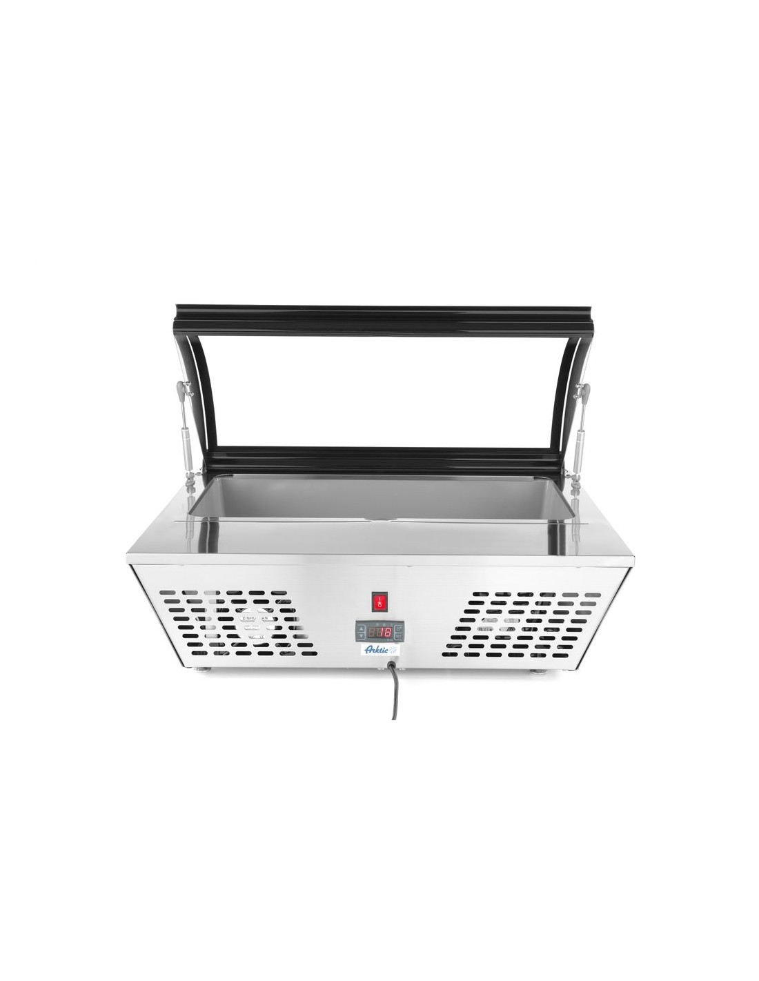 Kropp av högkvalitativt rostfritt stål, försedd med böjt glaslock med enkelt öppningssystem. Forcerad luftkylning med automatisk avfrostning, kompressor placerad bredvid kammaren. Passar 8x GN 1/6 GN-behållare eller 4x GN 1/3-behållare (maxhöjd 100 mm), ingår ej. Med 4 justerbara fötter i rostfritt stål. Digital temperaturregulator och display. Köldmedium: R600a. Klimatklass: 4. Energimärkning: C.
